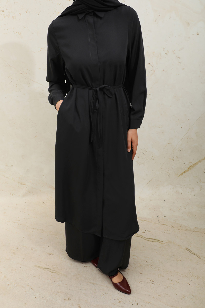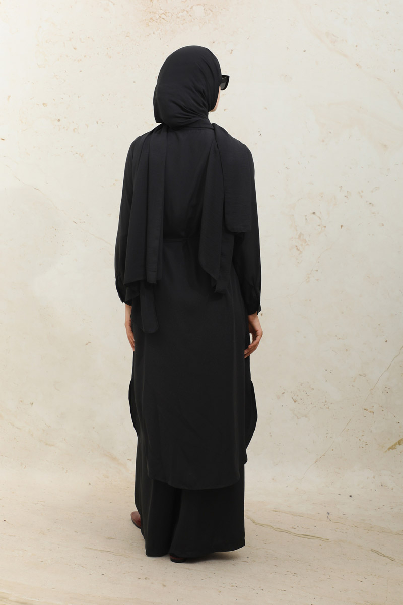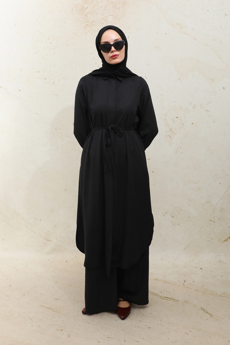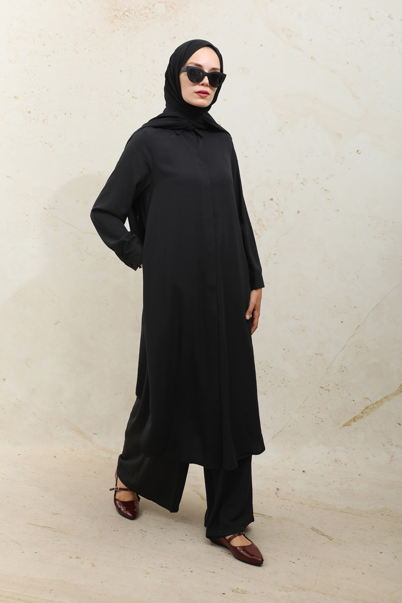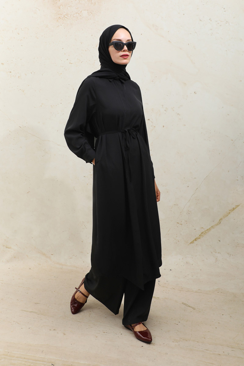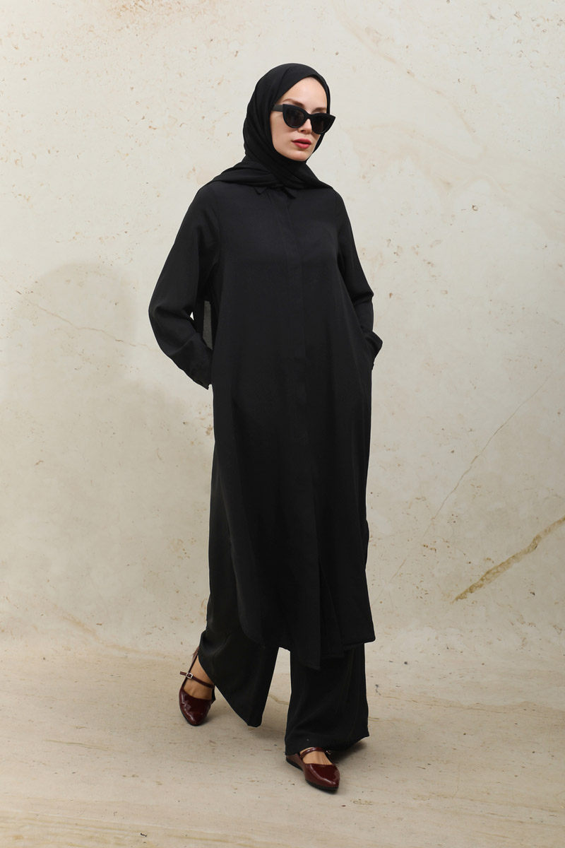 Medine İpeği Tunik Takım Siyah. Gizli düğmelidir. Yandan ceplidir. Yandan yırtmaç detaylıdır. Manşeti düğmelidir. Pantolon beli lastiklidir. Yandan ceplidir. Beli ince biyelidir. Günlük kullanım ve özel günlerinizde tercih edebilirsiniz.