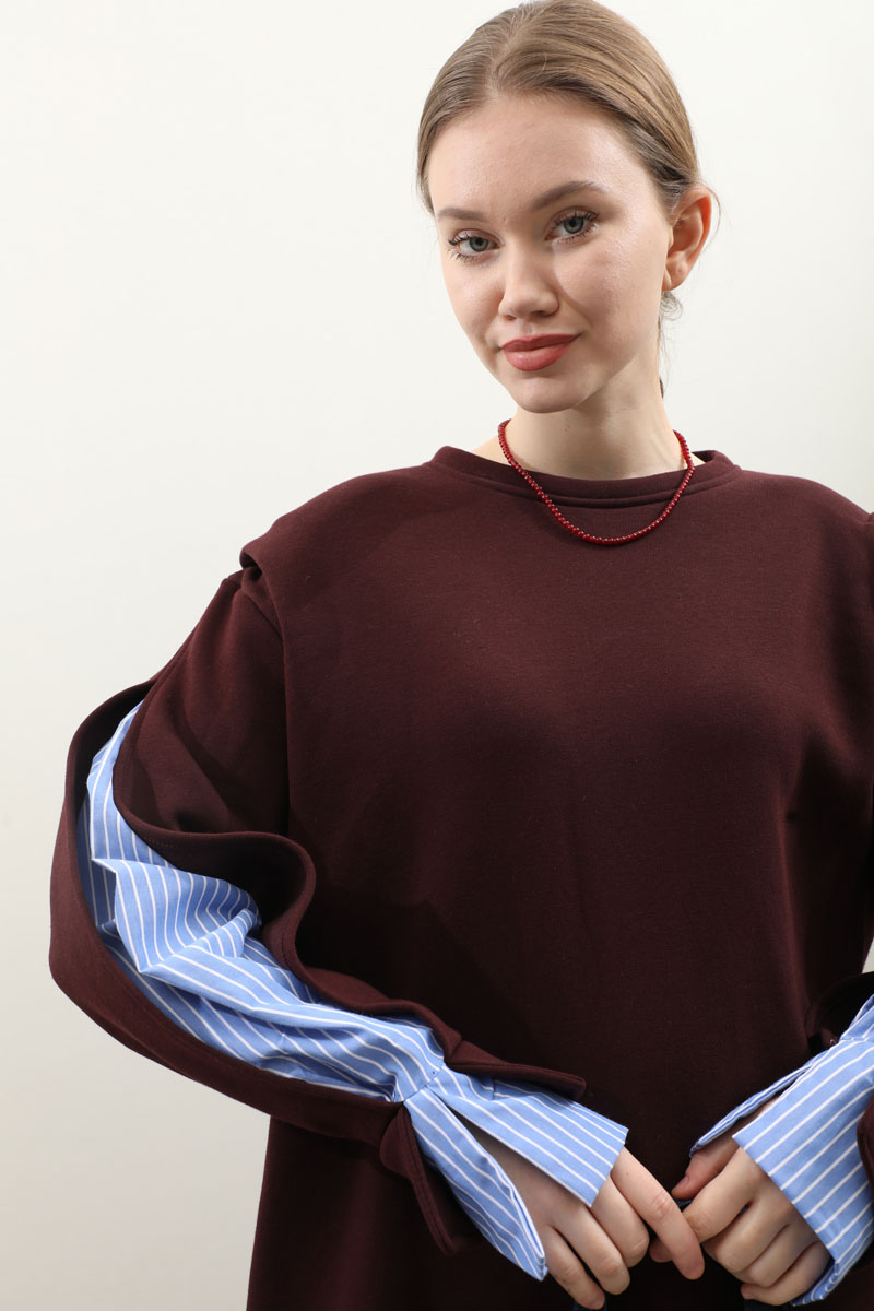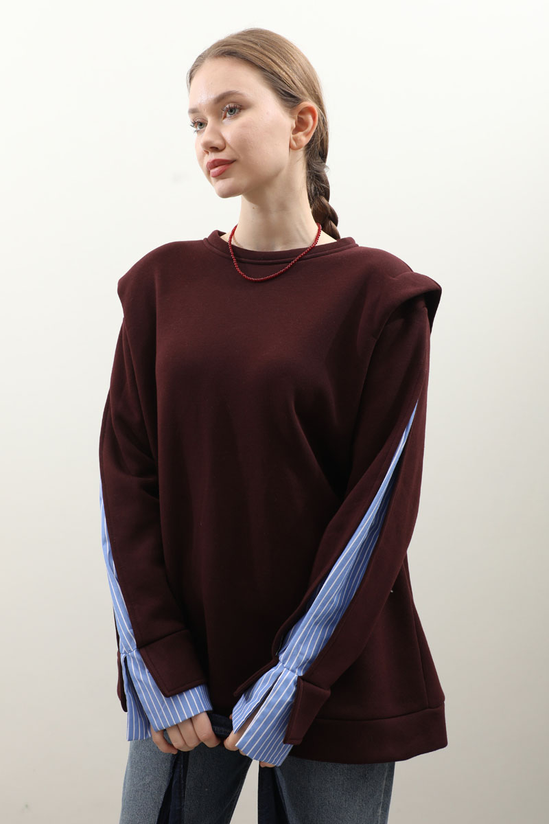 Gömlek Detaylı Sweat Bordo. Bisiklet yaka, omzu aller detaylı ve vatkalı, kolu yırtmaçlı ve yırtmaç içinde çizgili gömlek kol gelmektedir. İçi polarlıdır. Kış mevsimi için uygundur.