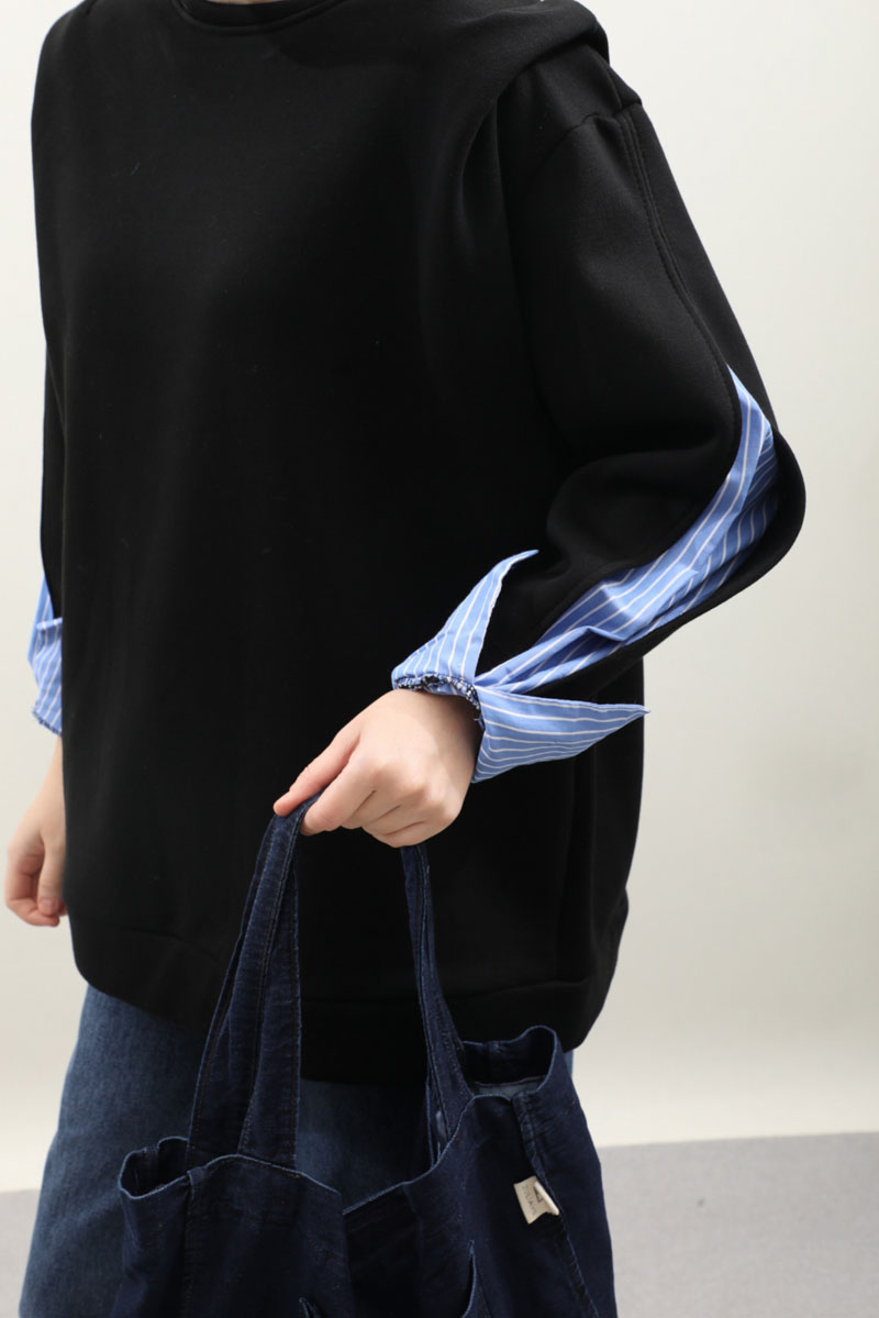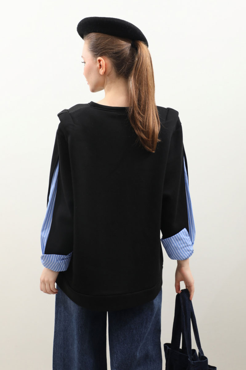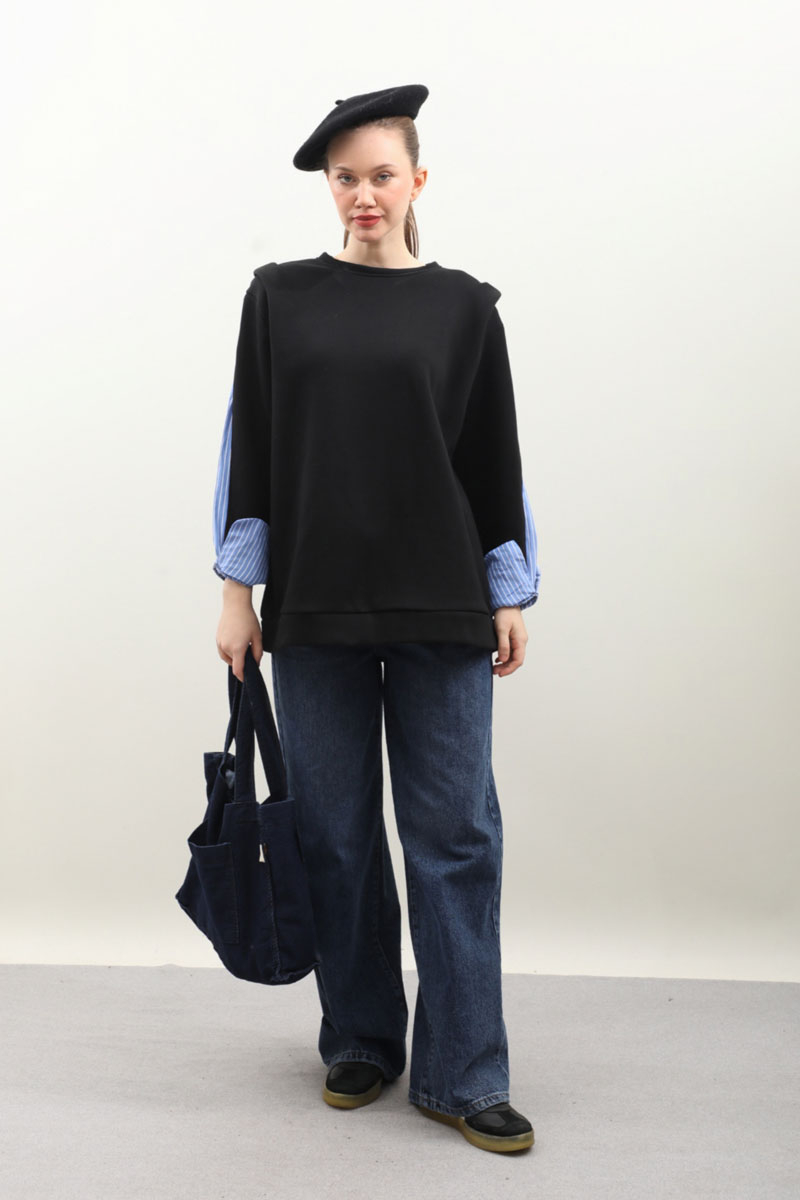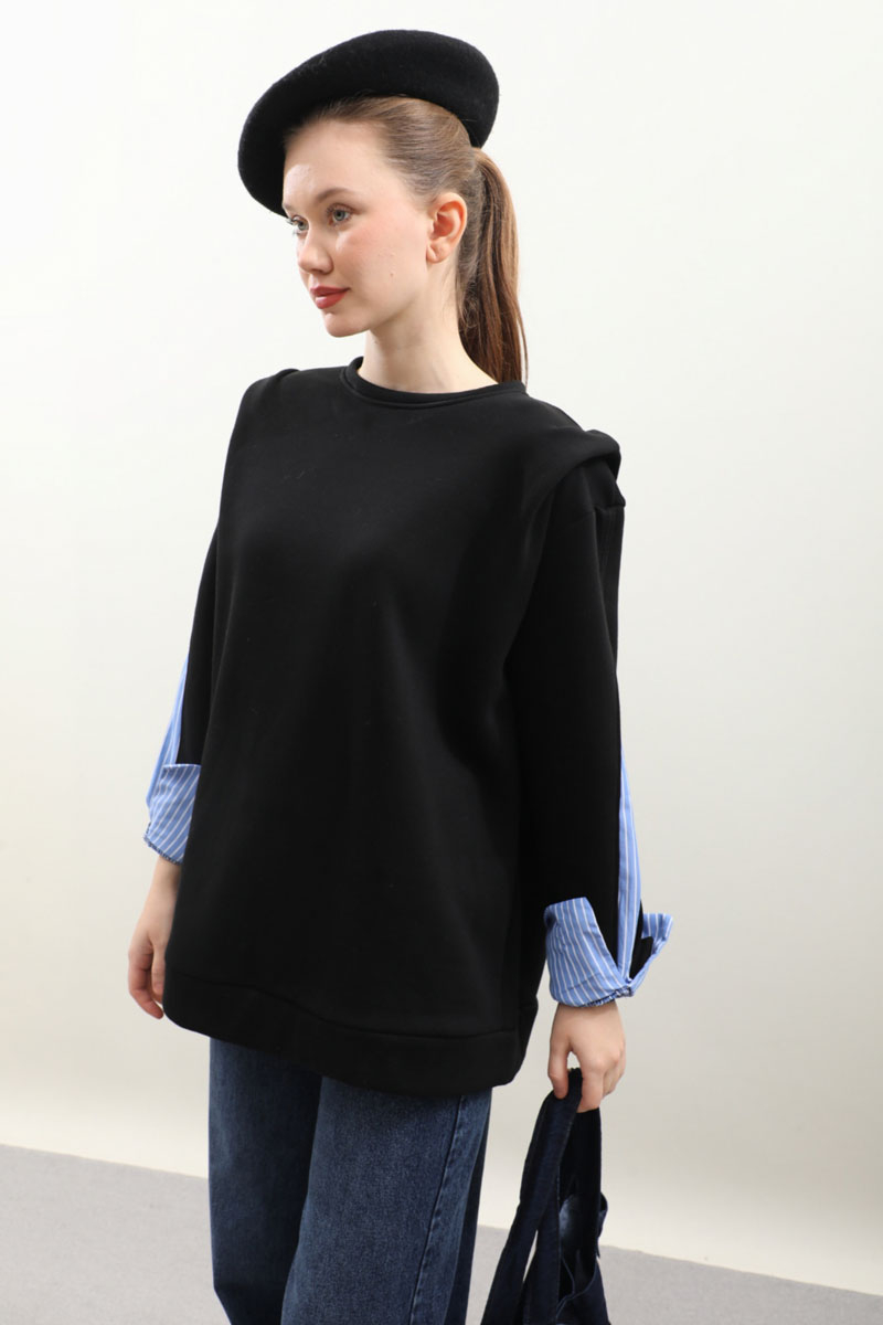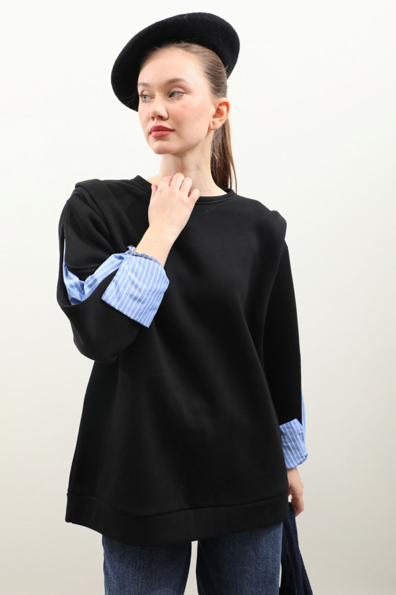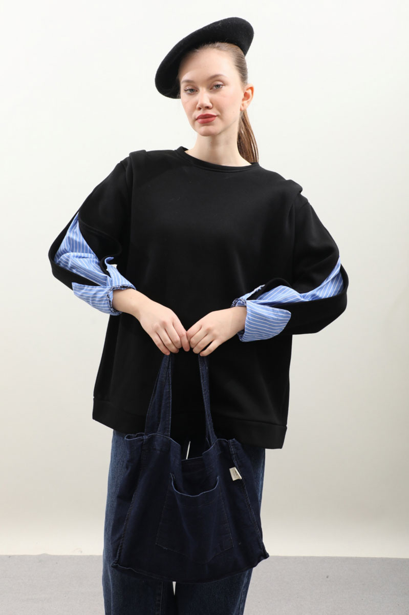 Gömlek Detaylı Sweat Siyah. Bisiklet yaka, omzu aller detaylı ve vatkalı, kolu yırtmaçlı ve yırtmaç içinde çizgili gömlek kol gelmektedir. İçi polarlıdır. Kış mevsimi için uygundur.