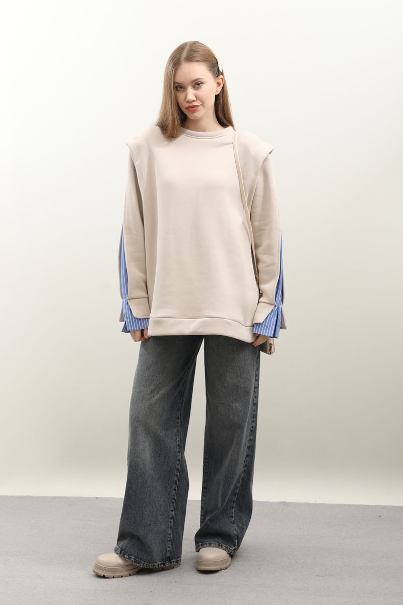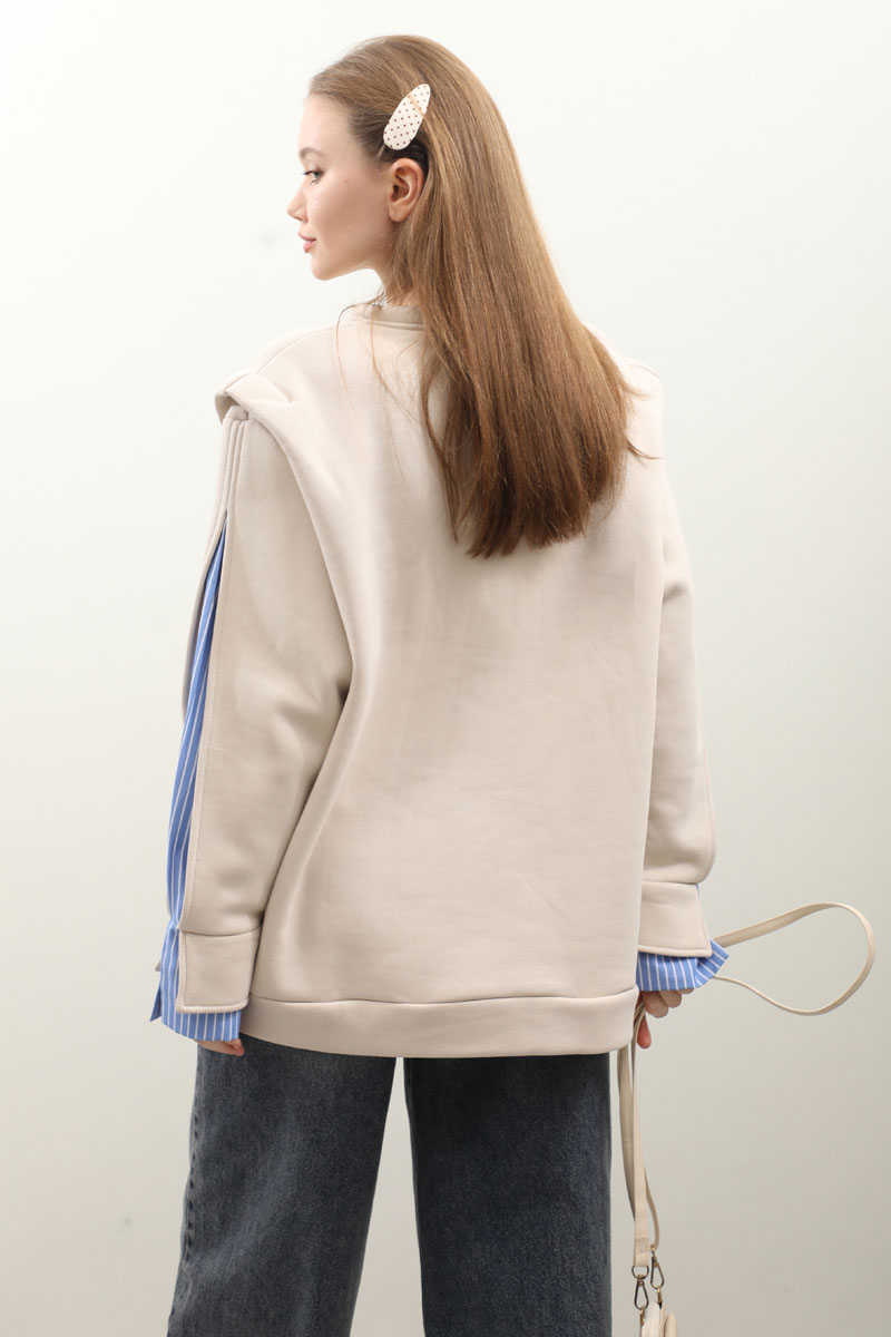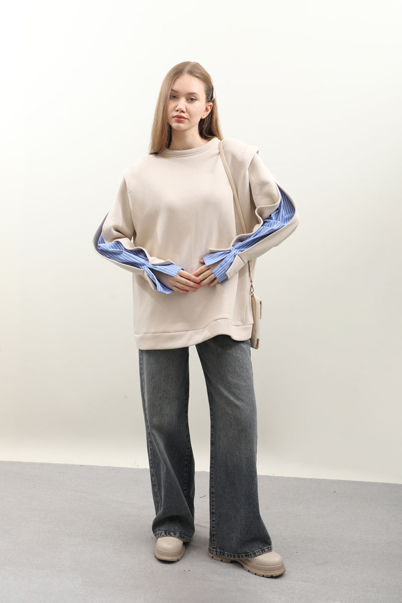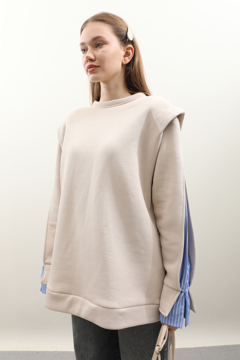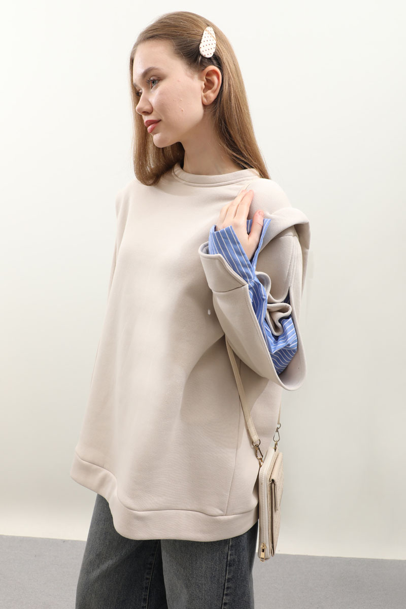 Gömlek Detaylı Sweat Taş. Bisiklet yaka, omzu aller detaylı ve vatkalı, kolu yırtmaçlı ve yırtmaç içinde çizgili gömlek kol gelmektedir. İçi polarlıdır. Kış mevsimi için uygundur.