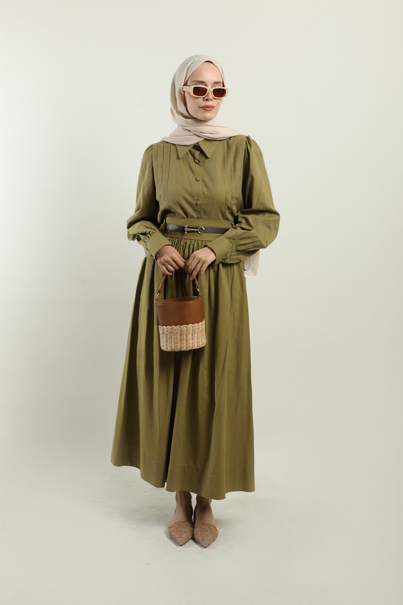 Gömlek Etek Takım Haki. Gömlek yakalıdır, kolları büzgülüdür, ön kısmı nervür detaylıdır. Etek arka kısmı lastiklidir, yandan ceplidir, kemerlidir, astarsızdır. Günlük ve özel günlerde kullanıma uygundur.