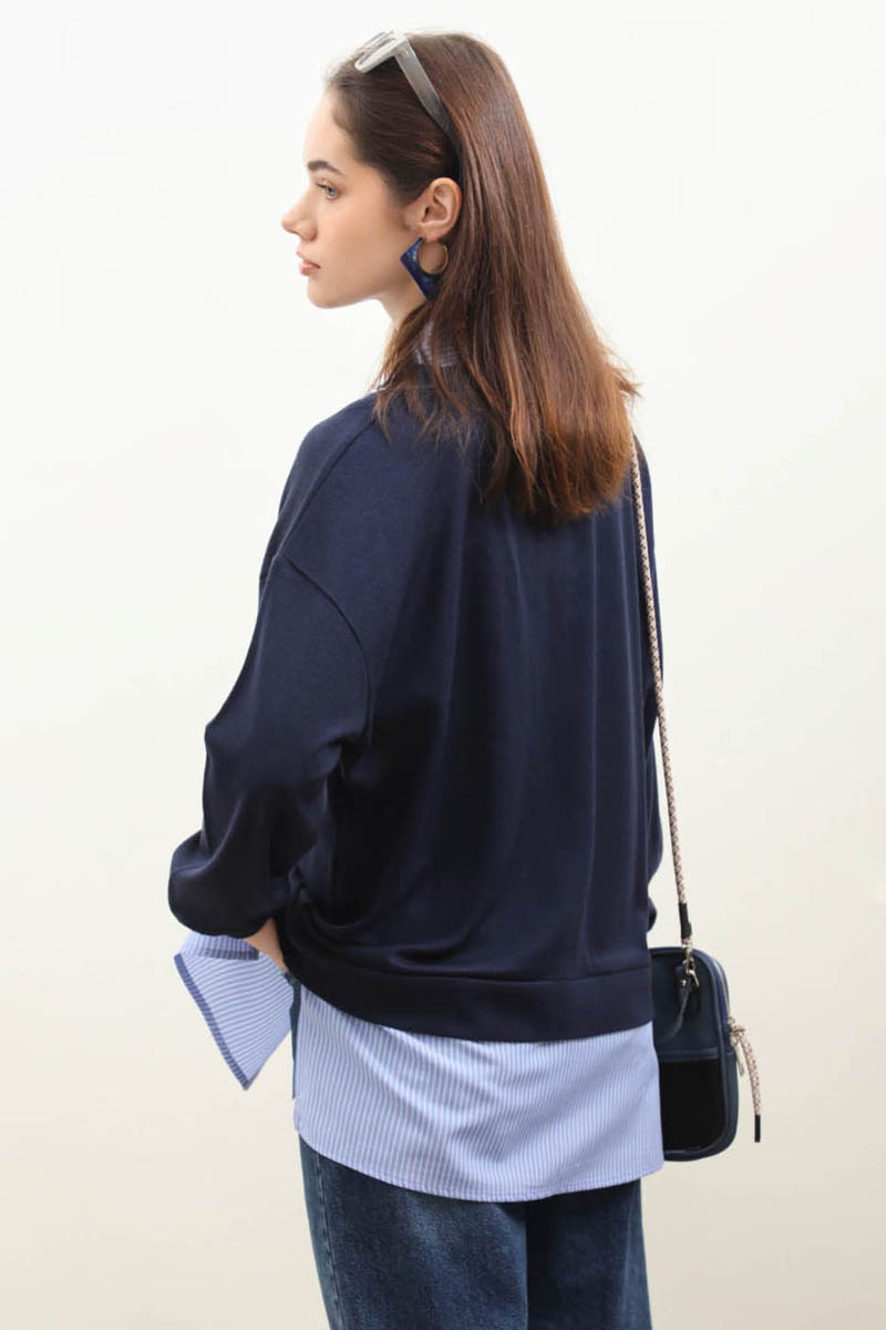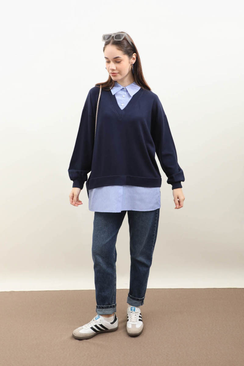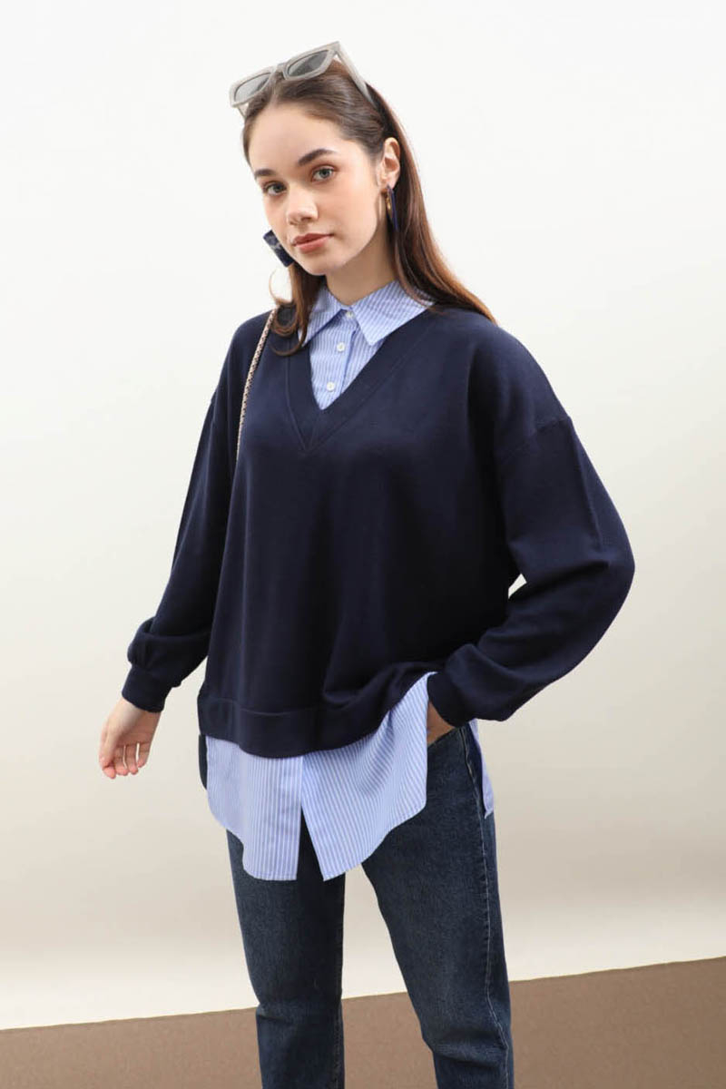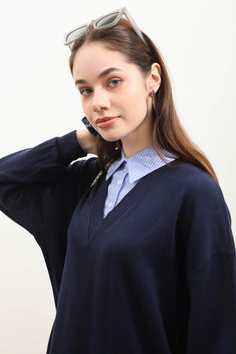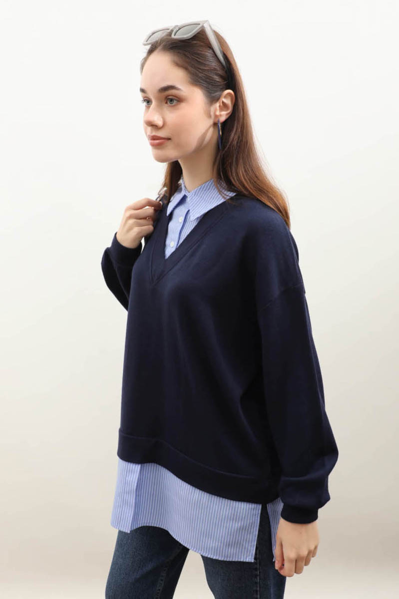 Gömlek Triko Lacivert. Gömlek garnili triko v yakadır, ürün birleşiktir, düşük omuzludur, gömleğin etek ucu yırtmaçlıdır, Günlük kullanım ve özel günlerinizde tercih edebilirsiniz.