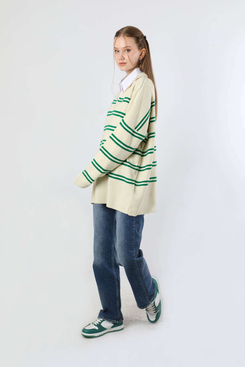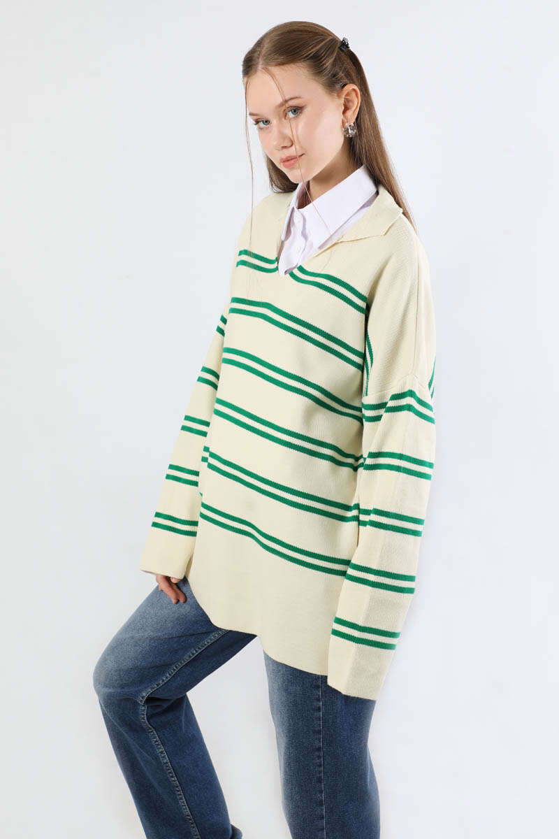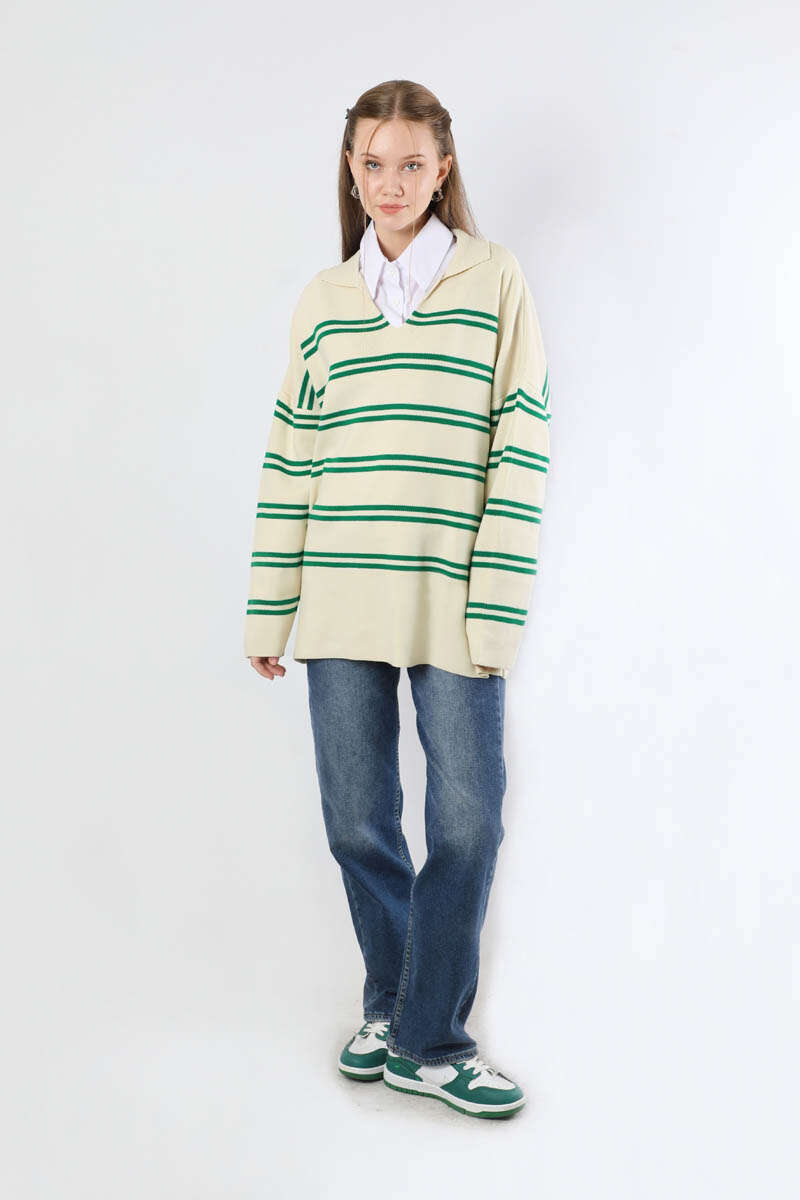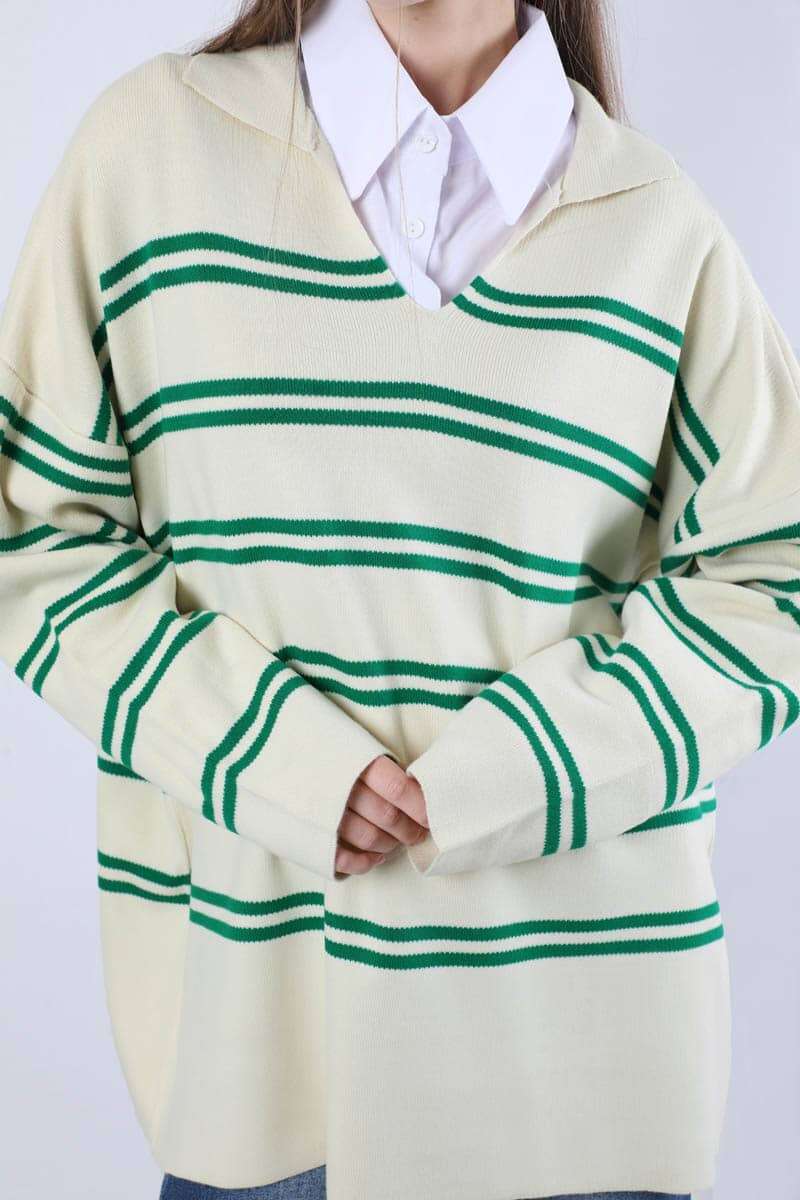 Gömlek Yaka Çizgili Triko Kazak Krem. Gömlek yakalıdır. Düşük omuzludur. Çift çizgi detaylıdır. Günlük kullanım ve özel günlerinizde tercih edebilirsiniz.