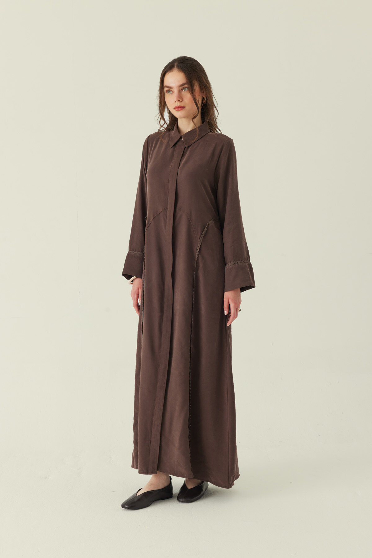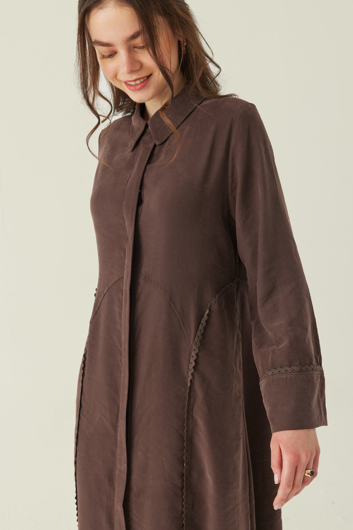 Gömlek Yaka Dantelli Elbise Kahverengi