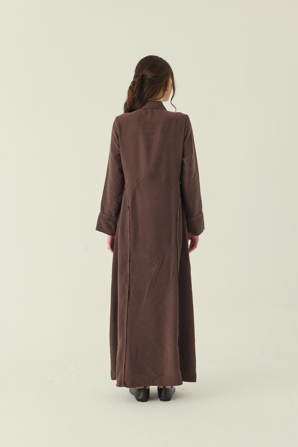 Zarif dikey şerit dantel detaylarıyla sade tasarımına ince bir hareket kazandıran Gömlek Yaka Dantelli Elbise, hem pratik hem de şık bir kullanım sunar. Minimal gizli pat detayı tasarımı daha temiz ve dengeli gösterirken, ferace formu sayesinde rahat bir siluet oluşturur. Günlük kombinlerde “giy çık” konforu sunarken, doğru aksesuarlarla daha şık görünümlere de kolayca uyum sağlar.