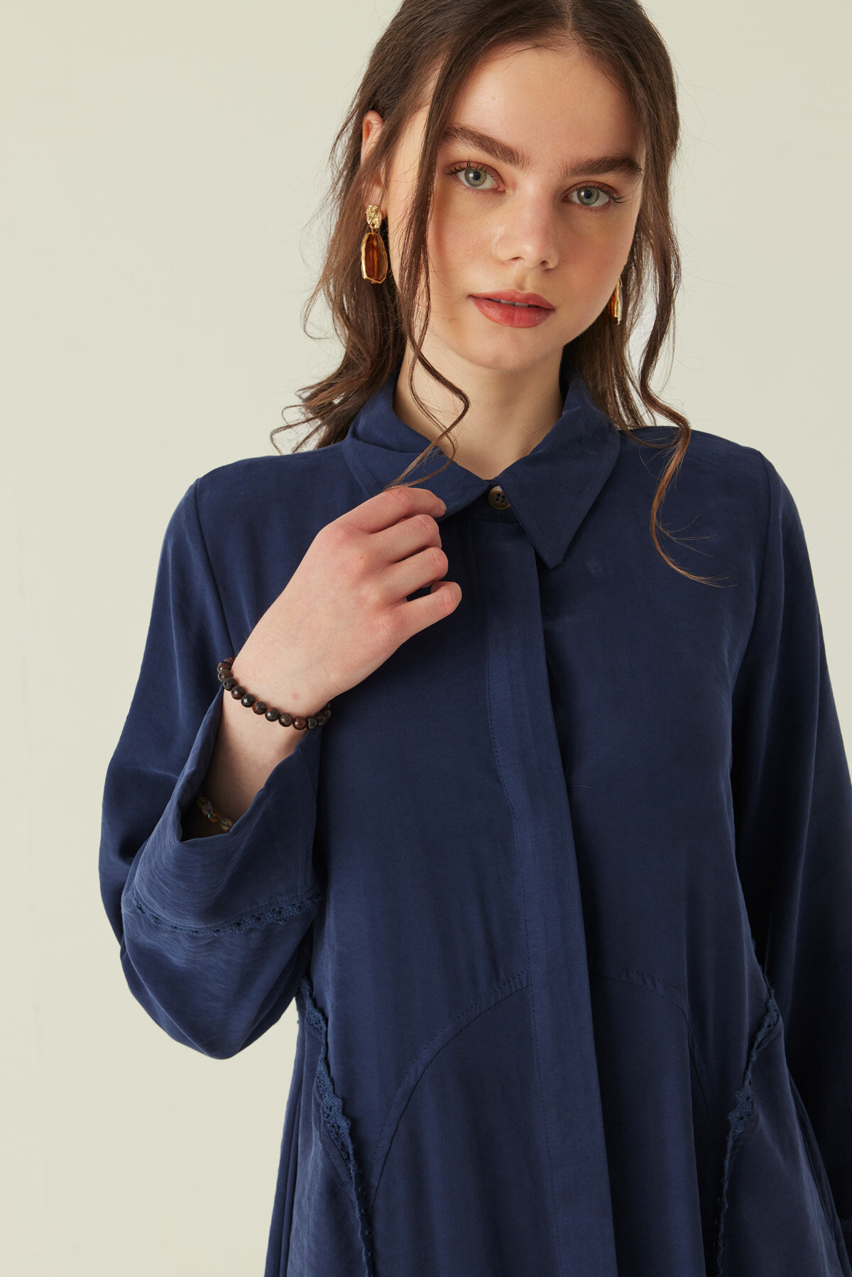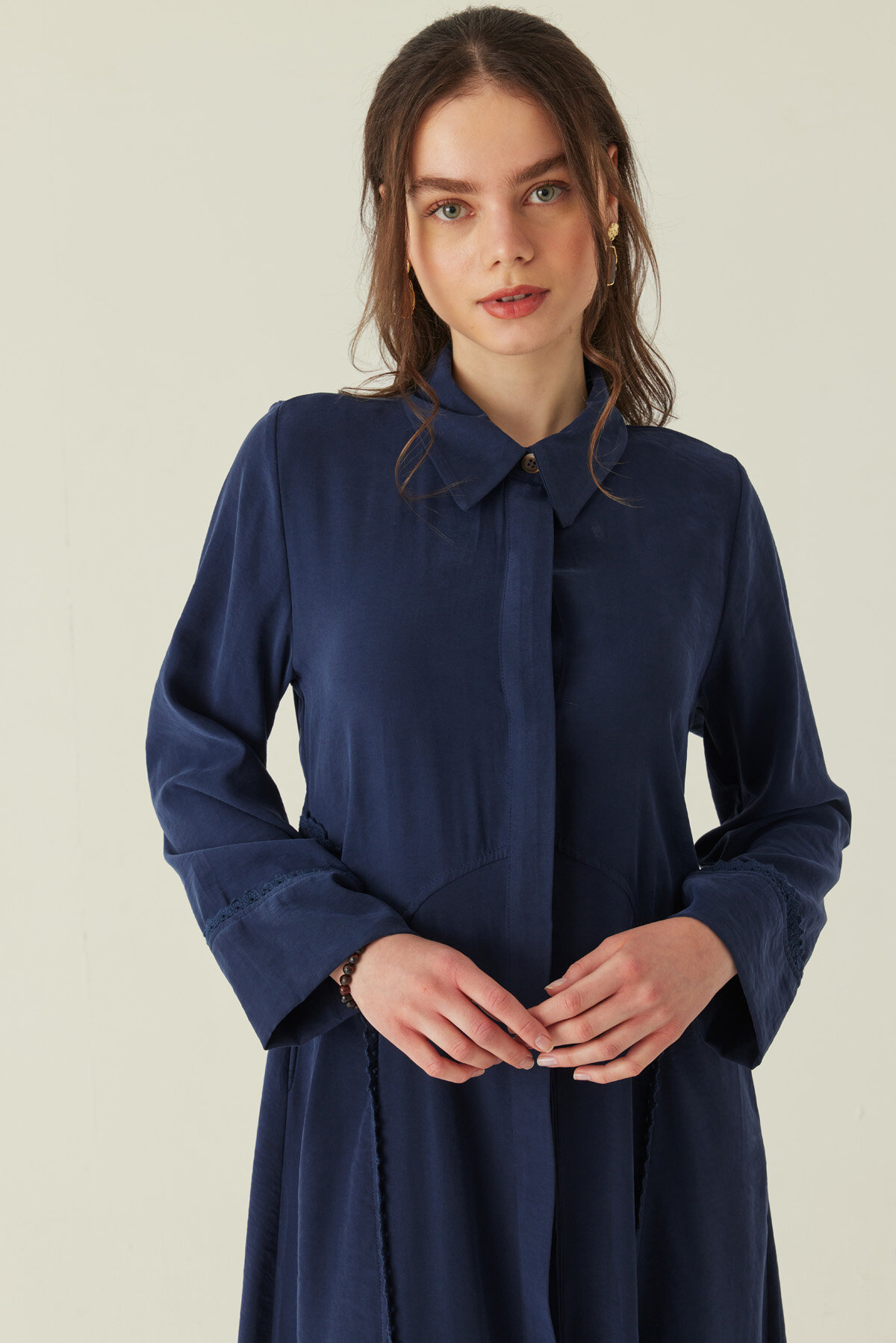 Gömlek Yaka Dantelli Elbise Lacivert