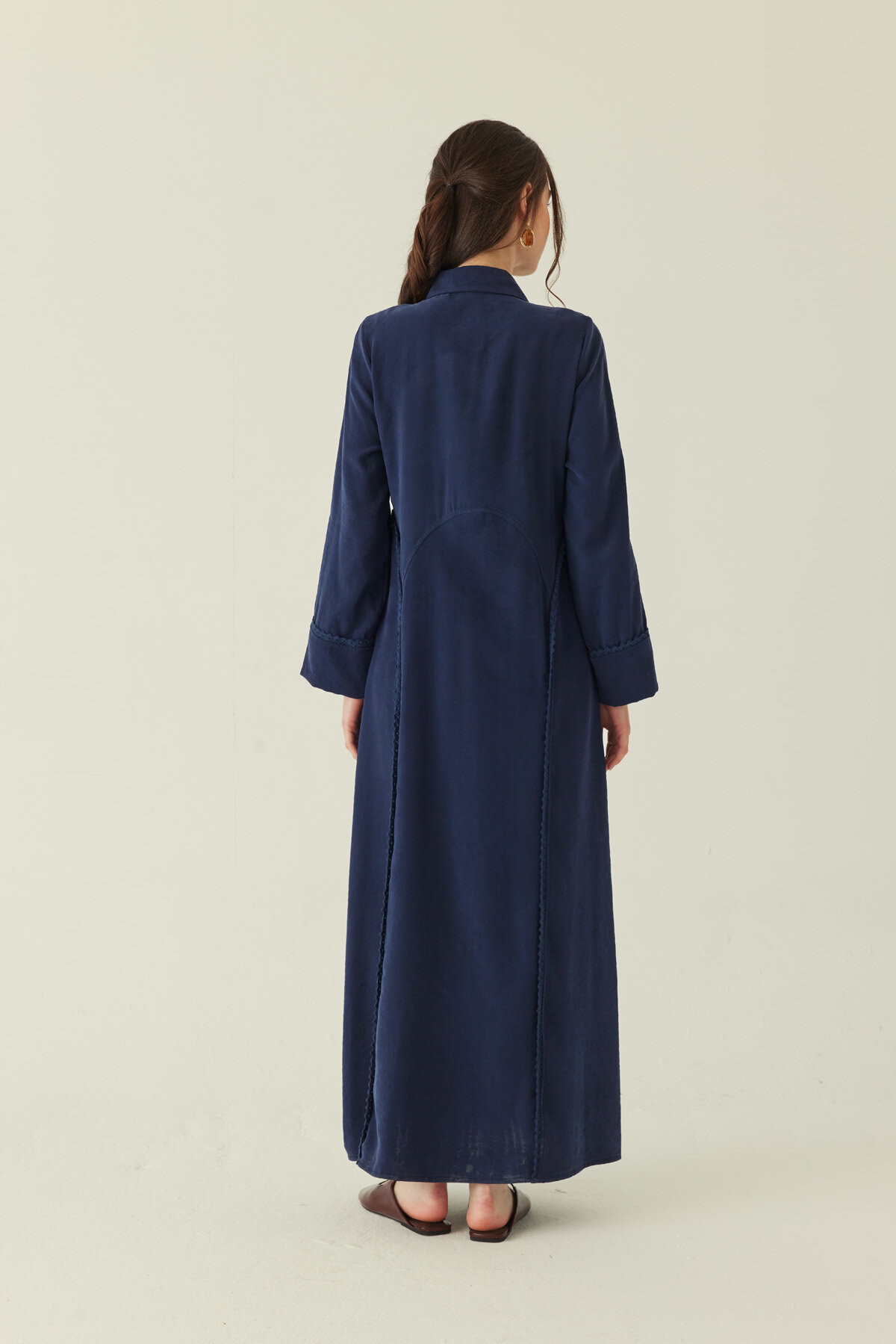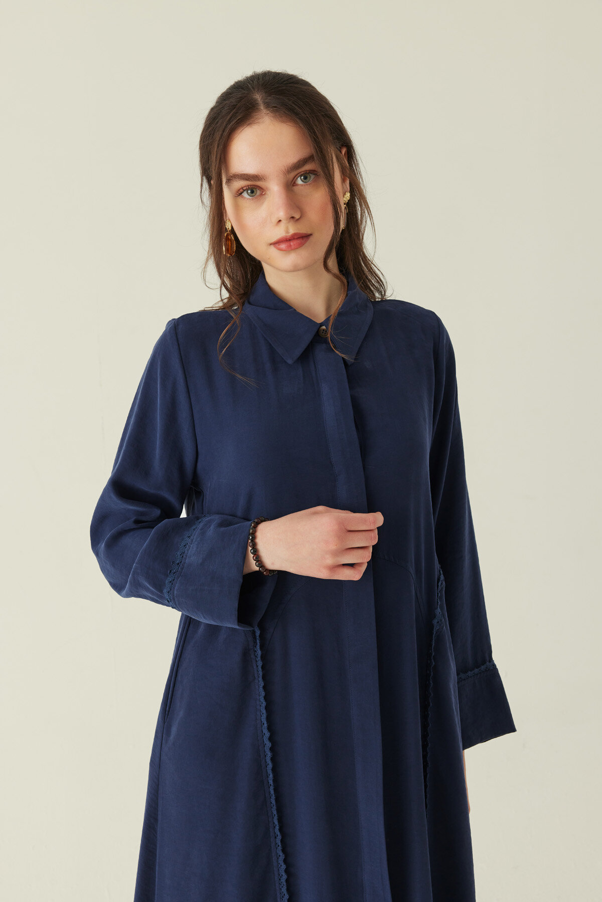 Zarif dikey şerit dantel detaylarıyla sade tasarımına ince bir hareket kazandıran Gömlek Yaka Dantelli Elbise, hem pratik hem de şık bir kullanım sunar. Minimal gizli pat detayı tasarımı daha temiz ve dengeli gösterirken, ferace formu sayesinde rahat bir siluet oluşturur. Günlük kombinlerde “giy çık” konforu sunarken, doğru aksesuarlarla daha şık görünümlere de kolayca uyum sağlar.