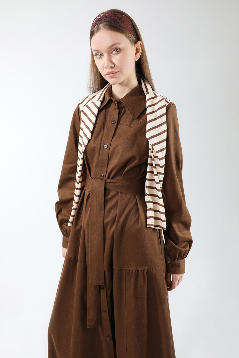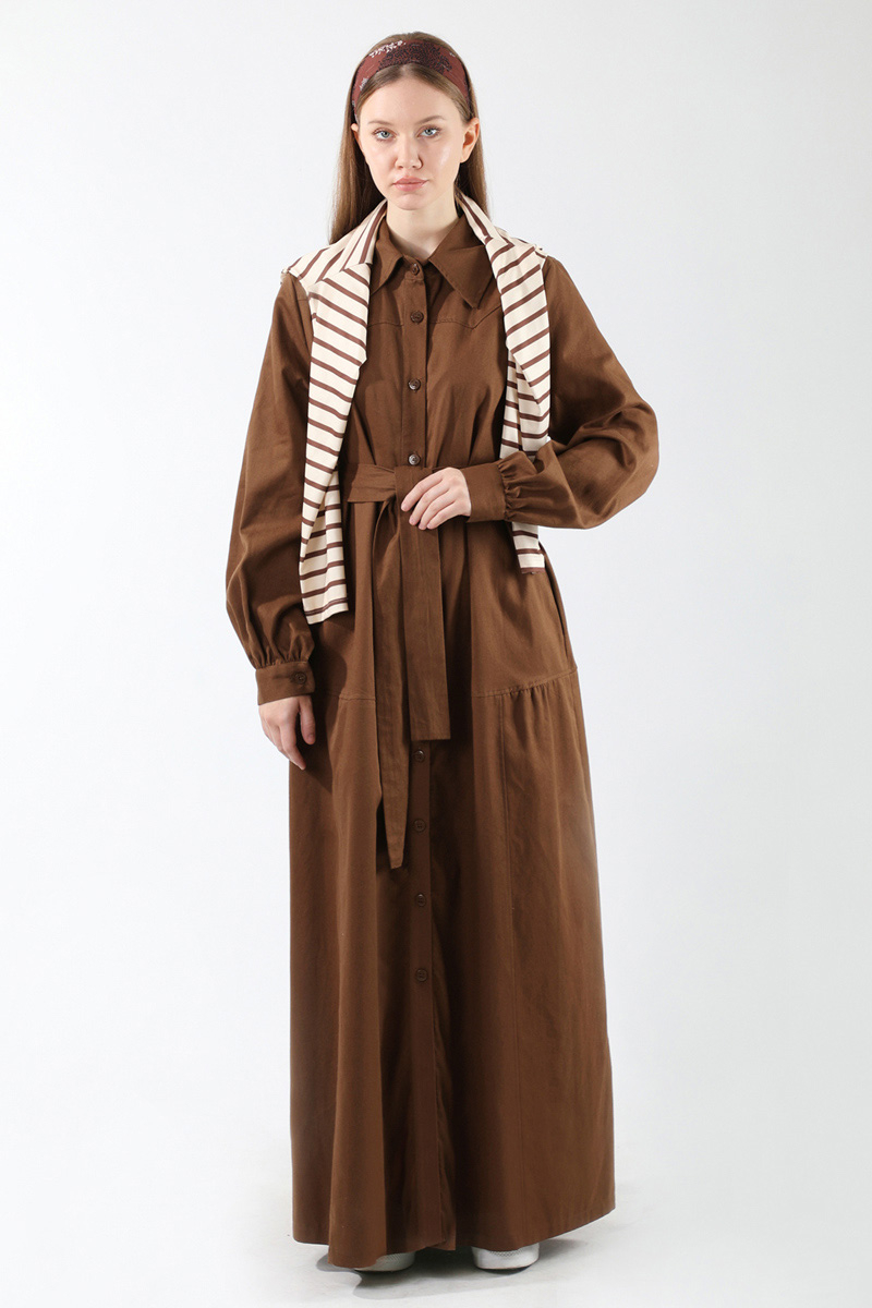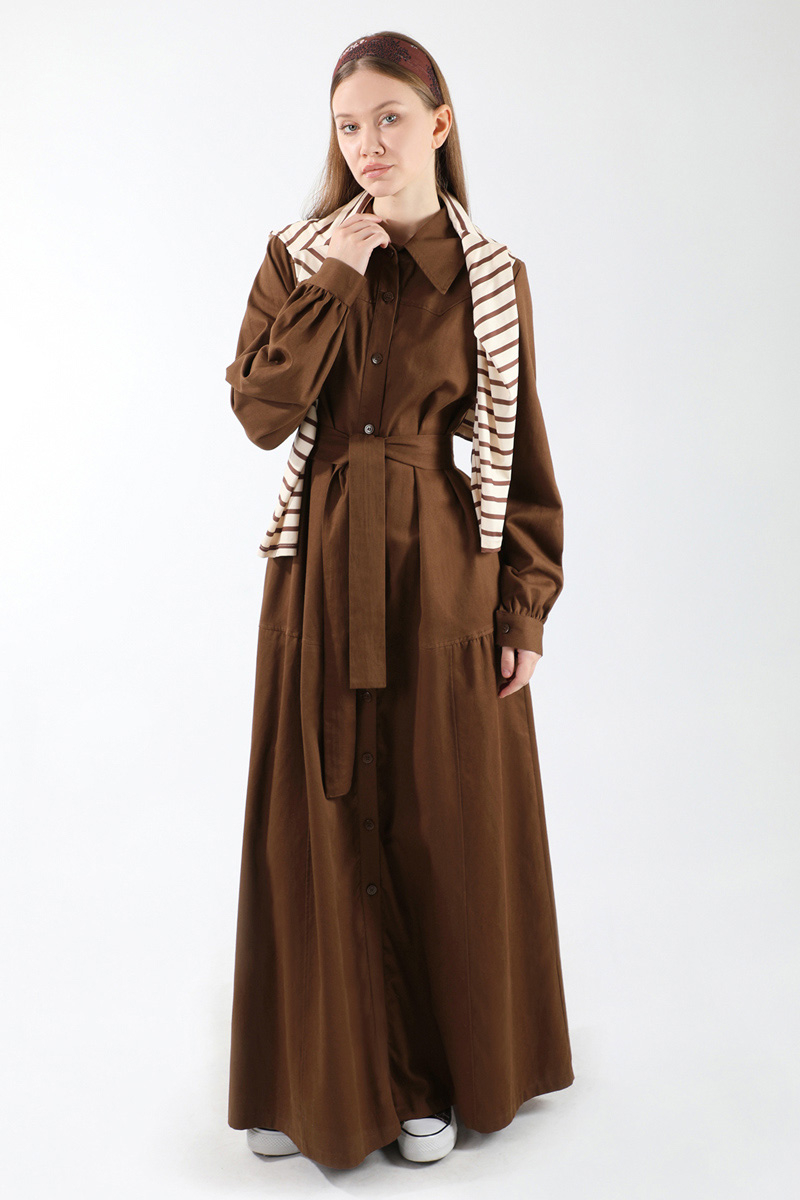 Gömlek Yaka Düğmeli Gabardin Elbise Kahverengi. Gömlek yakalıdır. Manşeti düğmelidir. Ön beden roba detaylıdır. Basen hattından kesik detaylıdır. Ceplidir. Balon kolludur. Kuşaklıdır. Günlük kullanım ve özel günlerinizde tercih edebilirsiniz.