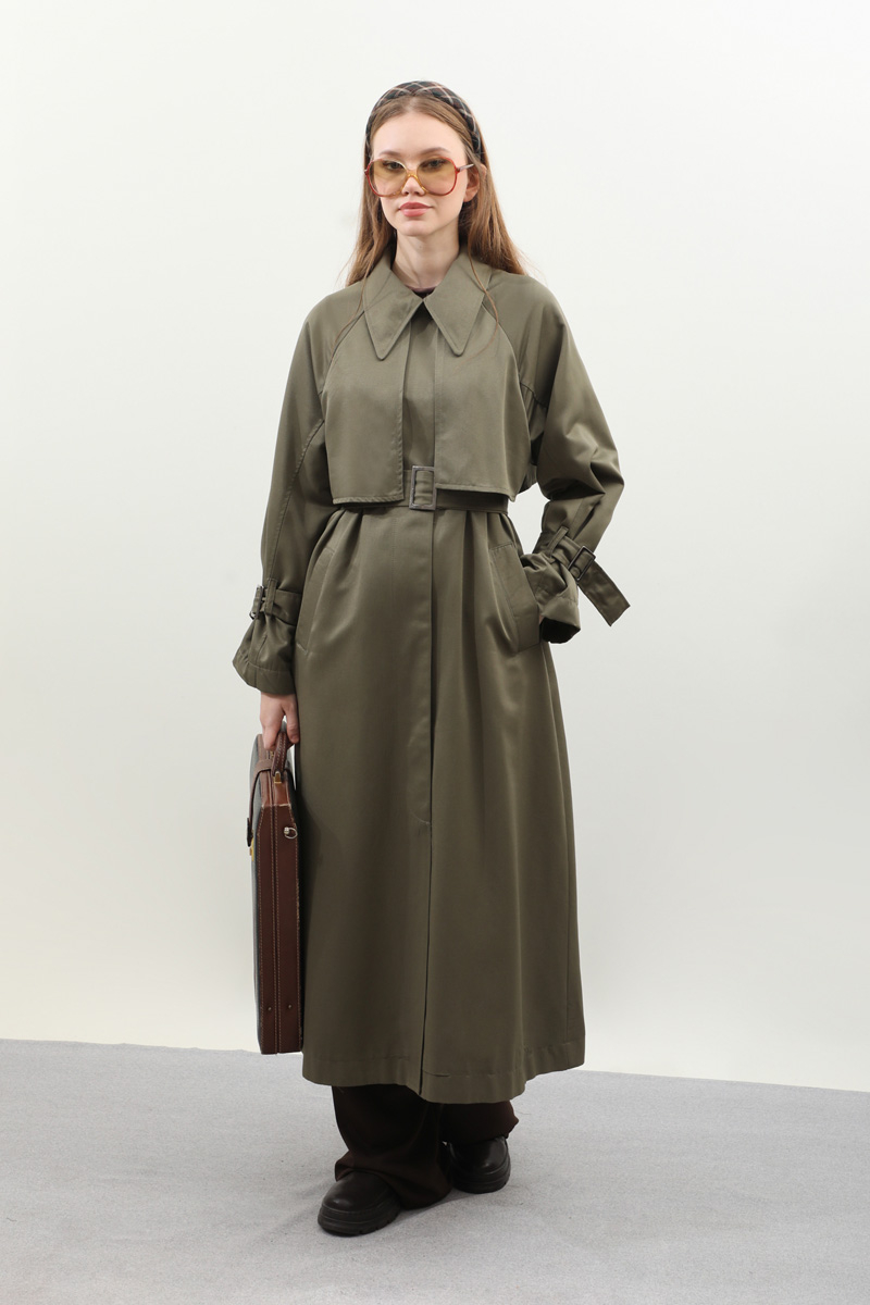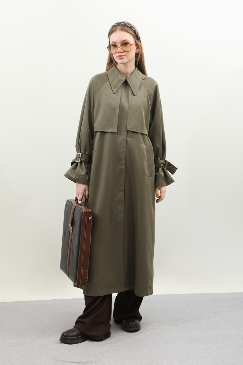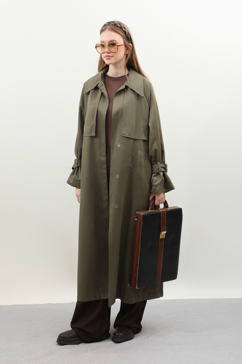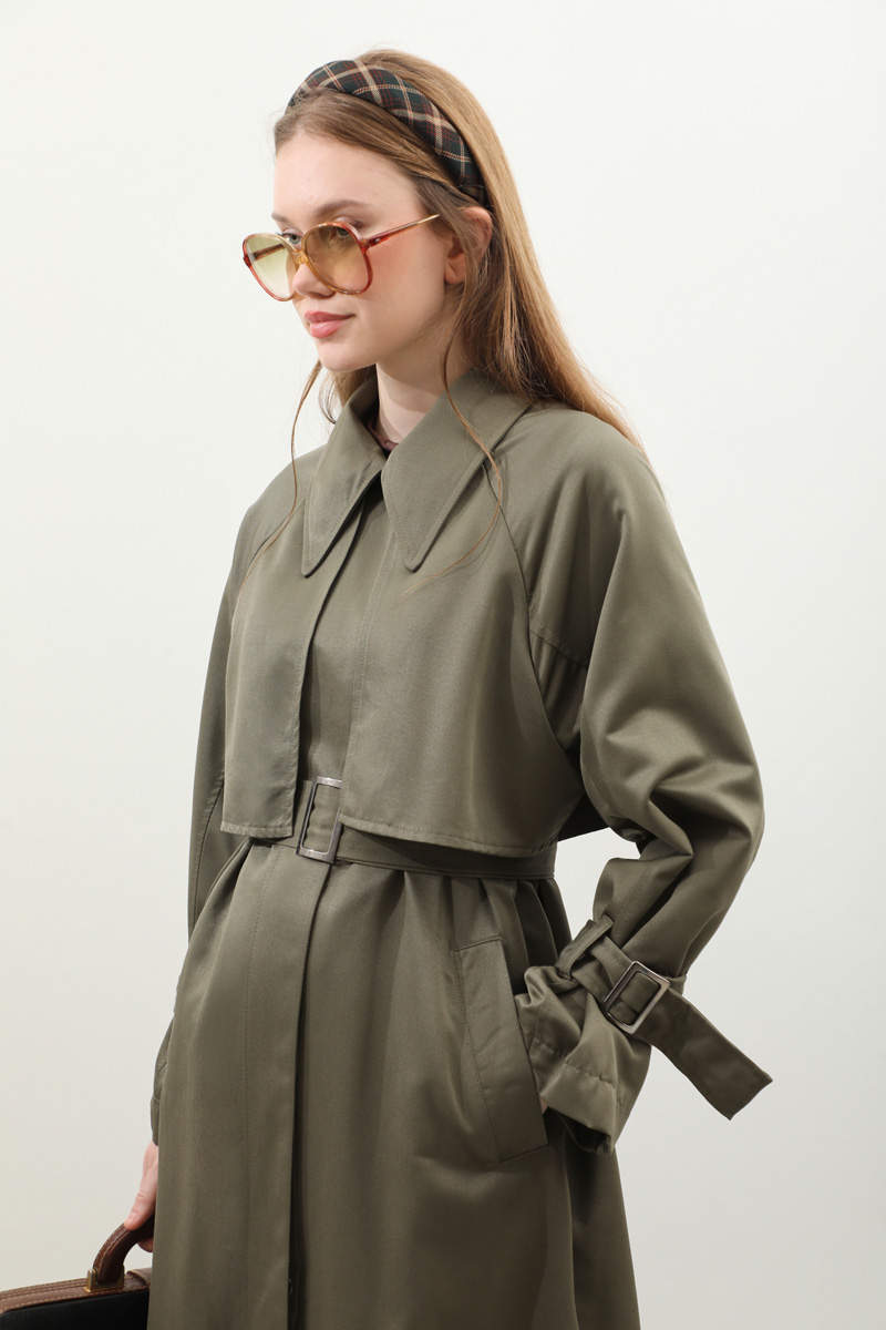 Gömlek Yaka Trençkot Haki. Gömlek yaka olup rüzgarlık detaylı ve önden gizli düğmelidir, kuşaklıdır, yandan ceplidir, astarlıdır. Reglan koludur, bileklerinde kemer detayı bulunmaktadır. Günlük kullanım ve özel günlerinizde tercih edebilirsiniz.