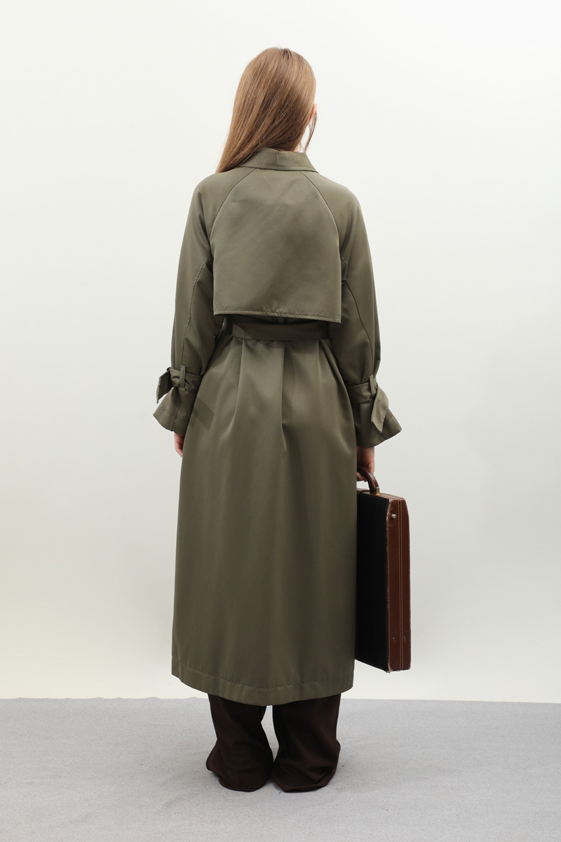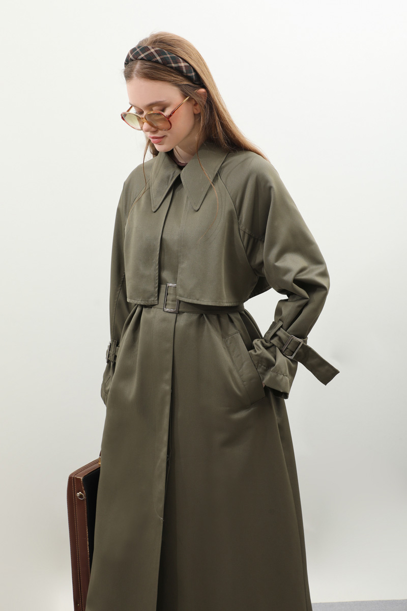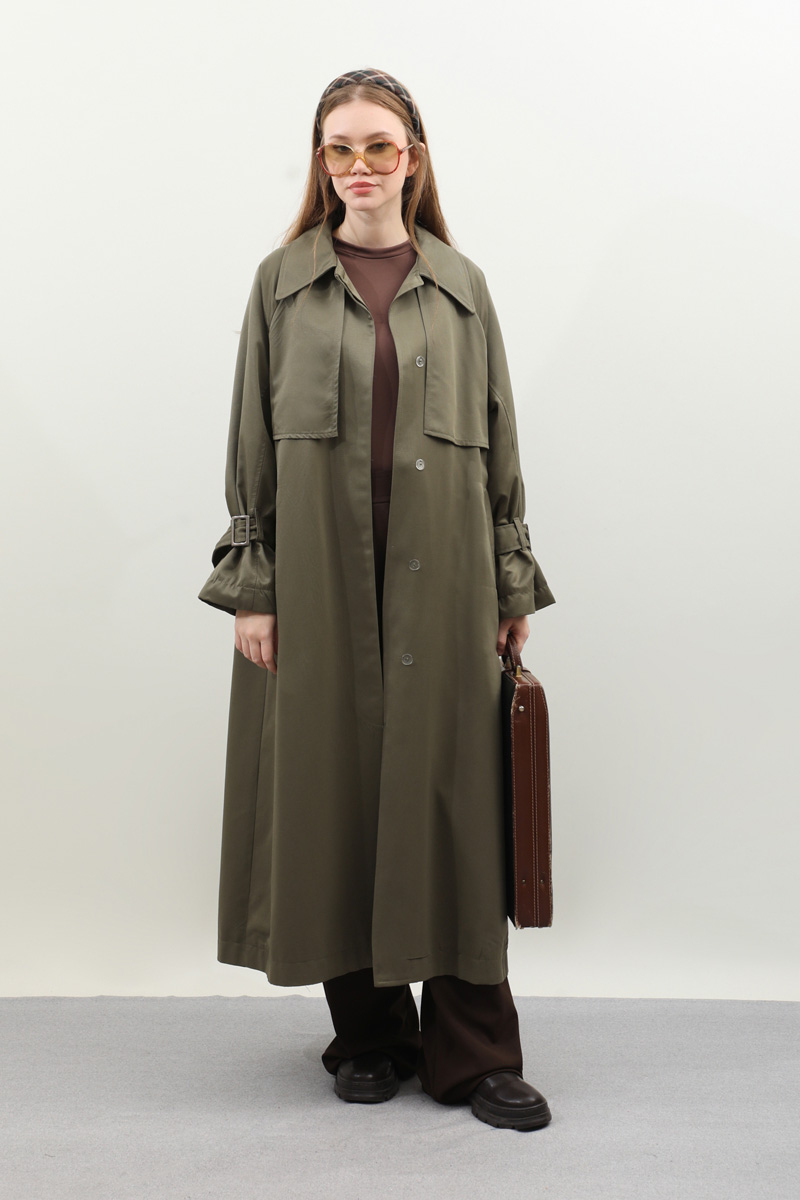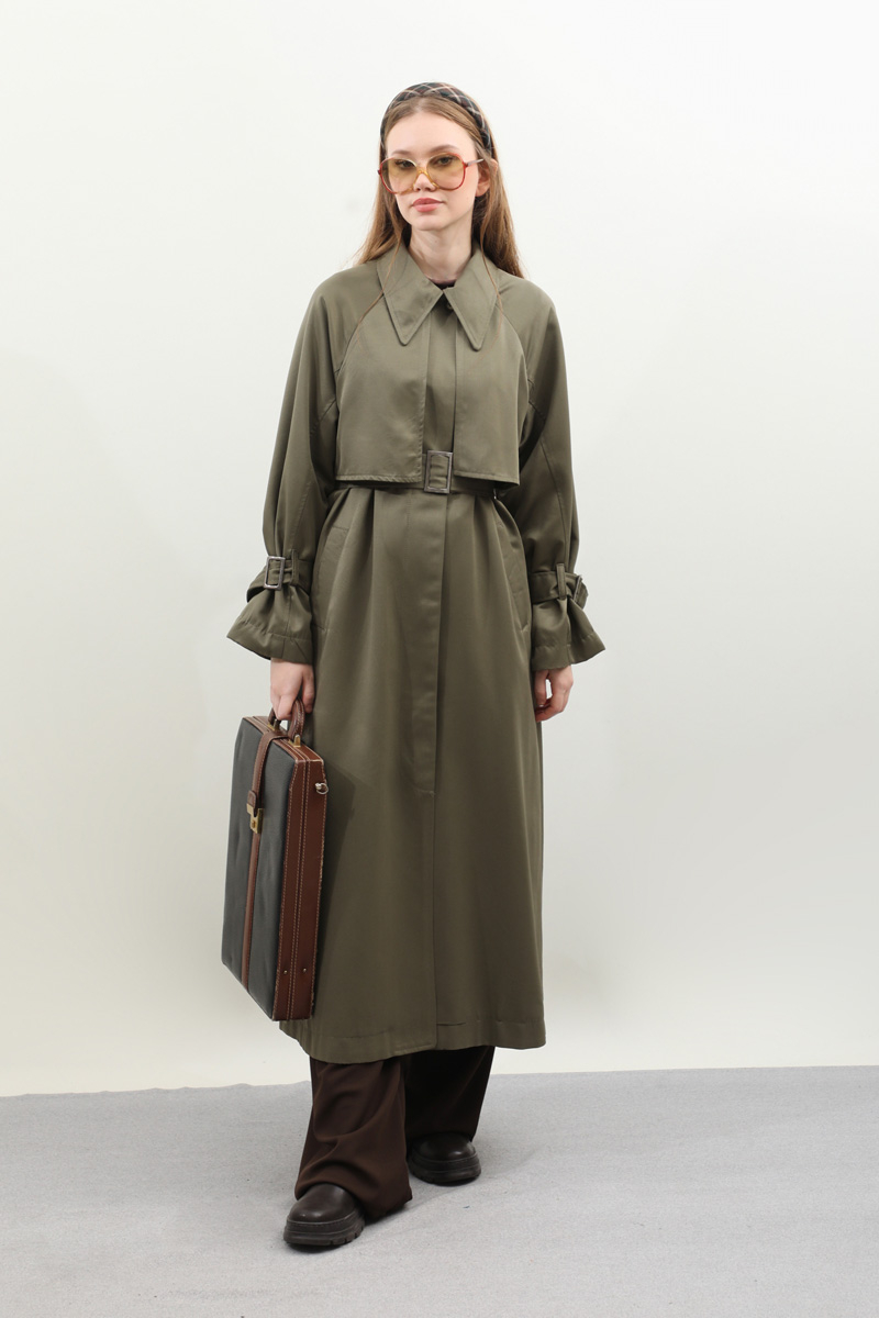 Gömlek Yaka Trençkot Haki. Gömlek yaka olup rüzgarlık detaylı ve önden gizli düğmelidir, kuşaklıdır, yandan ceplidir, astarlıdır. Reglan koludur, bileklerinde kemer detayı bulunmaktadır. Günlük kullanım ve özel günlerinizde tercih edebilirsiniz.