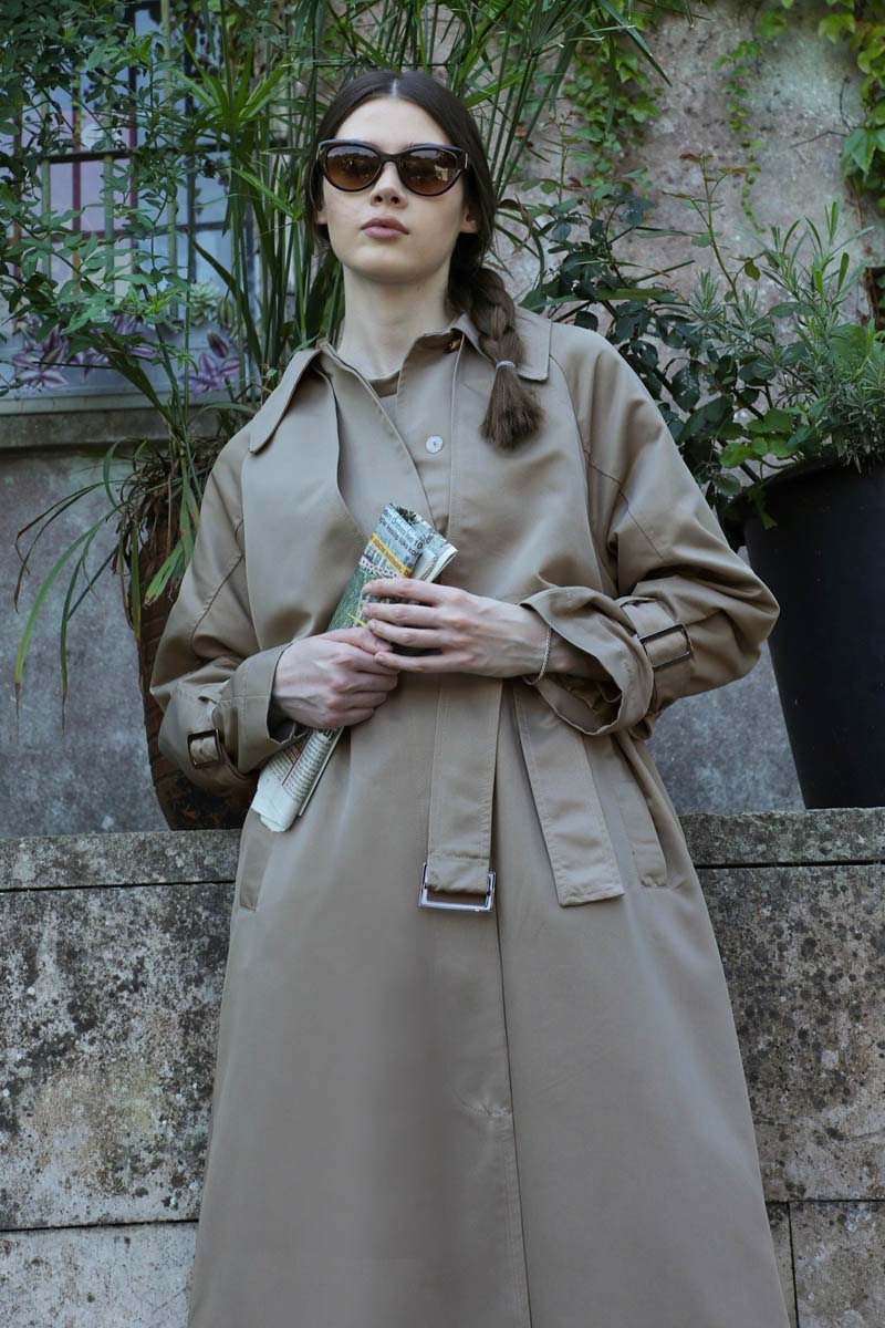 Gömlek Yaka Trençkot Taş. Gömlek yaka olup rüzgarlık detaylı ve önden gizli düğmelidir, kuşaklıdır, yandan ceplidir, astarlıdır. Reglan koludur, bileklerinde kemer detayı bulunmaktadır. Günlük kullanım ve özel günlerinizde tercih edebilirsiniz.