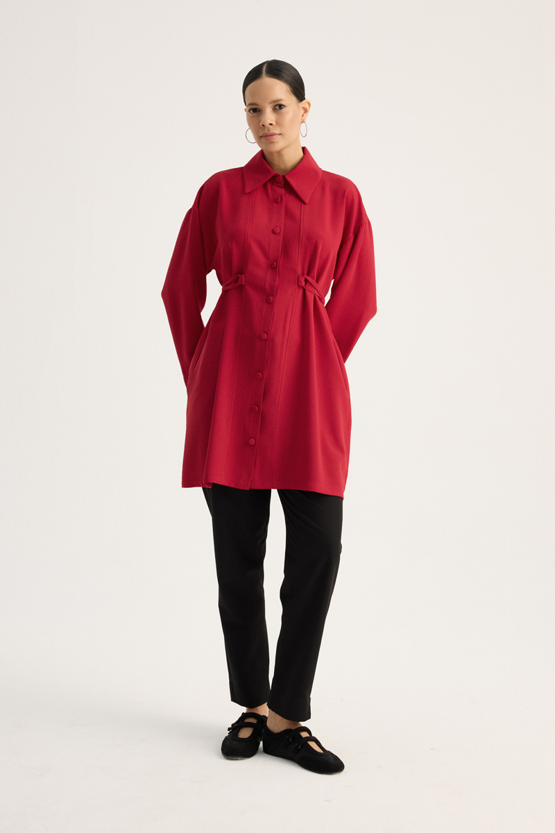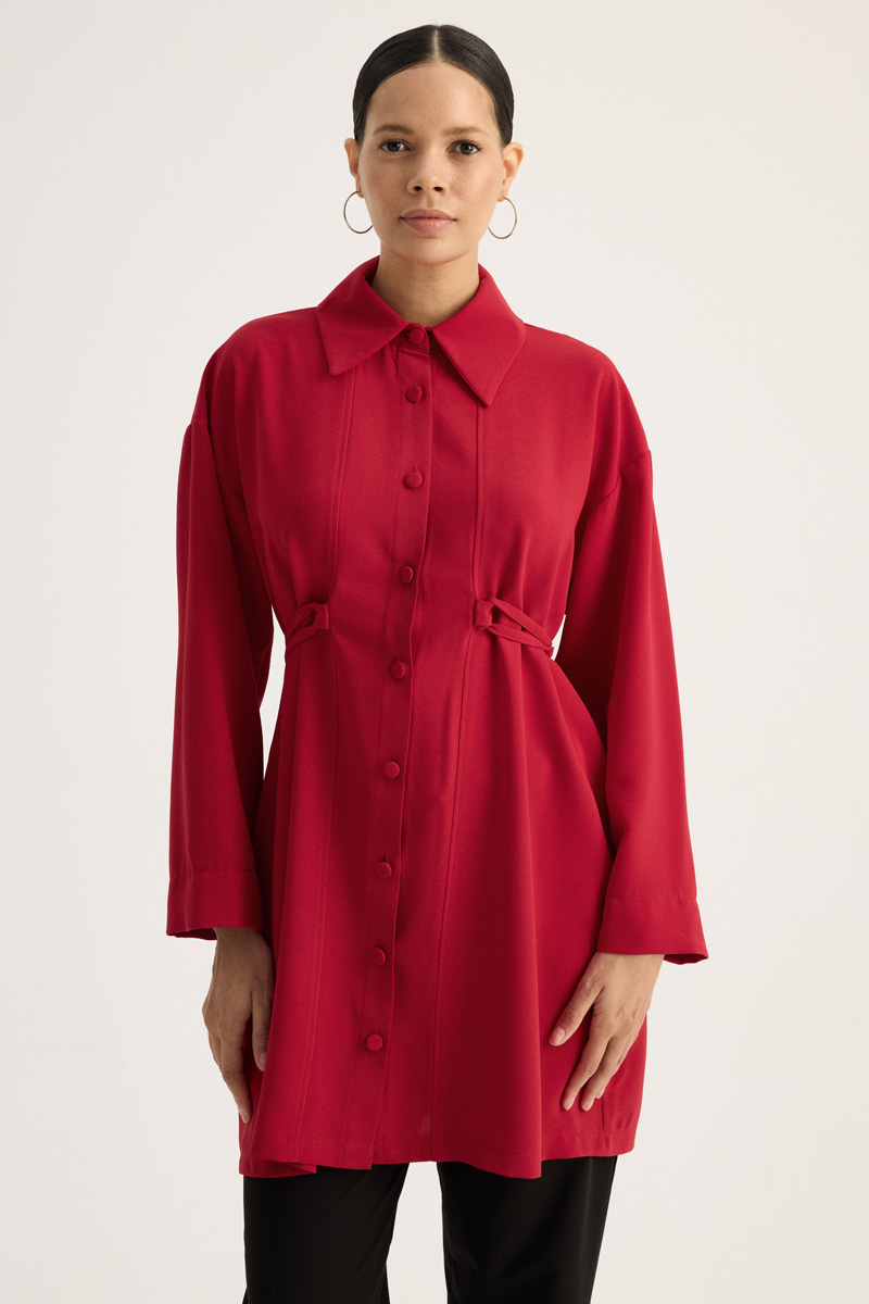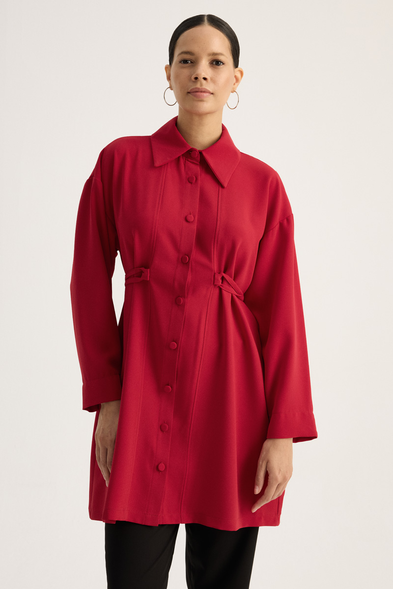 Gömlek Yaka Tunik Kırmızı. Gömlek yakadır, önden düğmelidir, yanlardan biye bağlama detaylıdır, kup parçalıdır düşük omuzludur, astarsızdır. Günlük kullanım için uygundur.