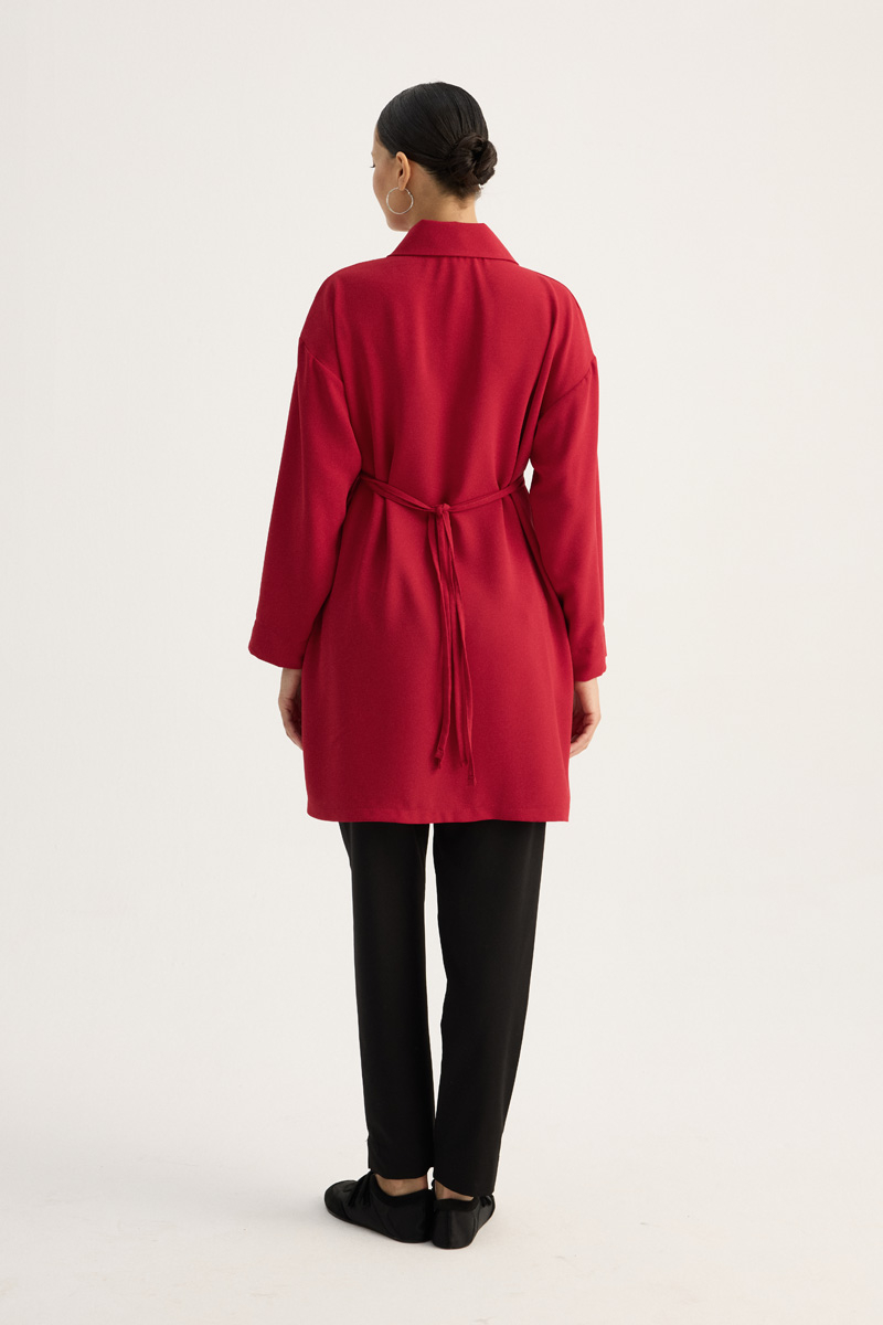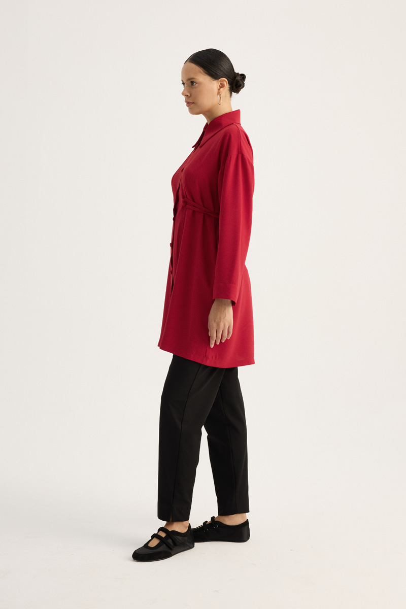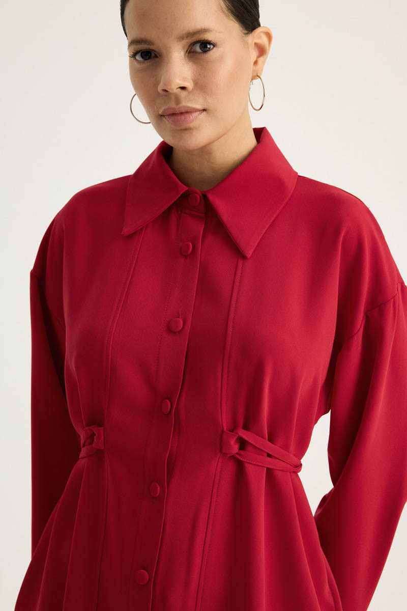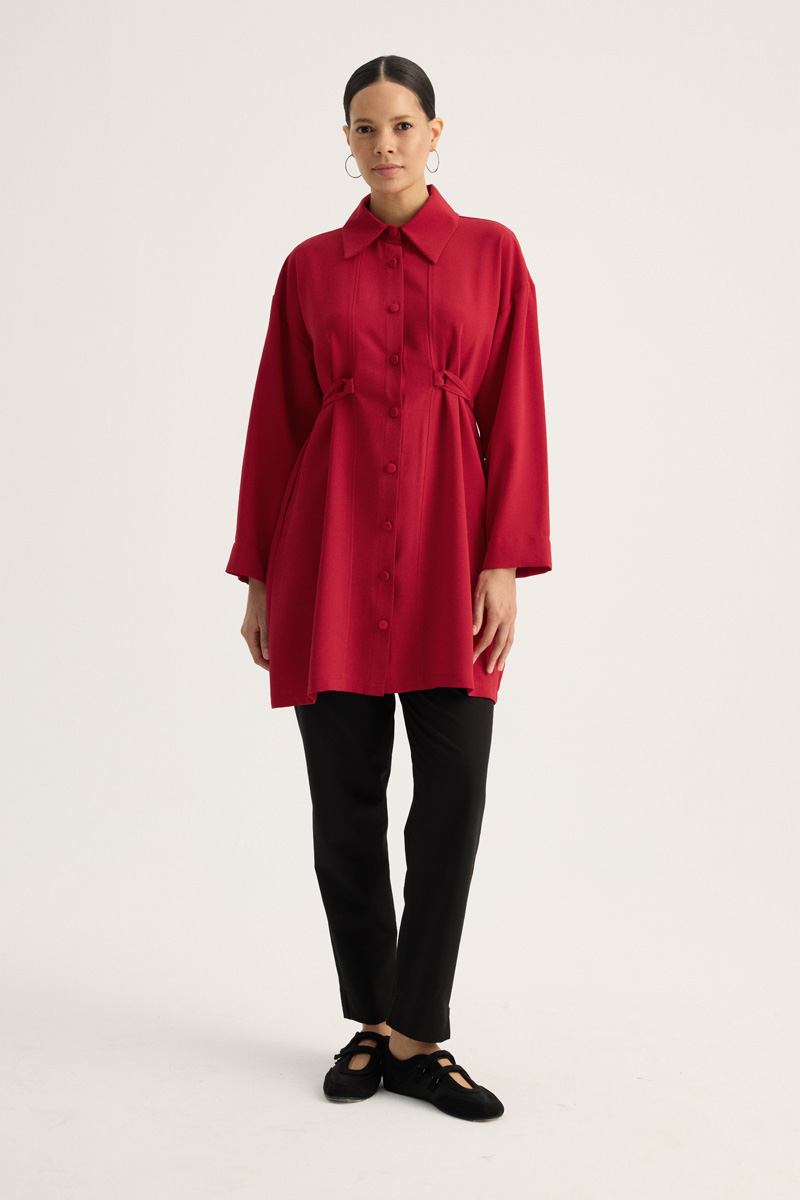 Gömlek Yaka Tunik Kırmızı. Gömlek yakadır, önden düğmelidir, yanlardan biye bağlama detaylıdır, kup parçalıdır düşük omuzludur, astarsızdır. Günlük kullanım için uygundur.