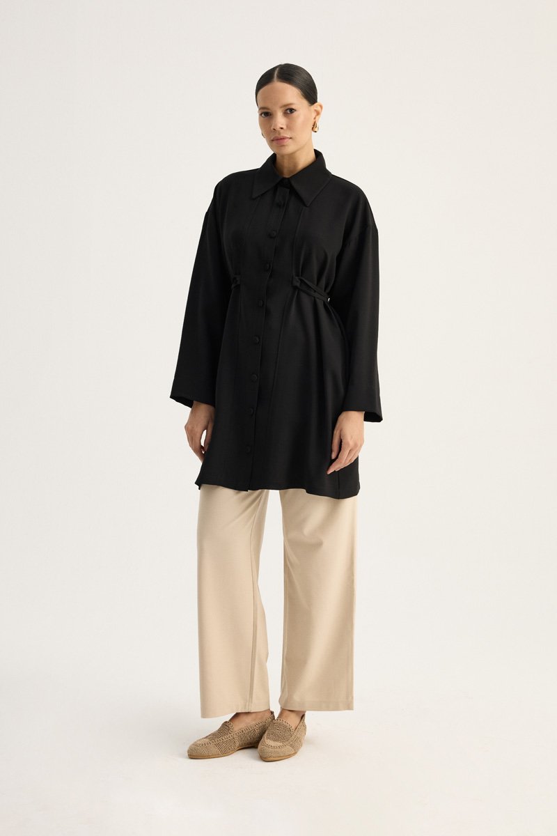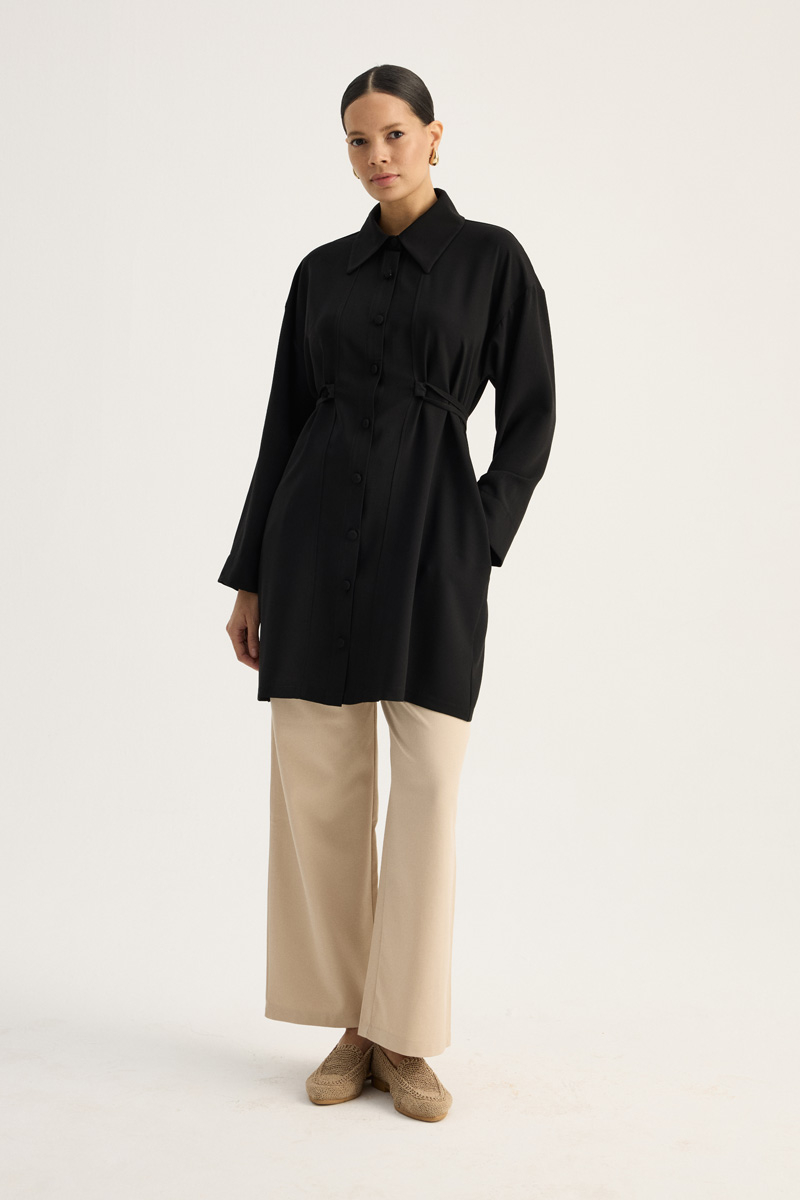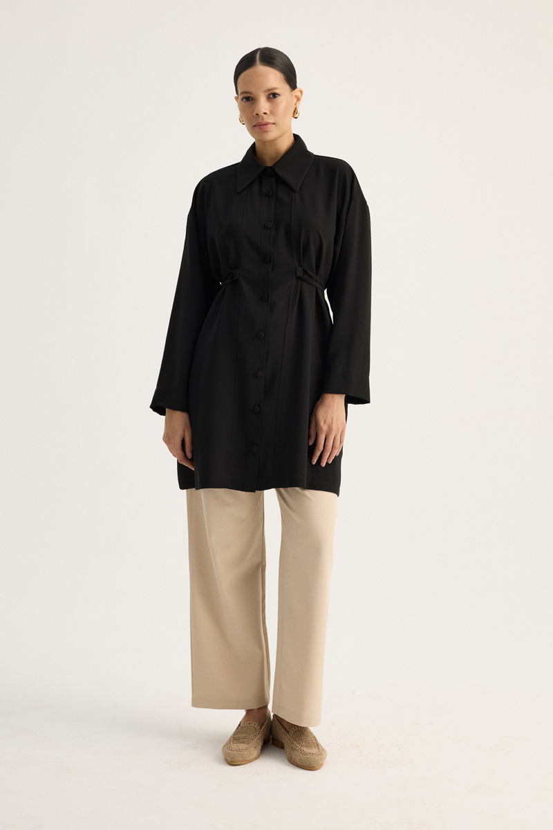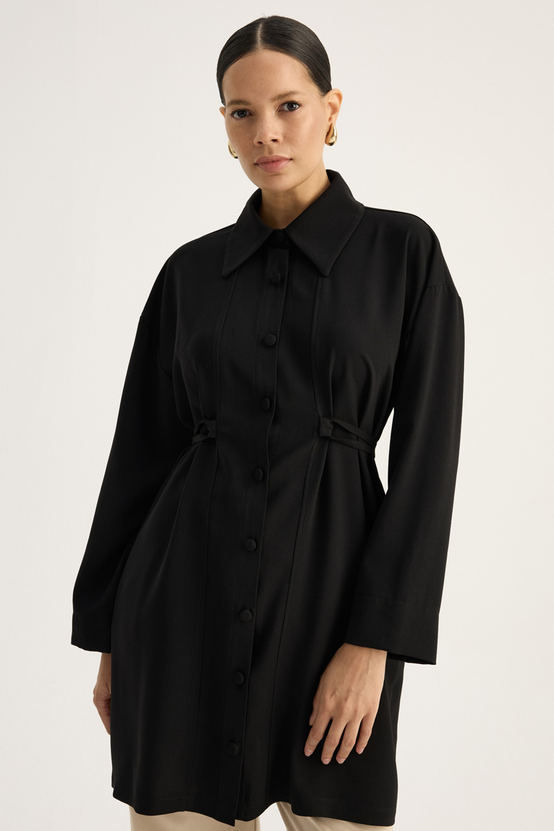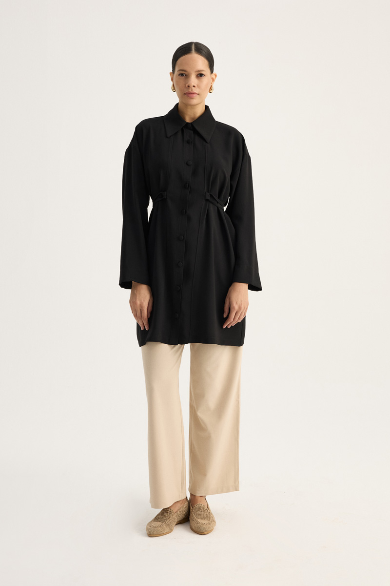 Gömlek Yaka Tunik Siyah. Gömlek yakadır, önden düğmelidir, yanlardan biye bağlama detaylıdır, kup parçalıdır düşük omuzludur, astarsızdır. Günlük kullanım için uygundur.