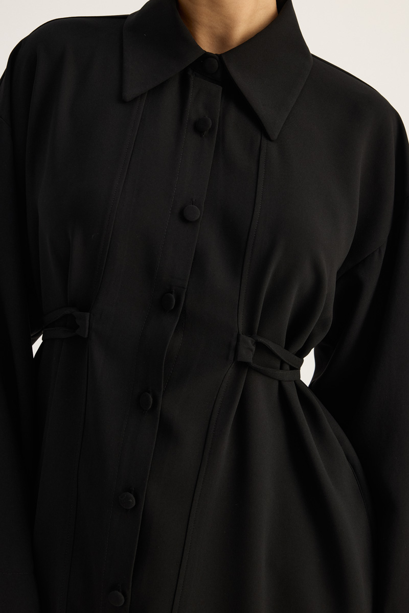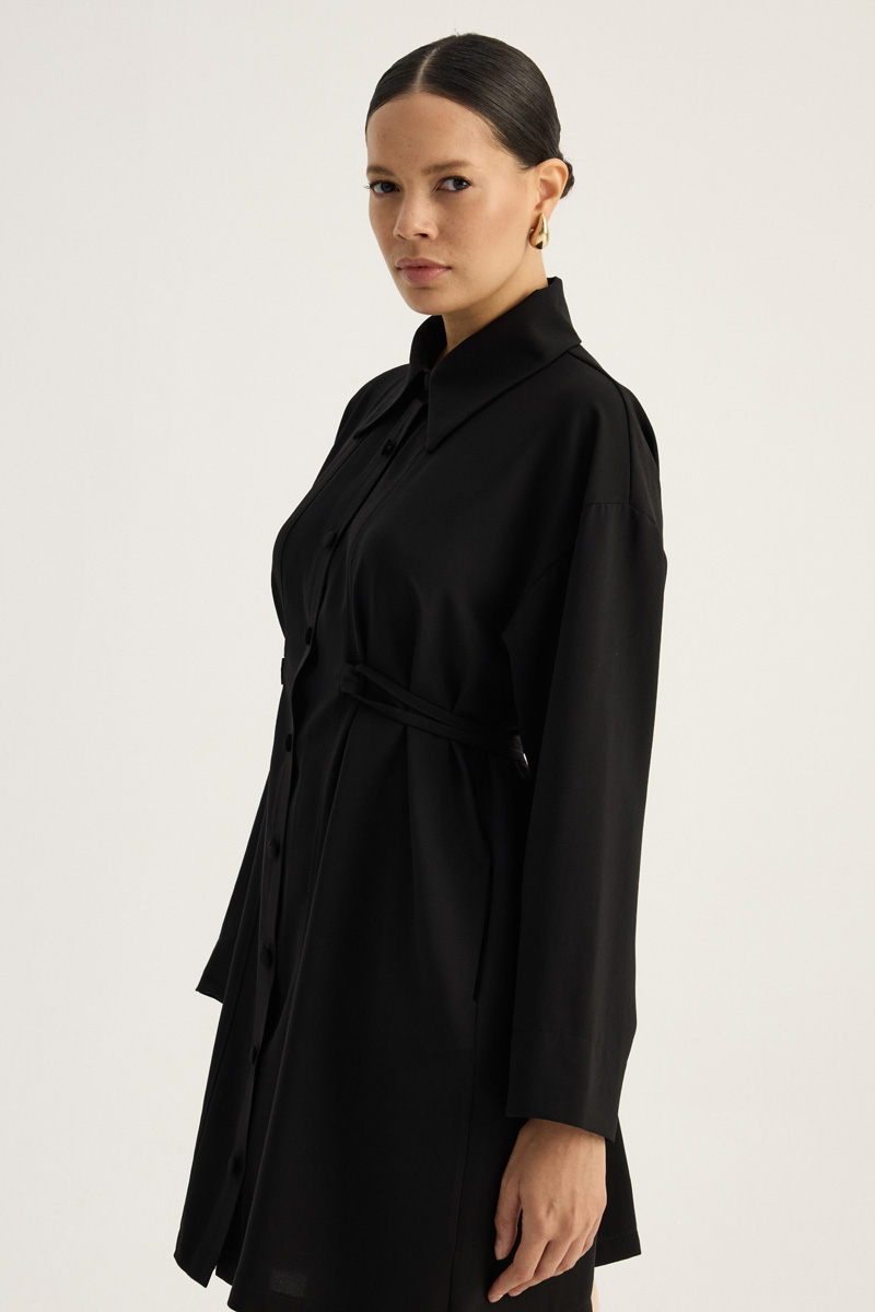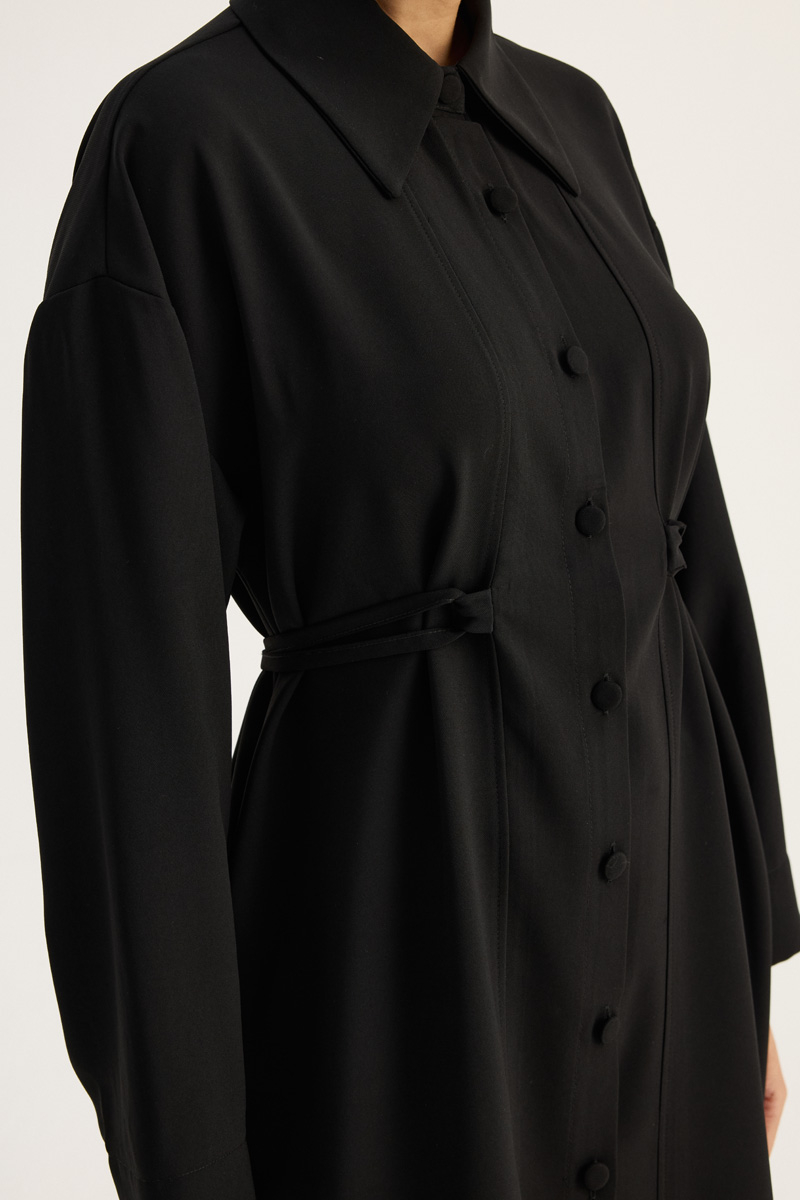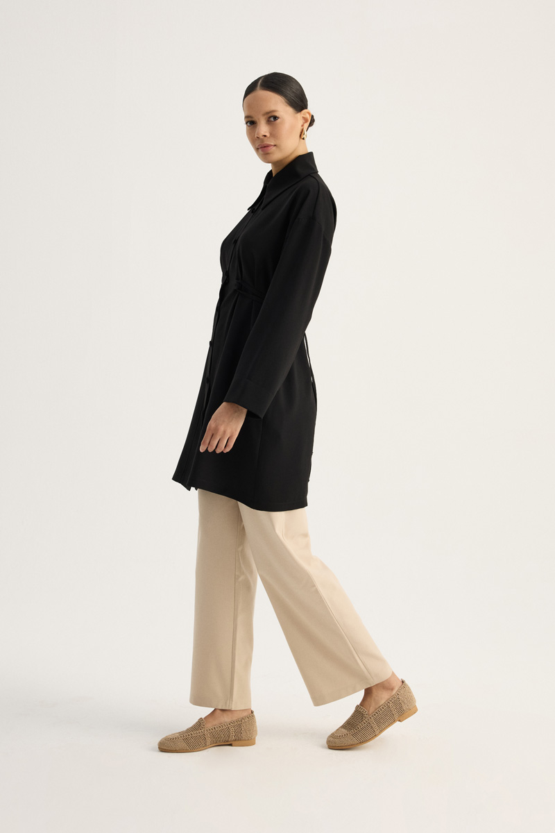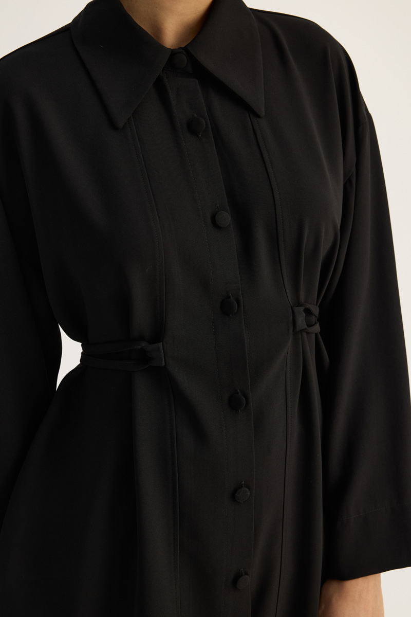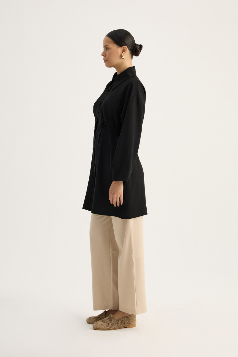 Gömlek Yaka Tunik Siyah. Gömlek yakadır, önden düğmelidir, yanlardan biye bağlama detaylıdır, kup parçalıdır düşük omuzludur, astarsızdır. Günlük kullanım için uygundur.