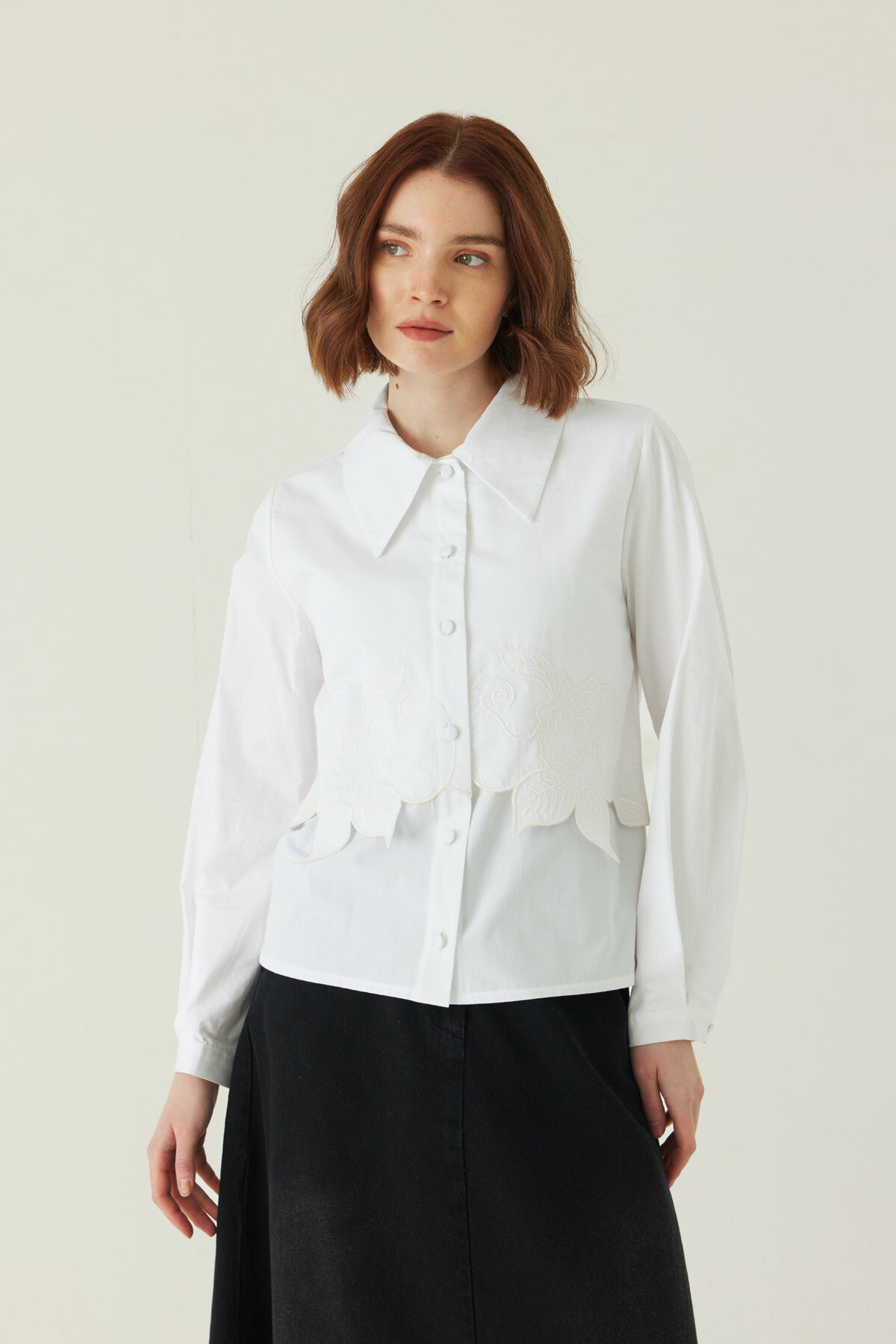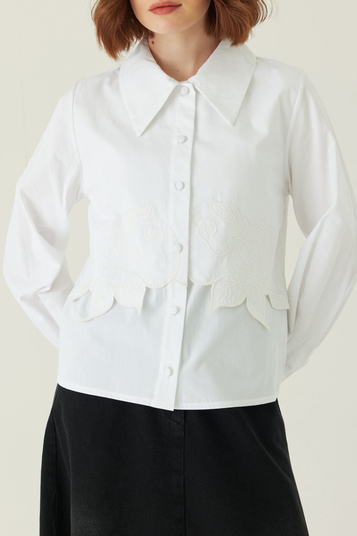 Gül Nakışlı Poplin Gömlek Beyaz