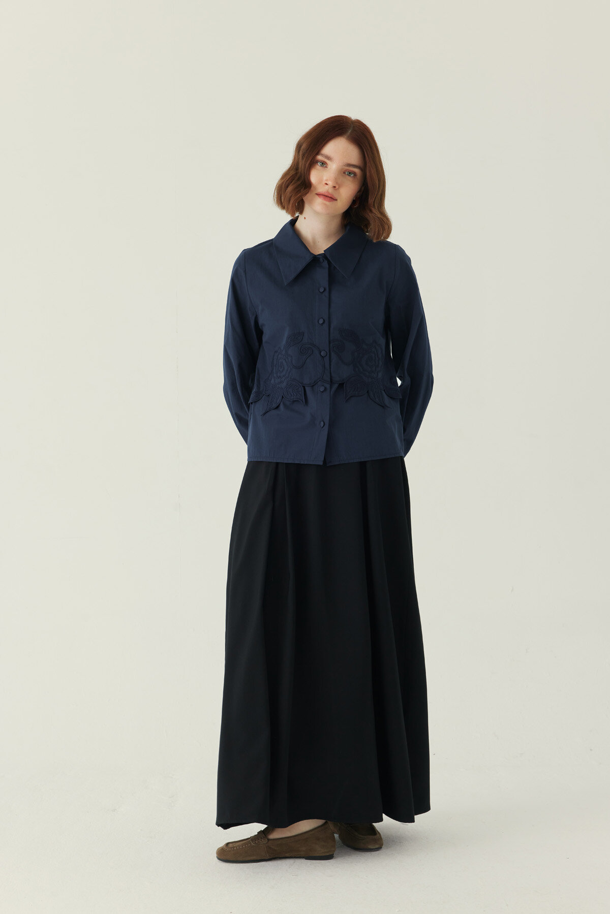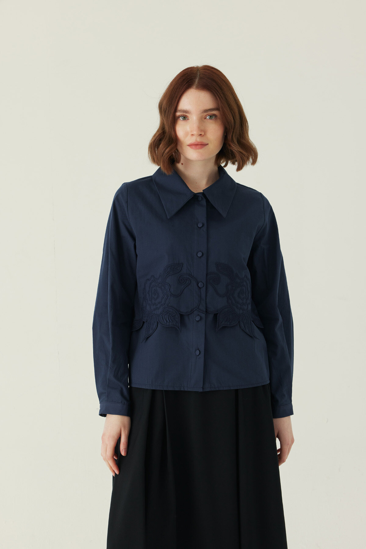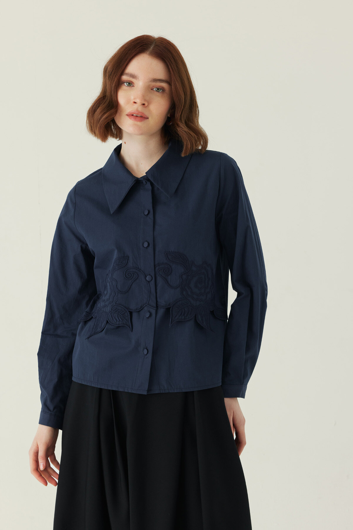 Gül Nakışlı Poplin Gömlek Lacivert