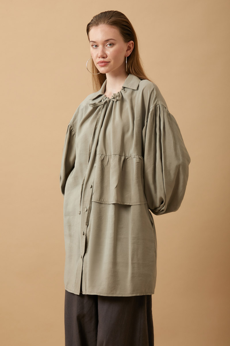 bu tasarım, hem şehir şıklığında hem de rahat hafta sonu kombinlerinde öne çıkar. Geniş kesimli kolları ve manşet bitişleriyle özgün ve dikkat çekici bir görünüm sunarnıma uygundur.