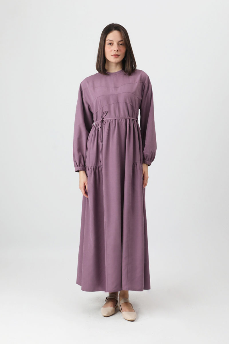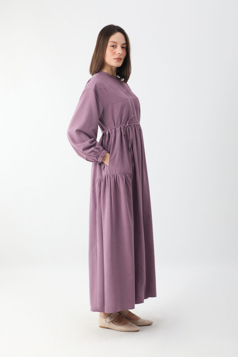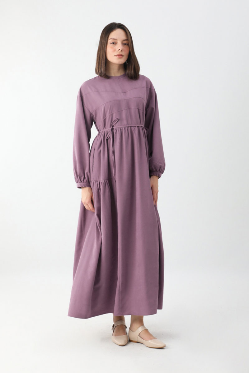 Günsu Elbise Lila. Bisiklet yakadır, Önü roba parça dikiş detaylıdır, düşük kolludur, beli ve etek ucu yanları büzgülüdür, Yumuşak tuşeli kumaştır, belden biye bağlamalıdır, yandan ceplidir, astarsızdır. Günlük kullanım için uygundur.