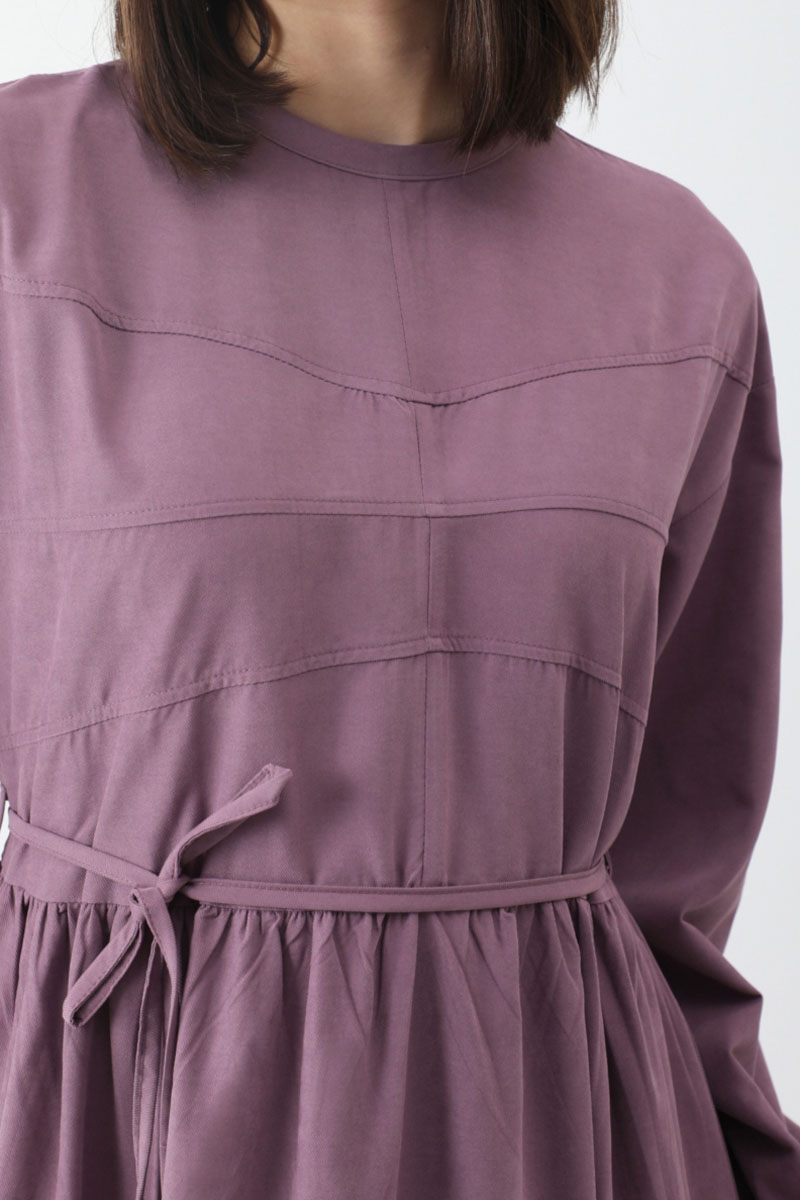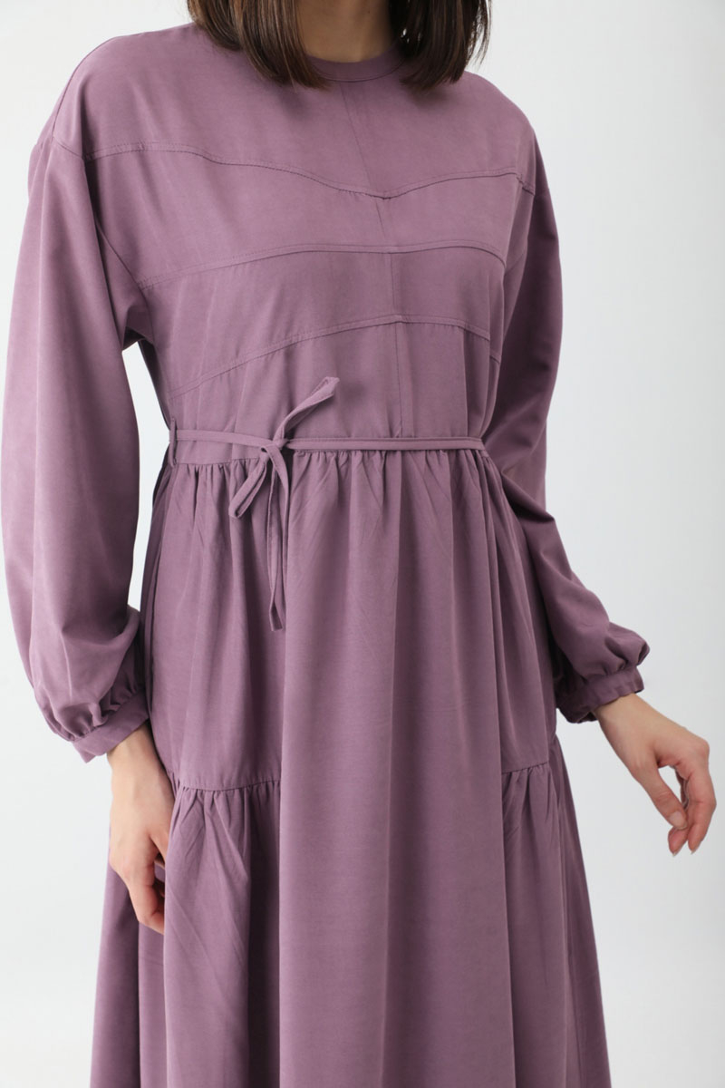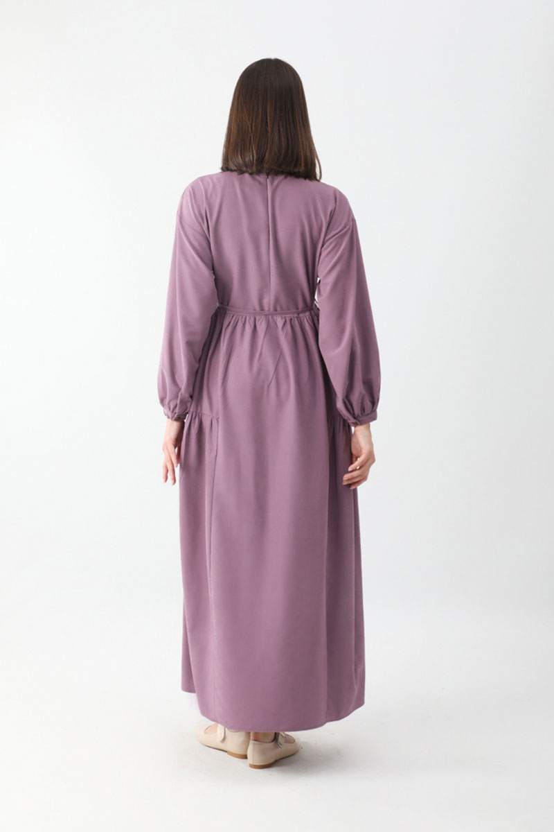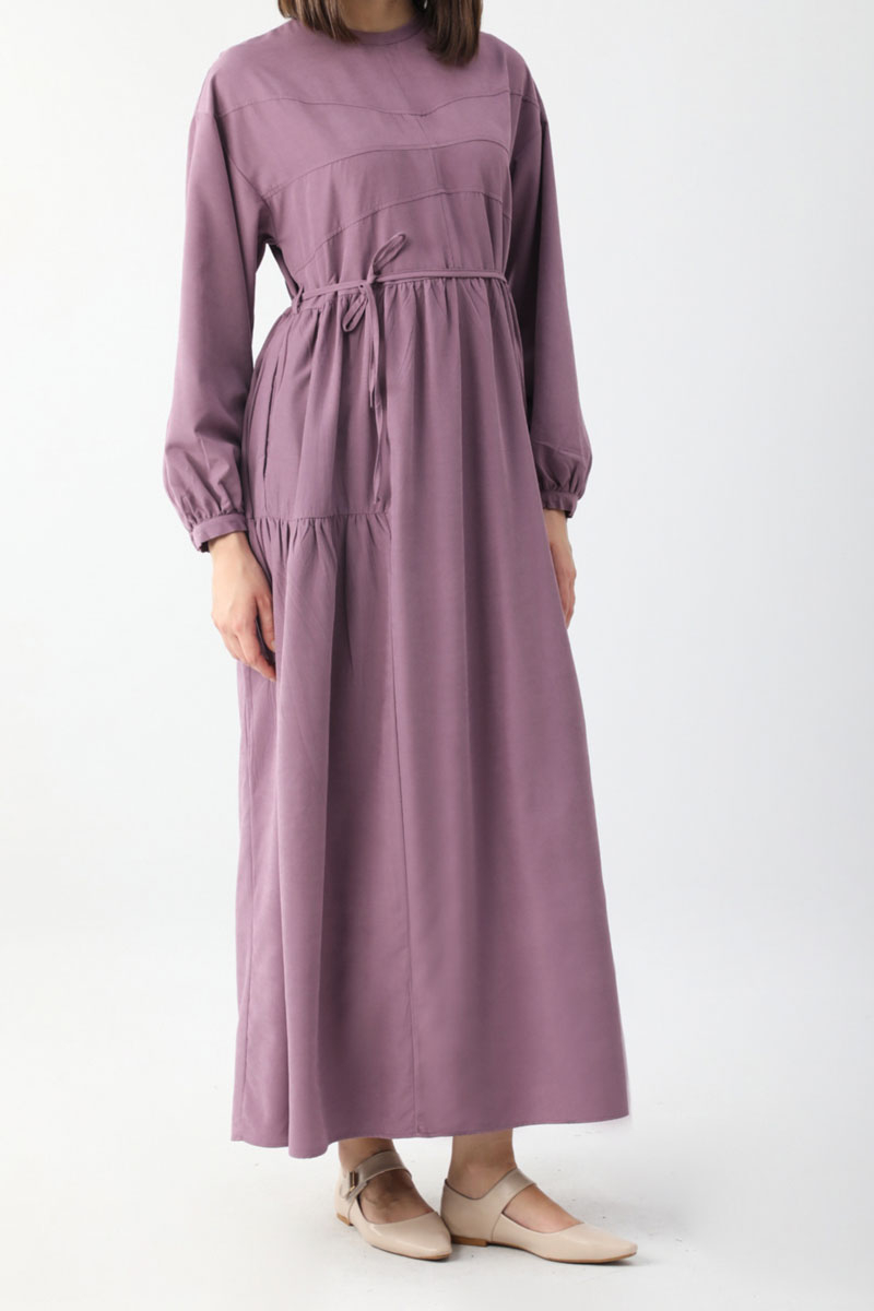 Günsu Elbise Lila. Bisiklet yakadır, Önü roba parça dikiş detaylıdır, düşük kolludur, beli ve etek ucu yanları büzgülüdür, Yumuşak tuşeli kumaştır, belden biye bağlamalıdır, yandan ceplidir, astarsızdır. Günlük kullanım için uygundur.