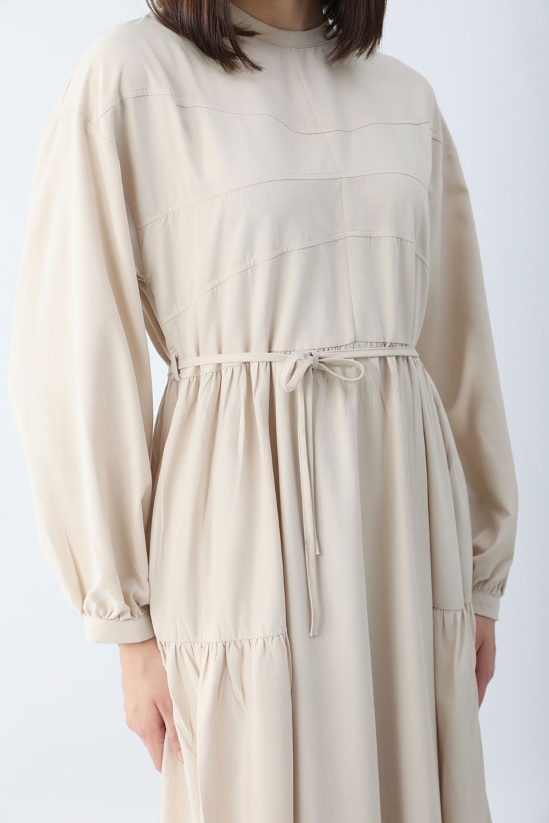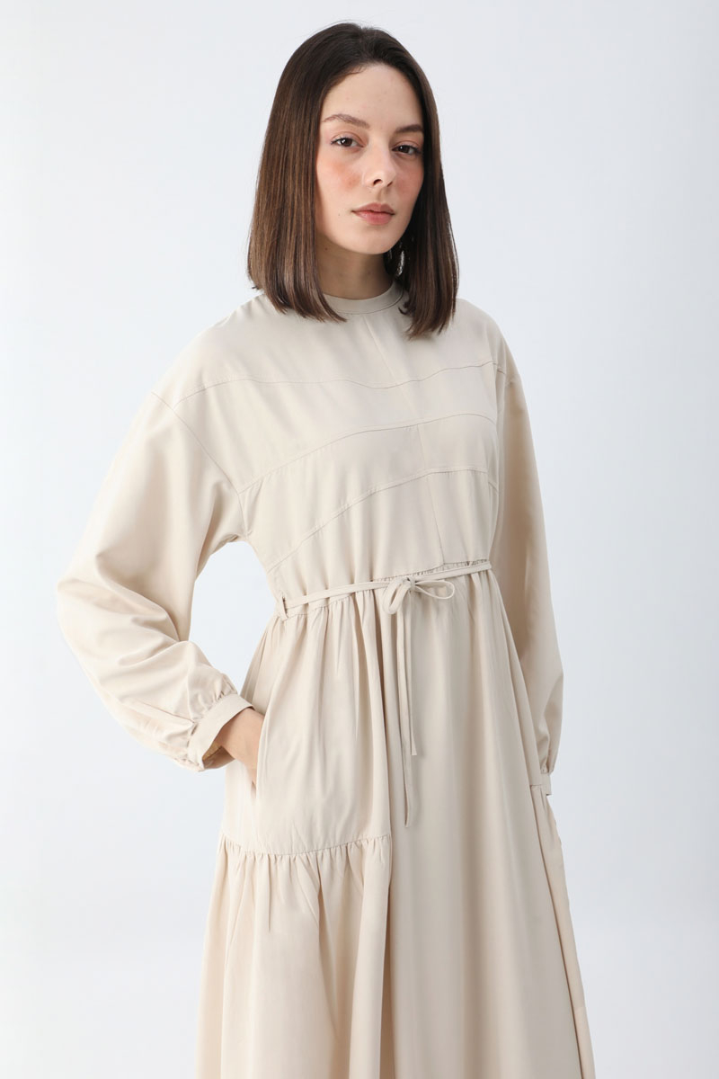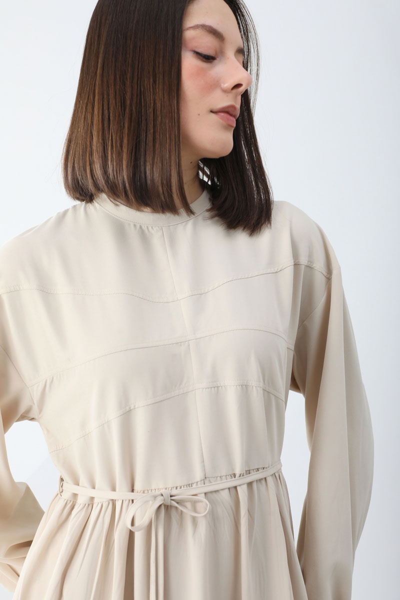 Günsu Elbise Taş. Bisiklet yakadır, Önü roba parça dikiş detaylıdır, düşük kolludur, beli ve etek ucu yanları büzgülüdür, Yumuşak tuşeli kumaştır, belden biye bağlamalıdır, yandan ceplidir, astarsızdır. Günlük kullanım için uygundur.