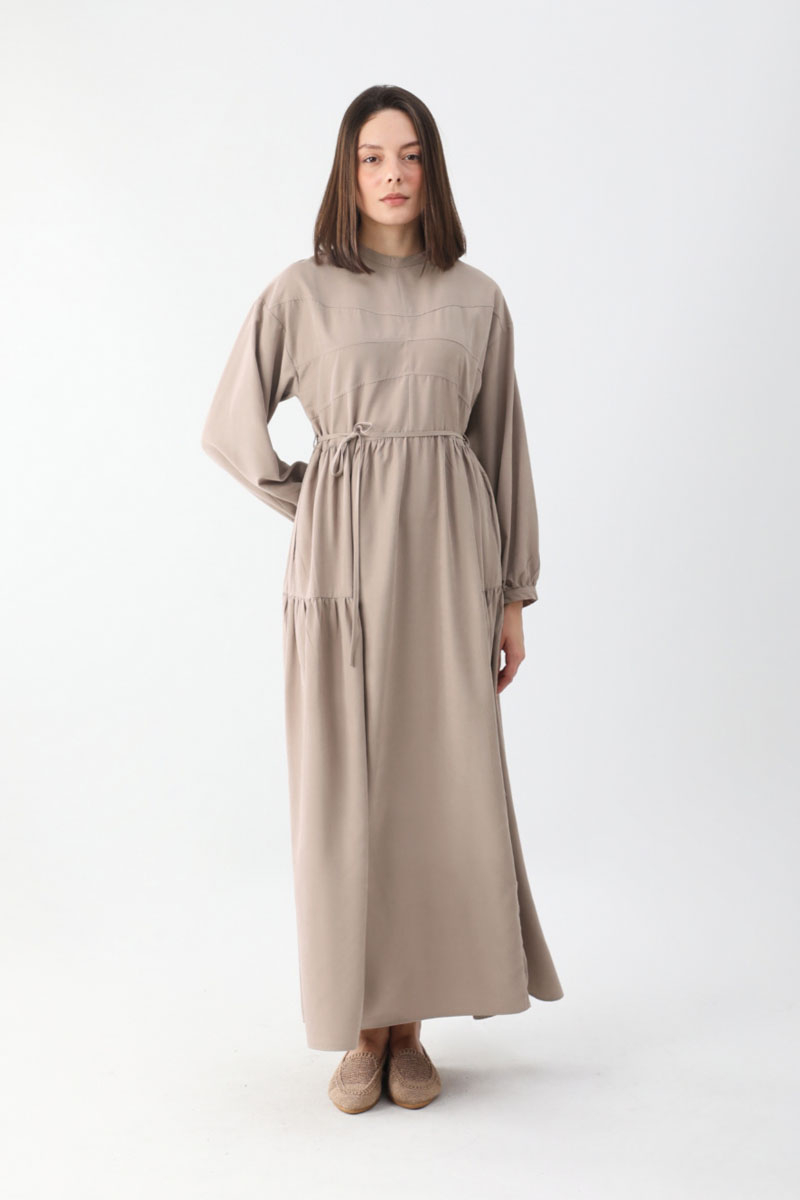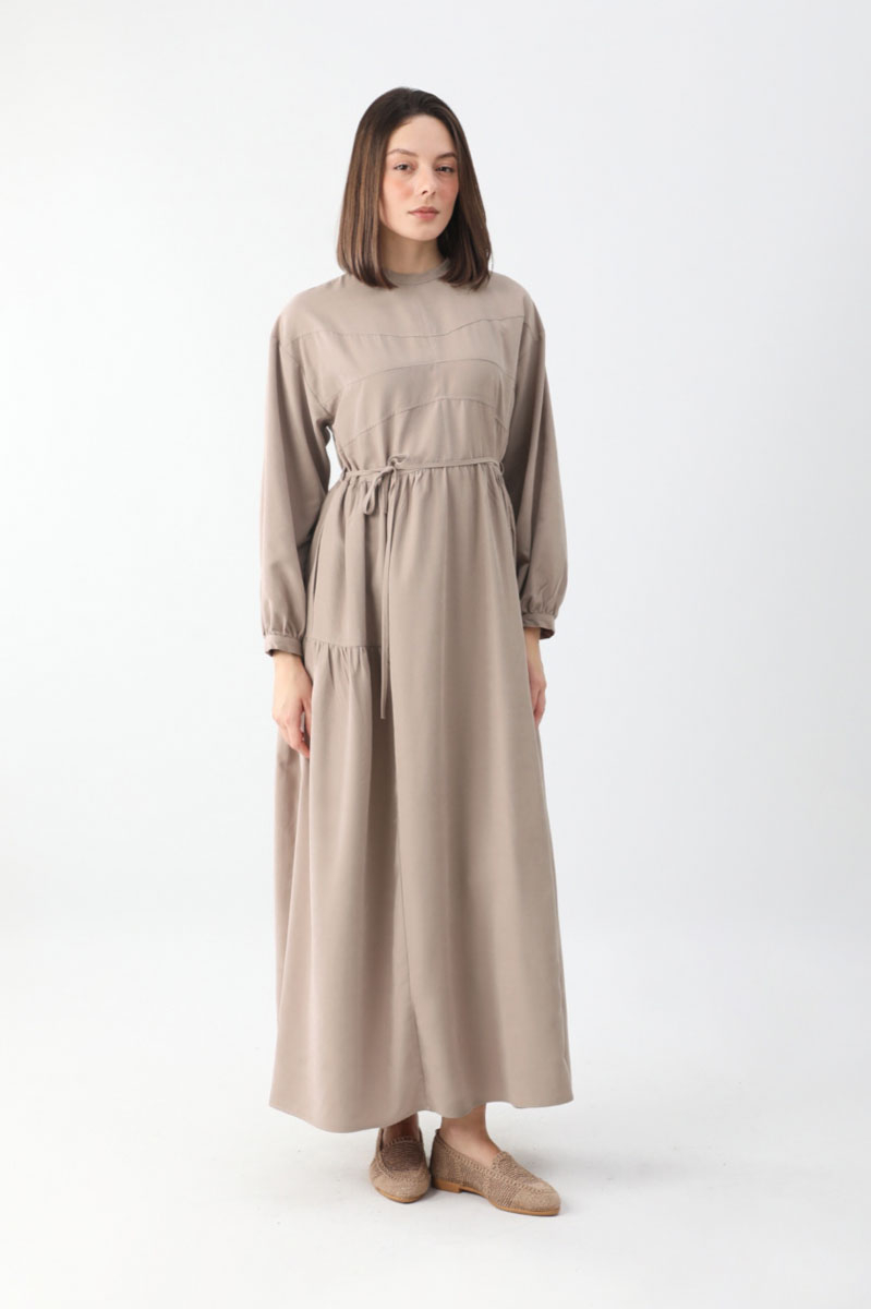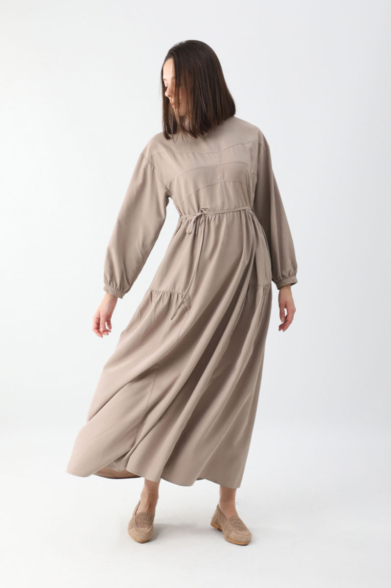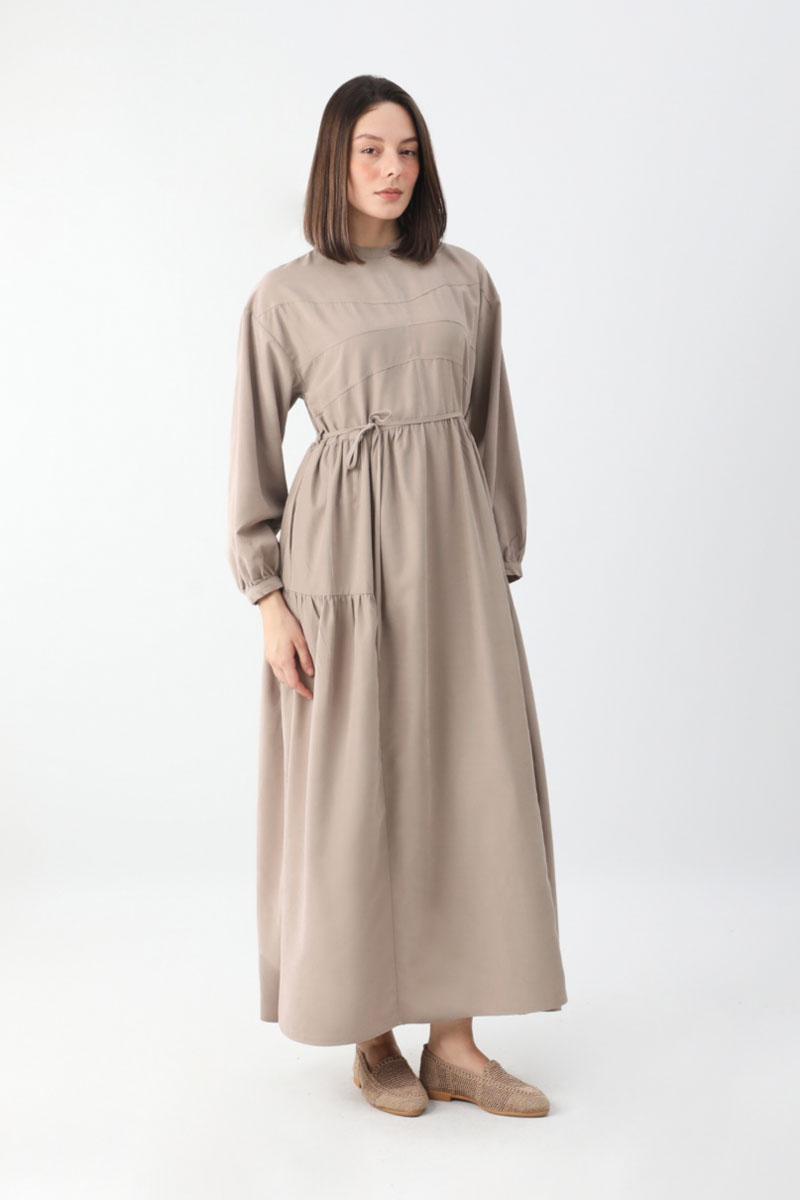 Günsu Elbise Vizon. Bisiklet yakadır, Önü roba parça dikiş detaylıdır, düşük kolludur, beli ve etek ucu yanları büzgülüdür,