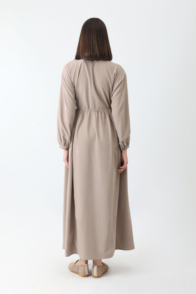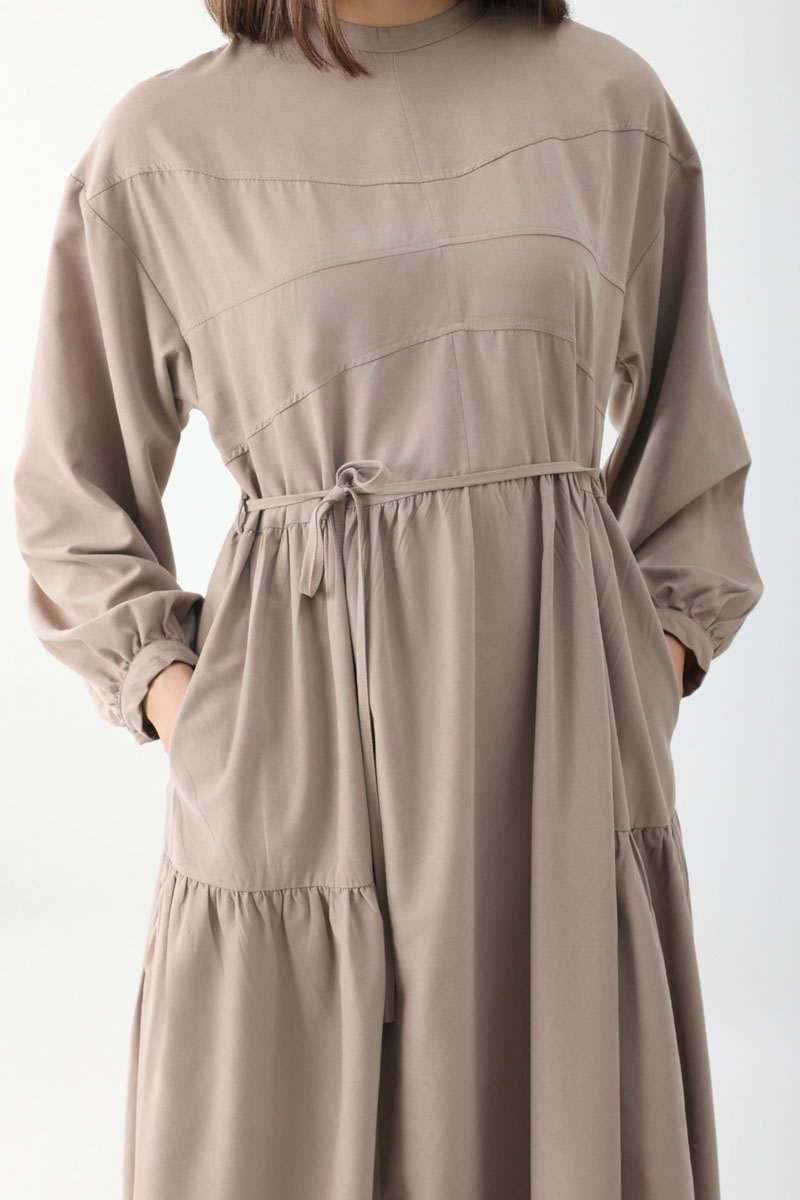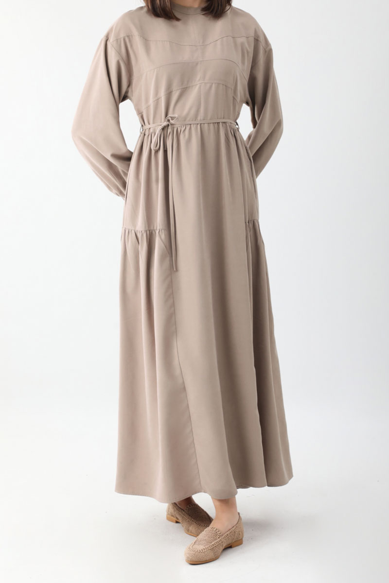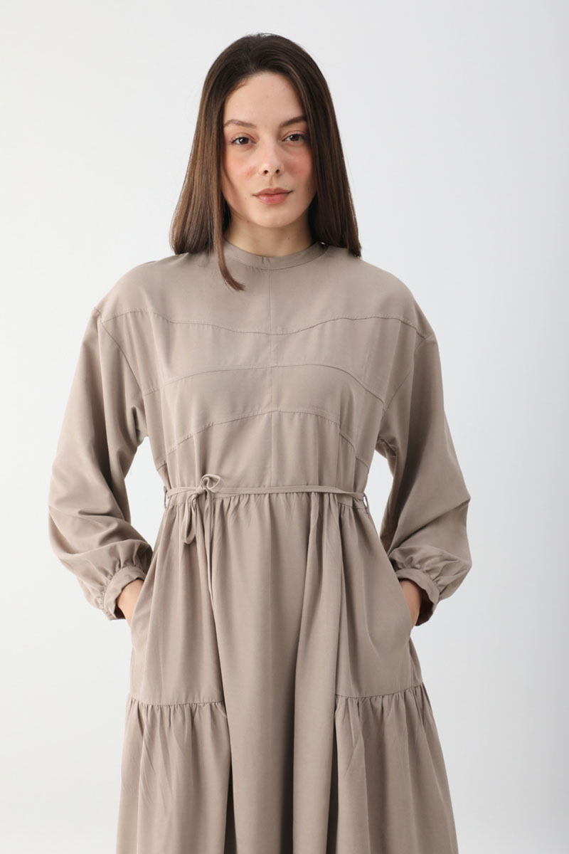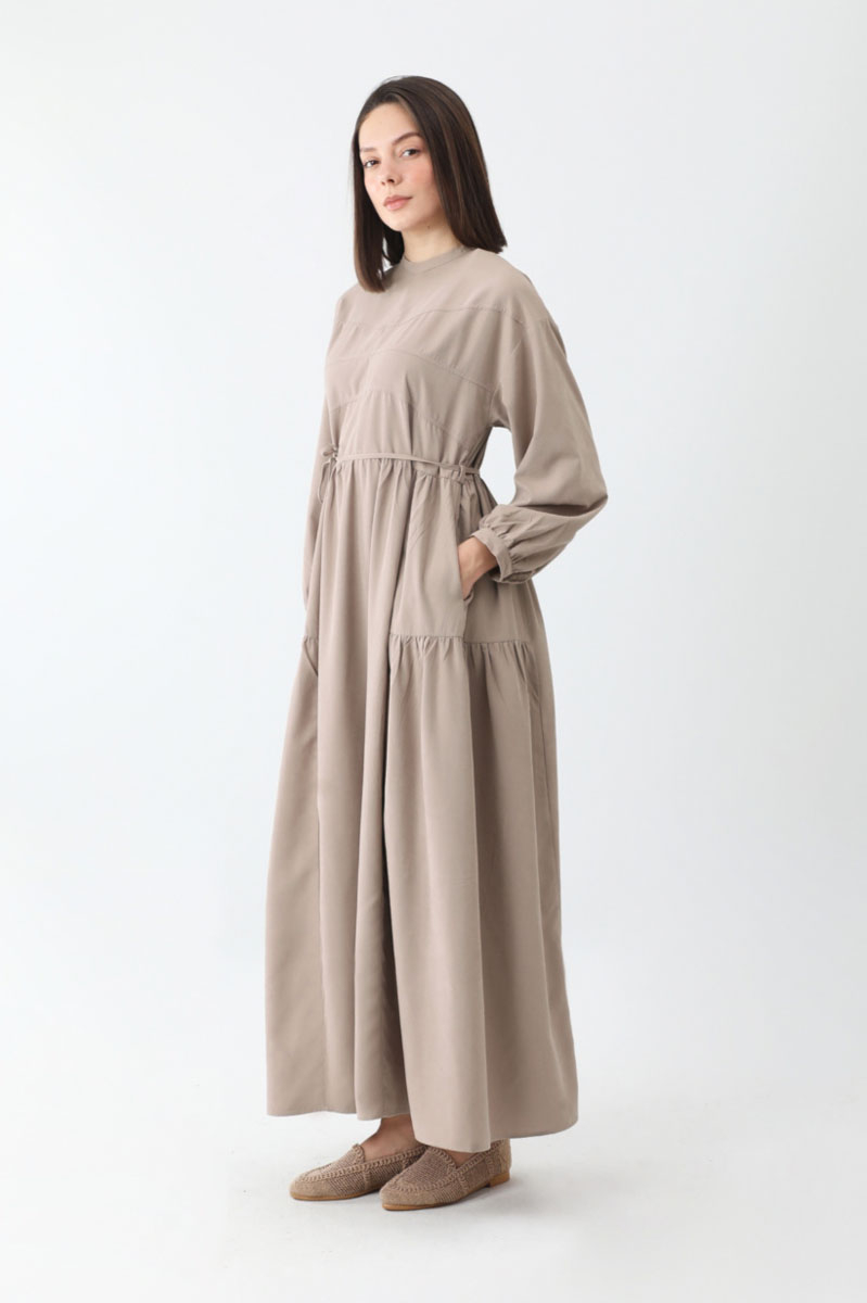 Günsu Elbise Vizon. Bisiklet yakadır, Önü roba parça dikiş detaylıdır, düşük kolludur, beli ve etek ucu yanları büzgülüdür,