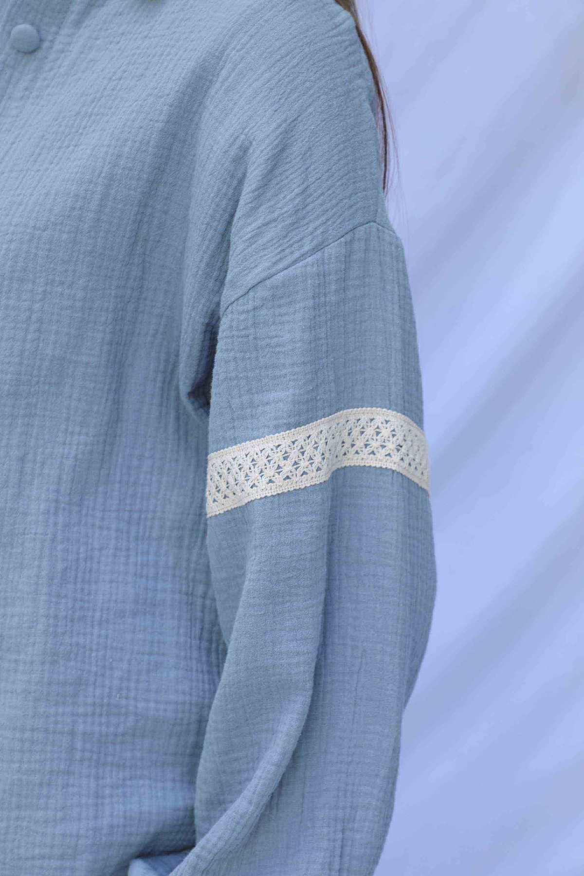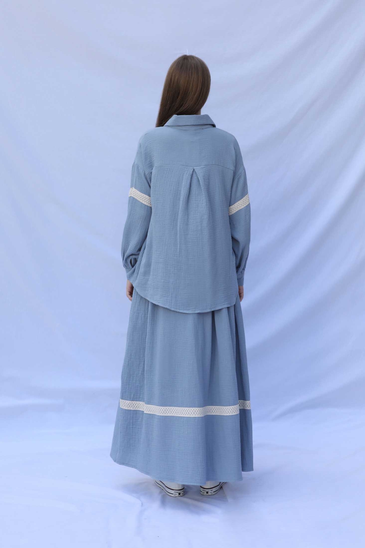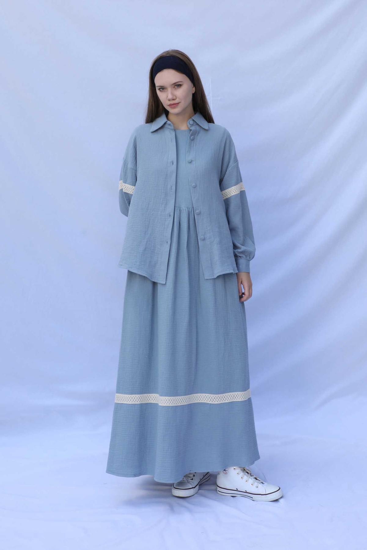 Güpür Gömlekli Elbise Bebe Mavisi. Bisiklet yakalıdır, sıfır koldur, arkadan fermuarlıdır, eteğinde güpür detayı vardır, astarsızdır. Gömlek: kolarında güpür detayı bulunmaktadır, arkadan a pileli ve düğmelidir. Takım olarak ve ayrı ayrı kombinlenebilir parçalardır.