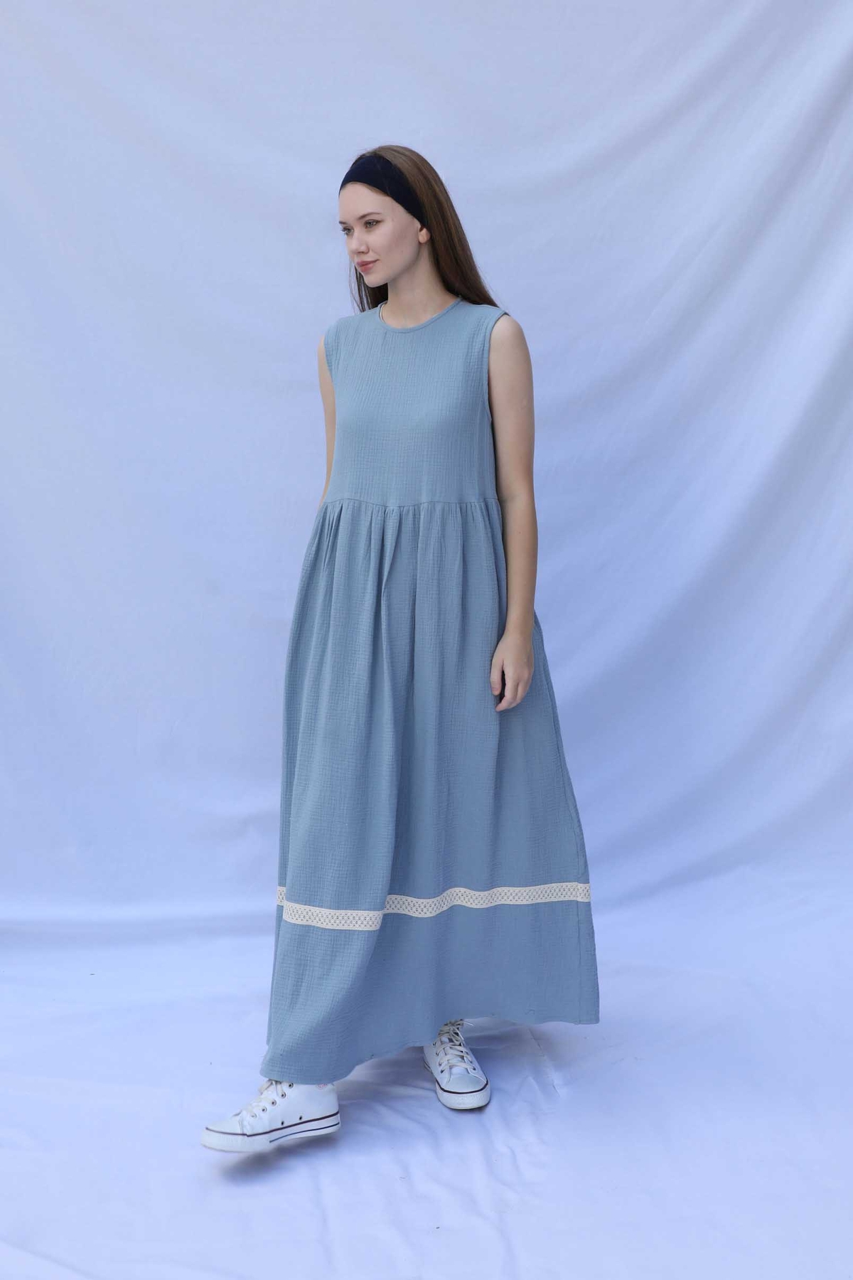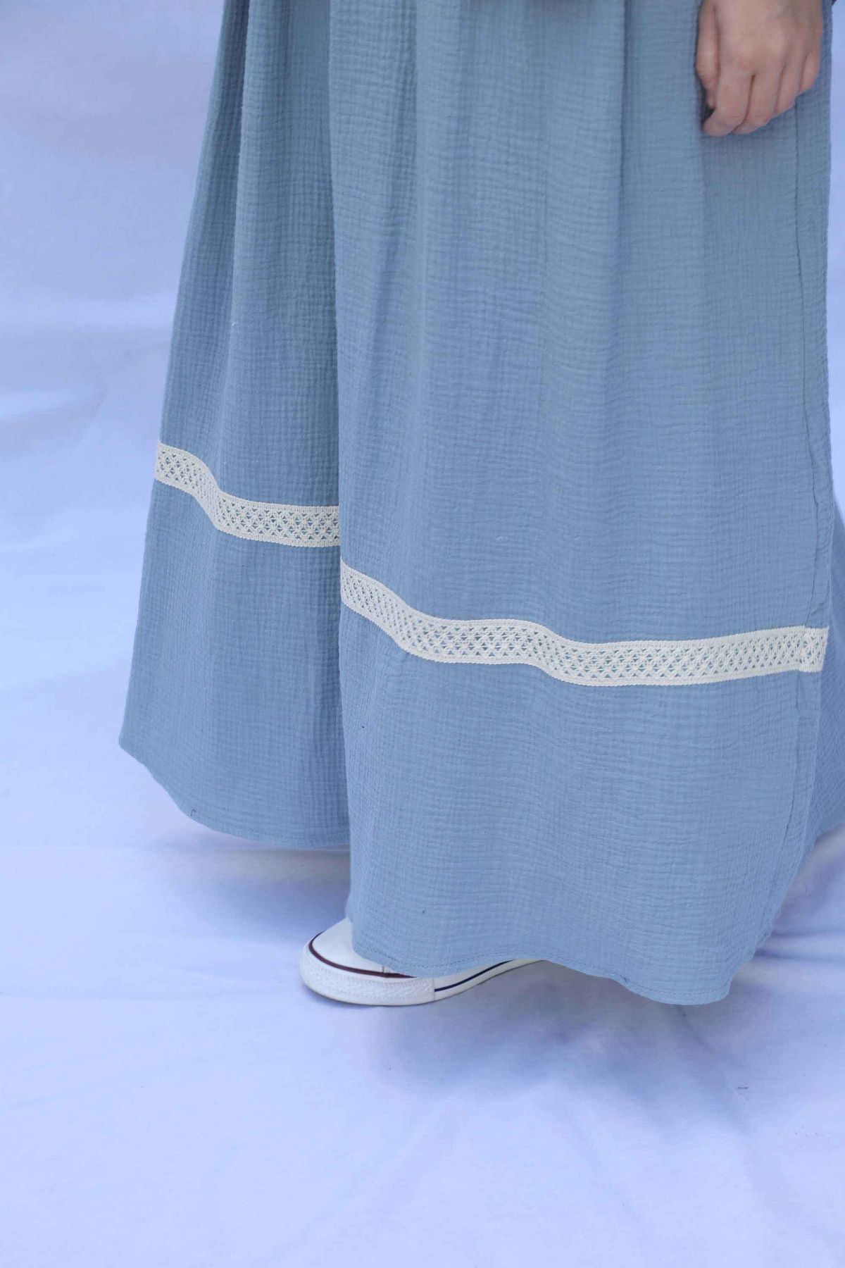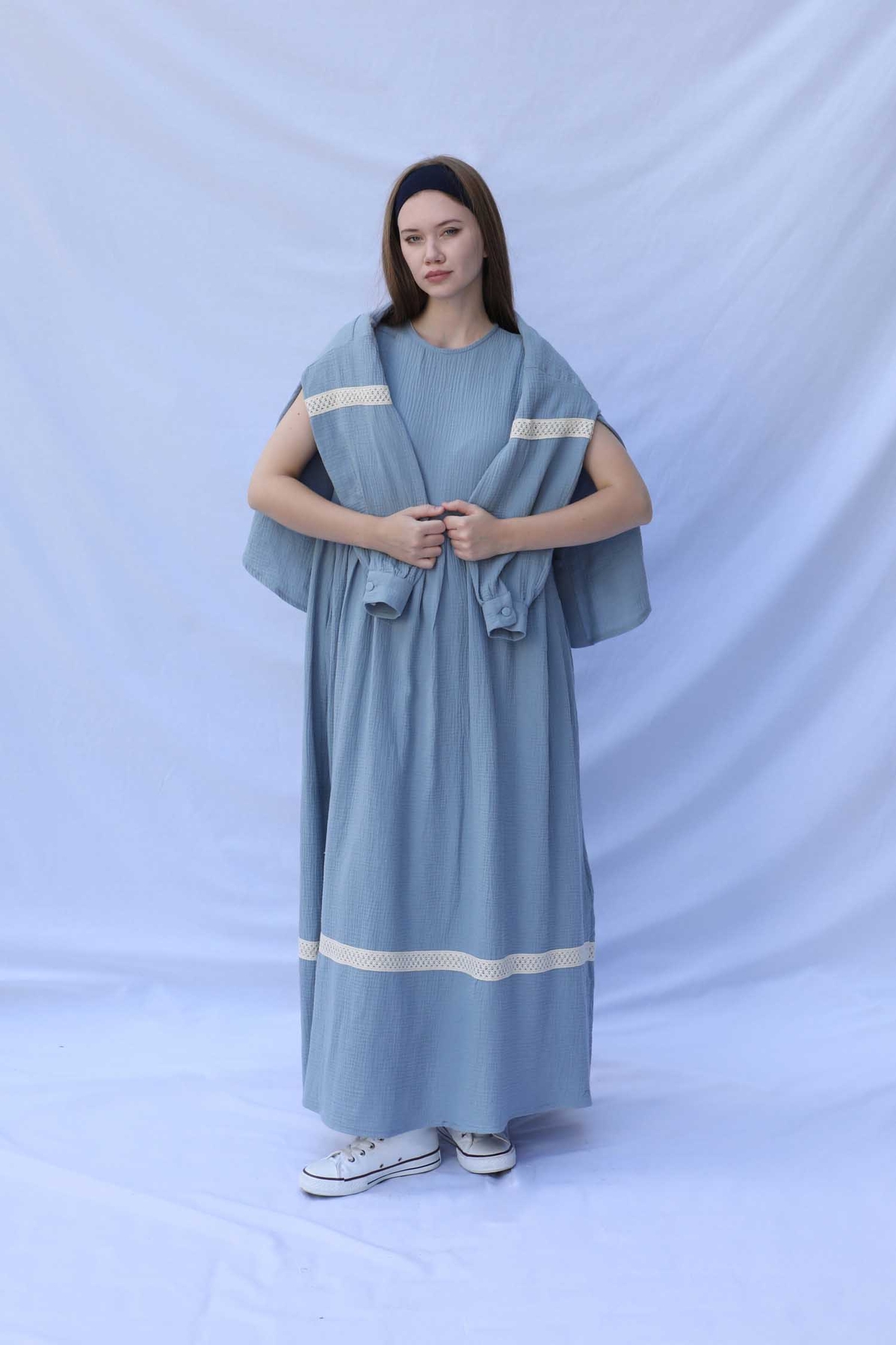 Güpür Gömlekli Elbise Bebe Mavisi. Bisiklet yakalıdır, sıfır koldur, arkadan fermuarlıdır, eteğinde güpür detayı vardır, astarsızdır. Gömlek: kolarında güpür detayı bulunmaktadır, arkadan a pileli ve düğmelidir. Takım olarak ve ayrı ayrı kombinlenebilir parçalardır.