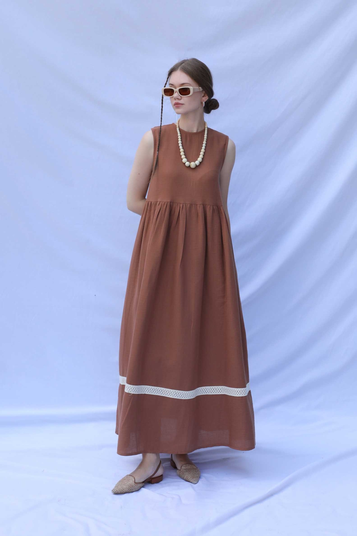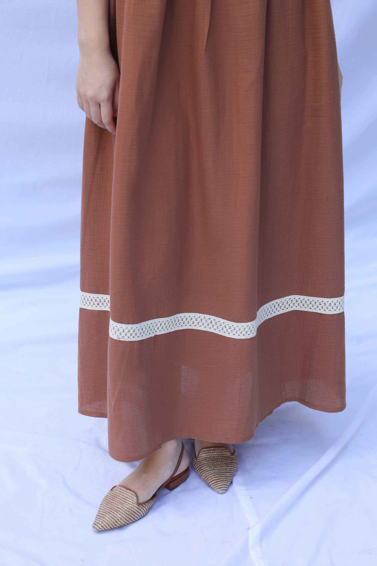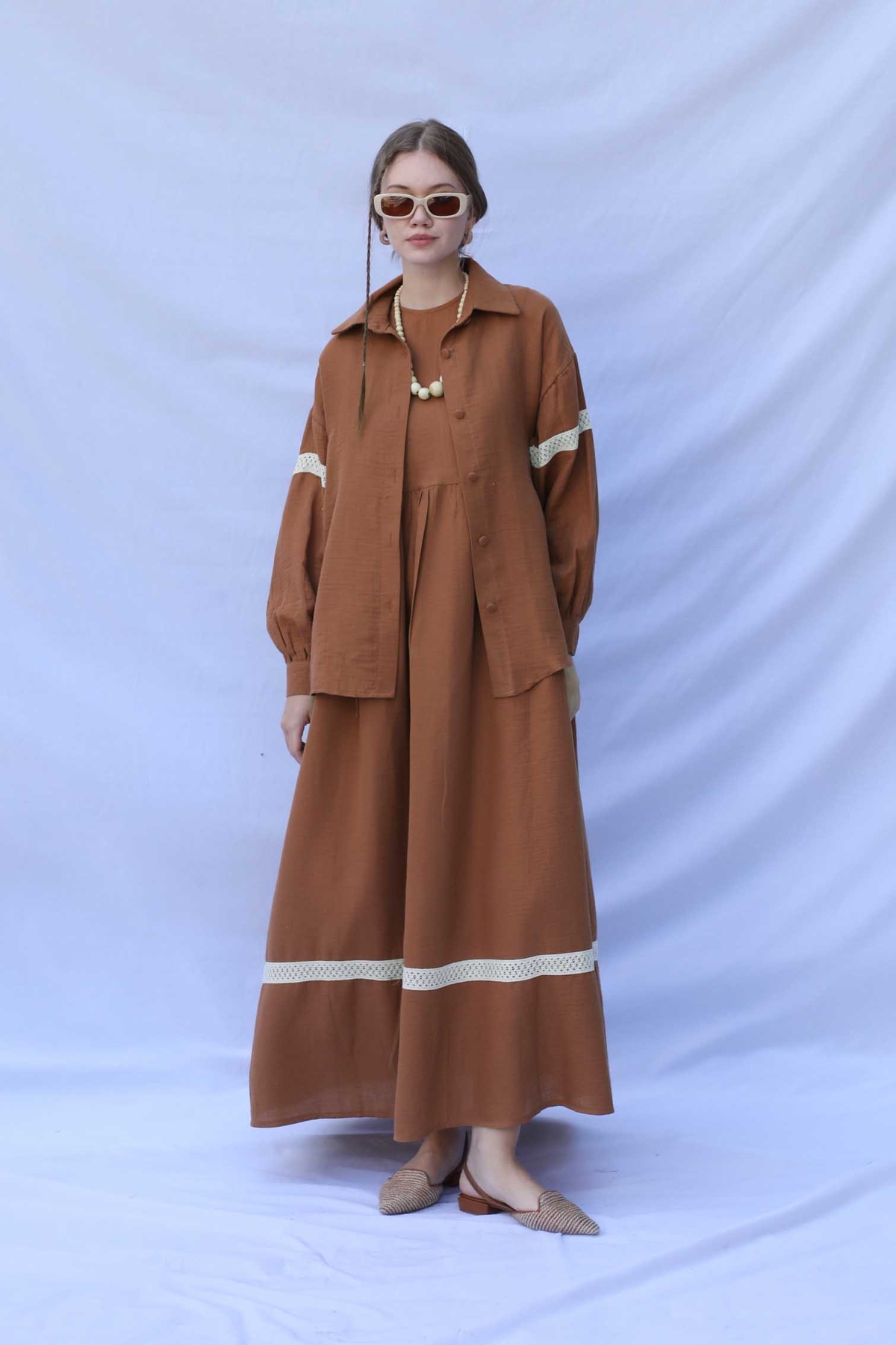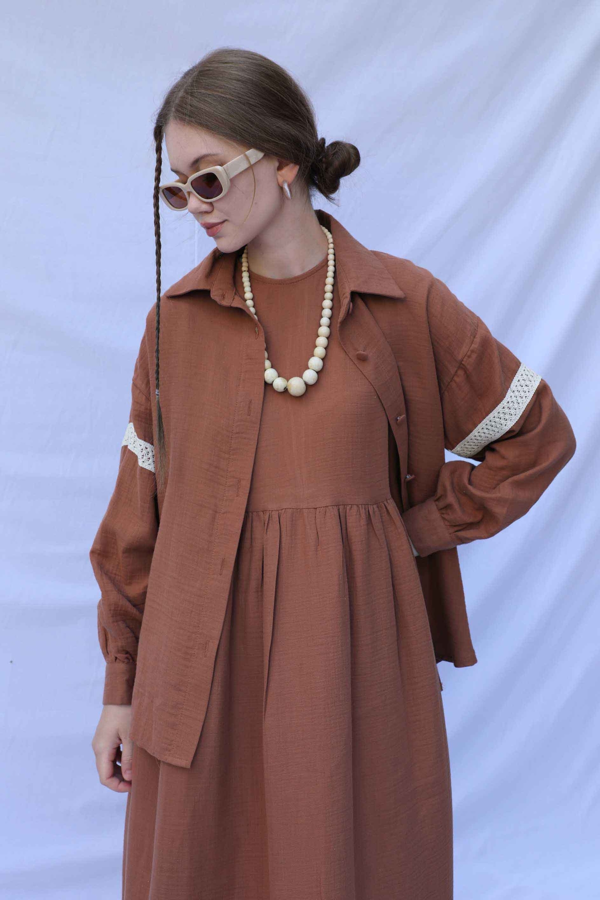 Güpür Gömlekli Elbise Kiremit. Bisiklet yakalıdır, sıfır koldur, arkadan fermuarlıdır, eteğinde güpür detayı vardır, astarsızdır. Gömlek: kolarında güpür detayı bulunmaktadır, arkadan a pileli ve düğmelidir. Takım olarak ve ayrı ayrı kombinlenebilir parçalardır.
