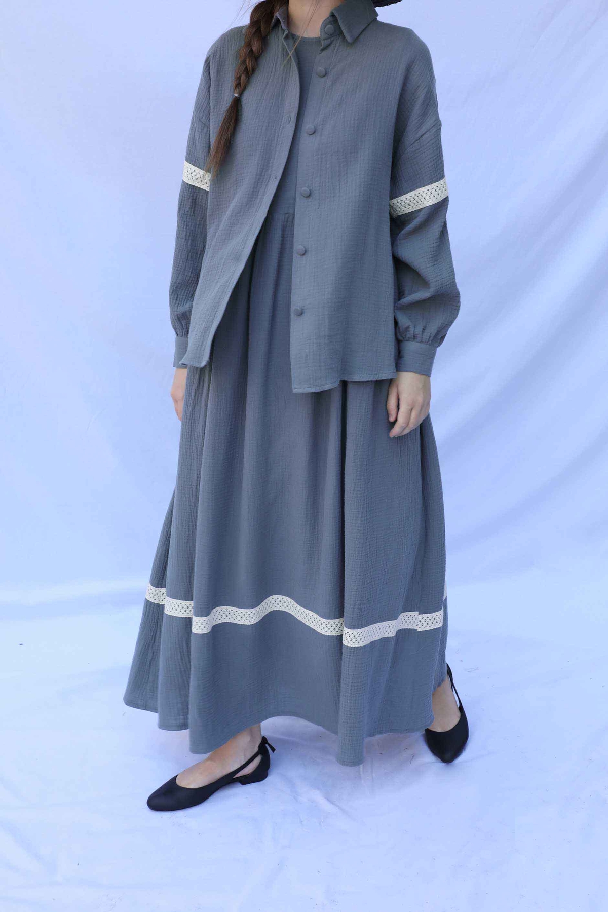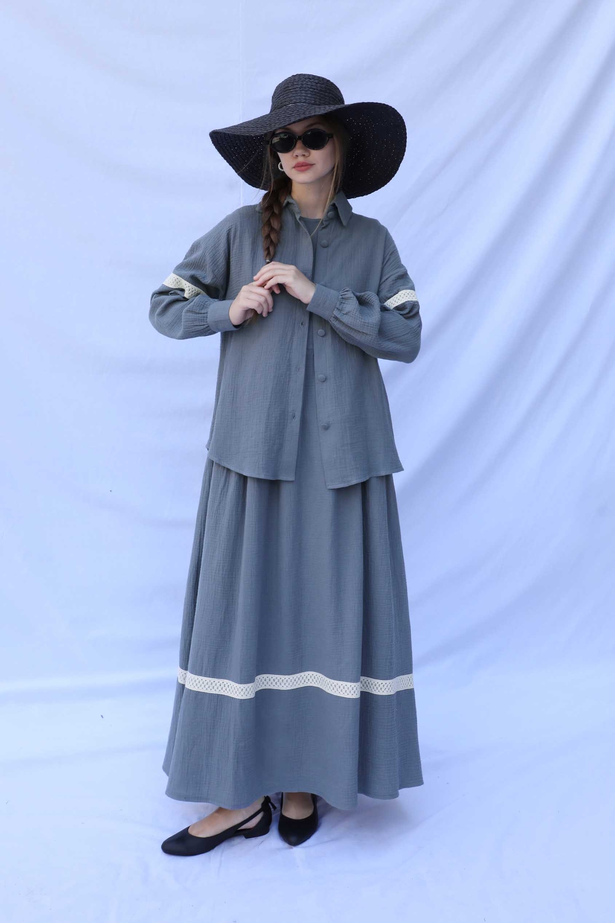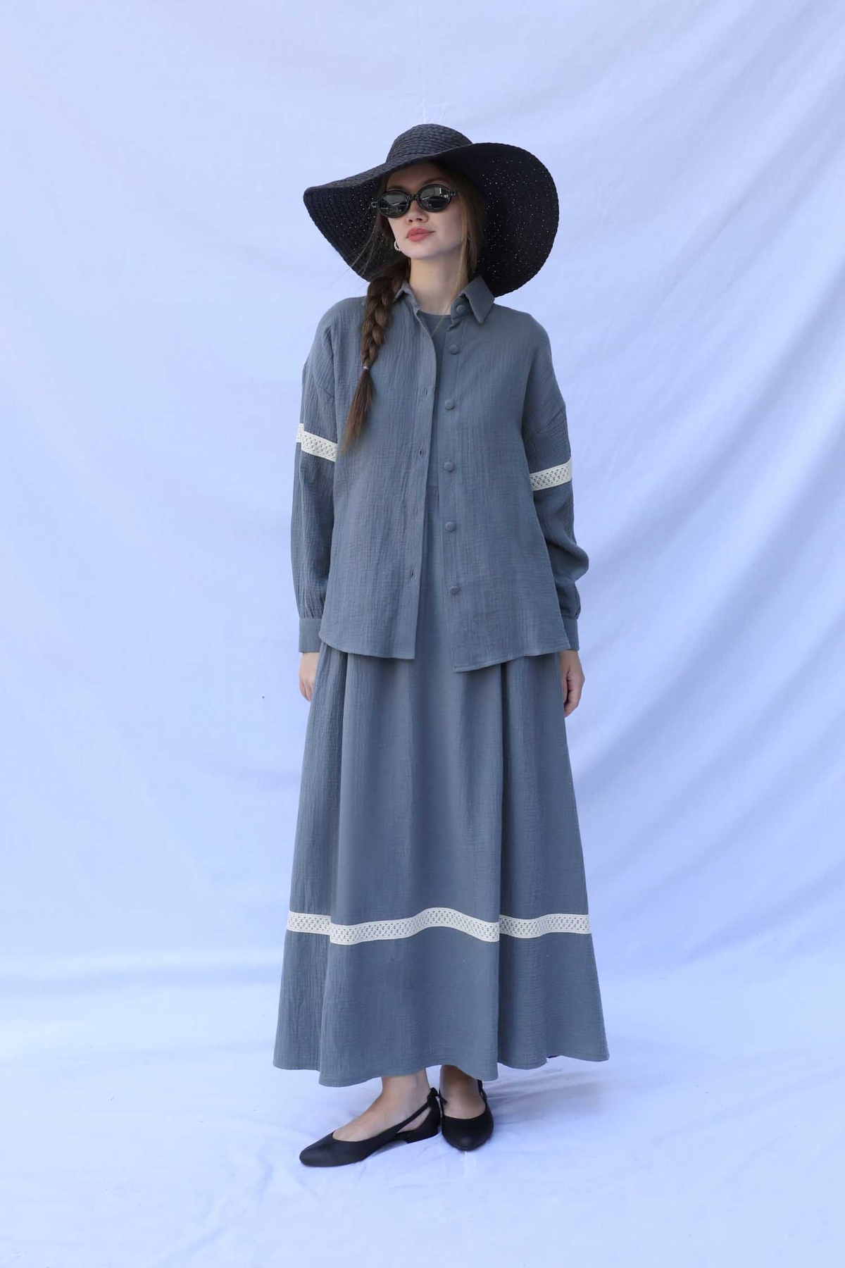 Güpür Gömlekli Elbise Koyu Gri. Bisiklet yakalıdır, sıfır koldur, arkadan fermuarlıdır, eteğinde güpür detayı vardır, astarsızdır. Gömlek: kolarında güpür detayı bulunmaktadır, arkadan a pileli ve düğmelidir. Takım olarak ve ayrı ayrı kombinlenebilir parçalardır.