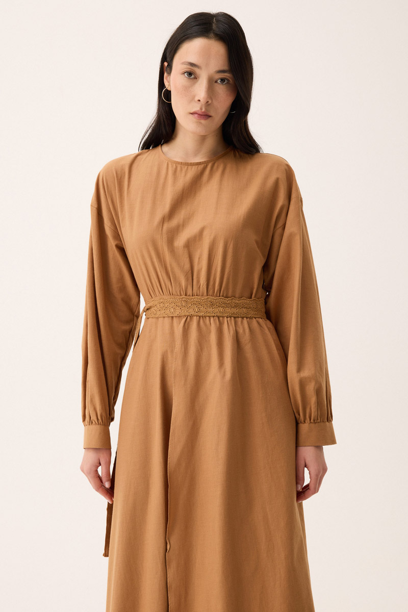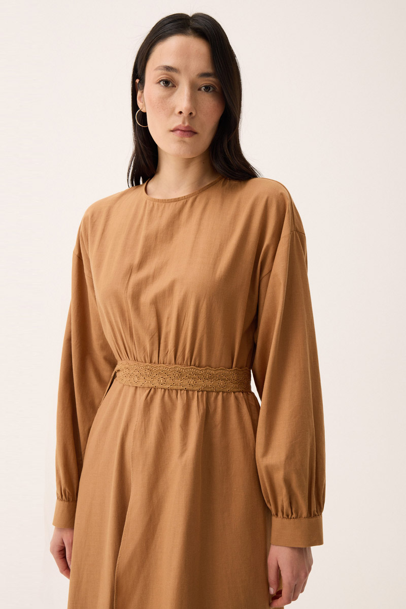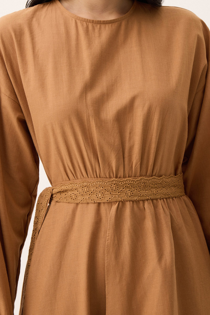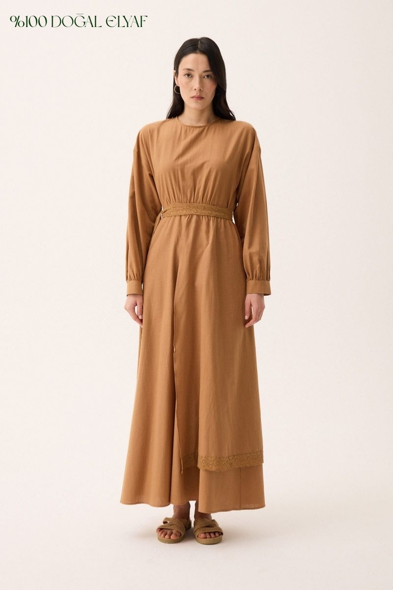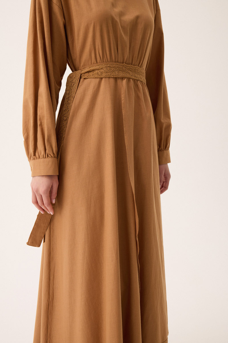 Güpürlü Zeren Elbise Açık Taba. Bisiklet yakadır, düşük omuzludur, Kemeri brode ve kumaş parça detaylıdır, kolları manşetli ve büzgülü beli kesik detaylıdır, cepsizdir, astarsızdır. Günlük kullanım için uygundur.