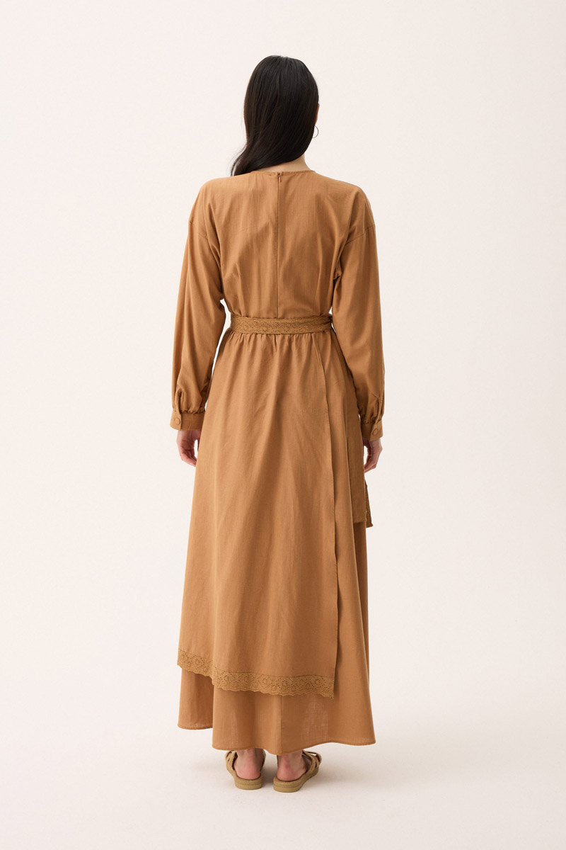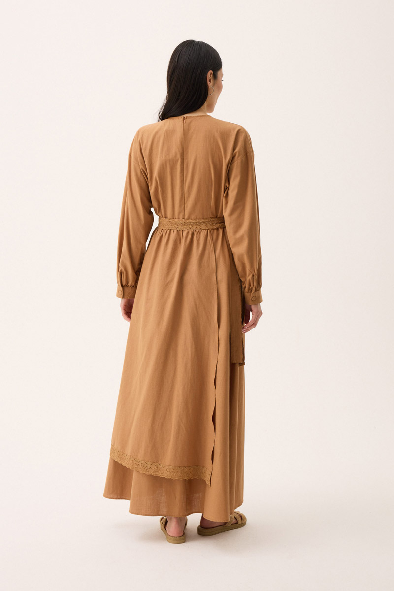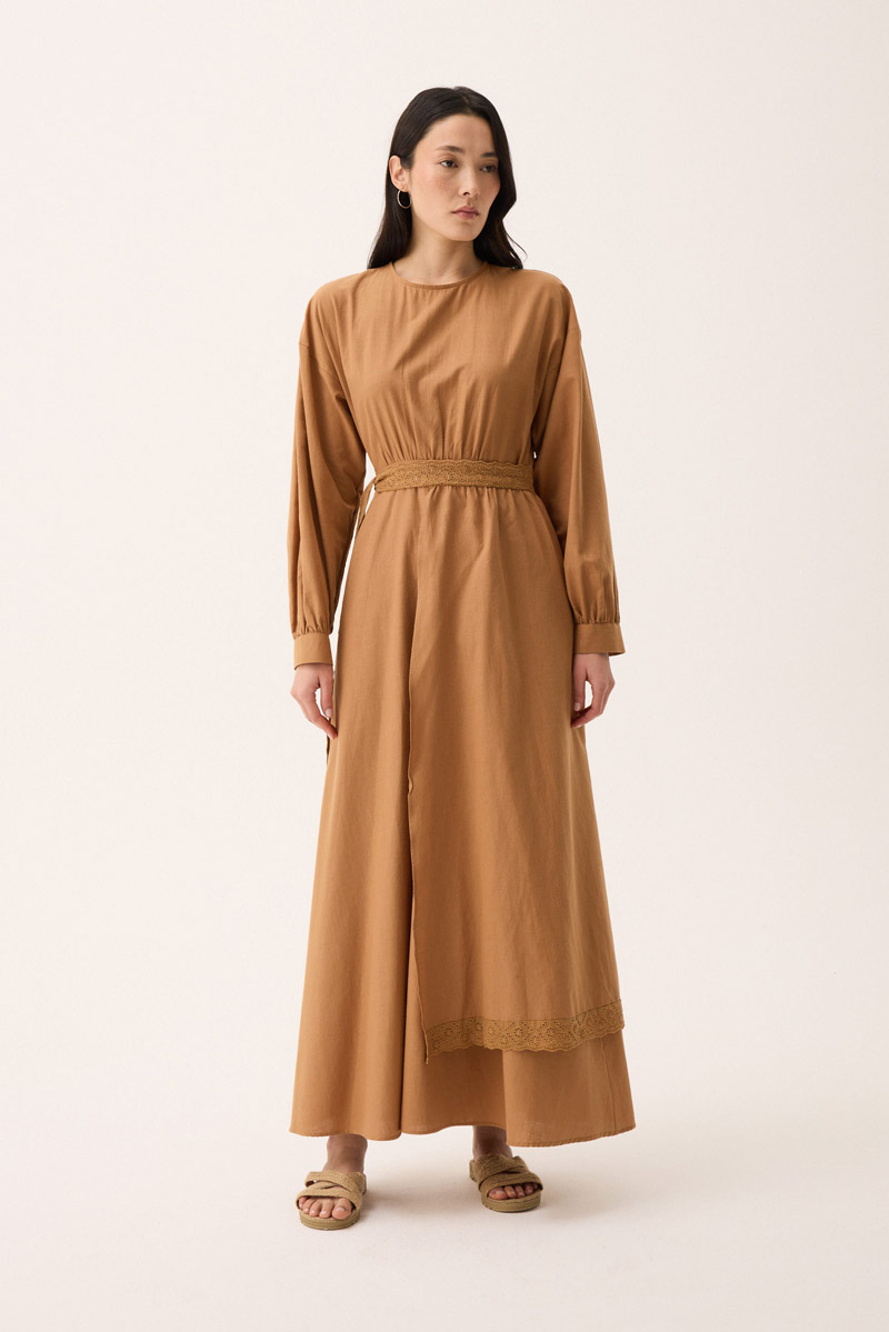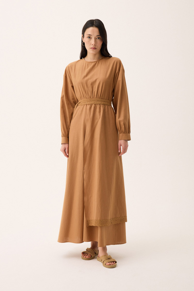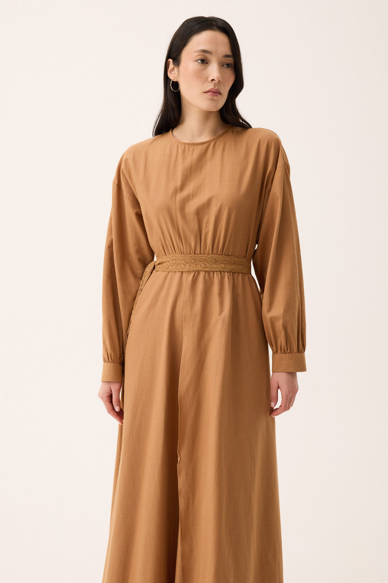 Güpürlü Zeren Elbise Açık Taba. Bisiklet yakadır, düşük omuzludur, Kemeri brode ve kumaş parça detaylıdır, kolları manşetli ve büzgülü beli kesik detaylıdır, cepsizdir, astarsızdır. Günlük kullanım için uygundur.