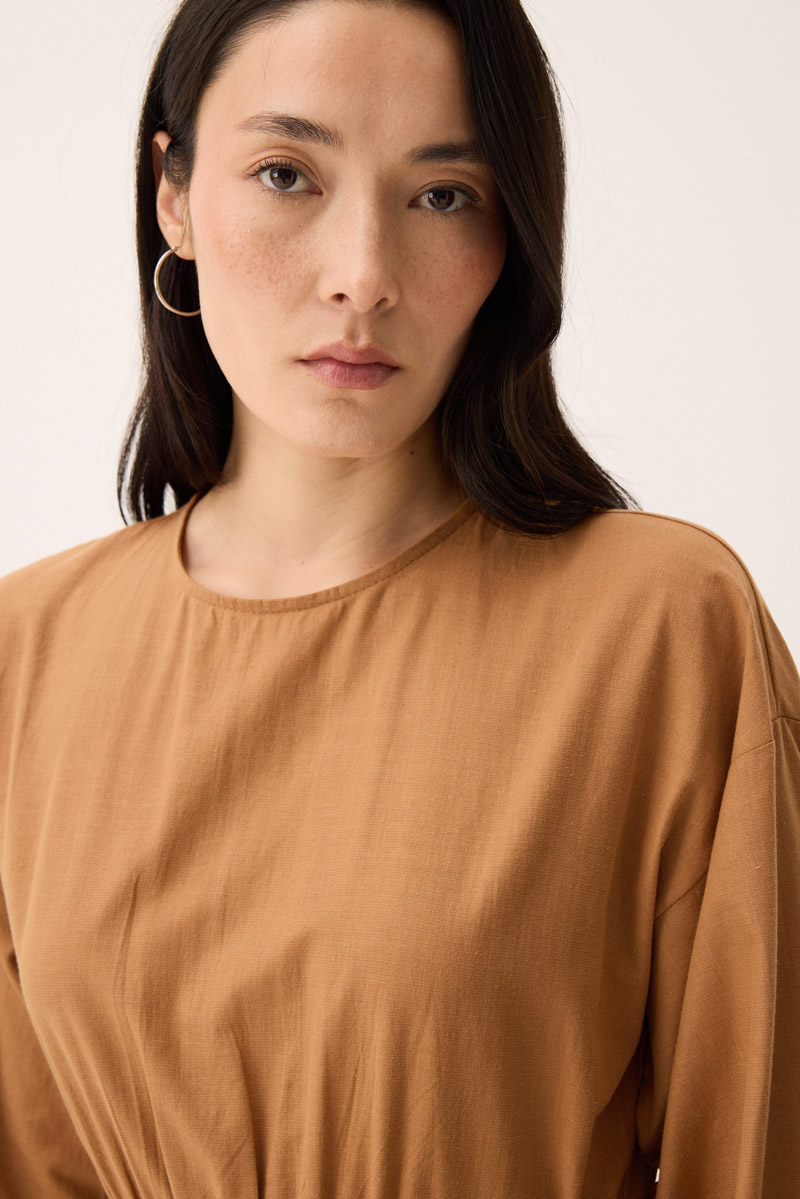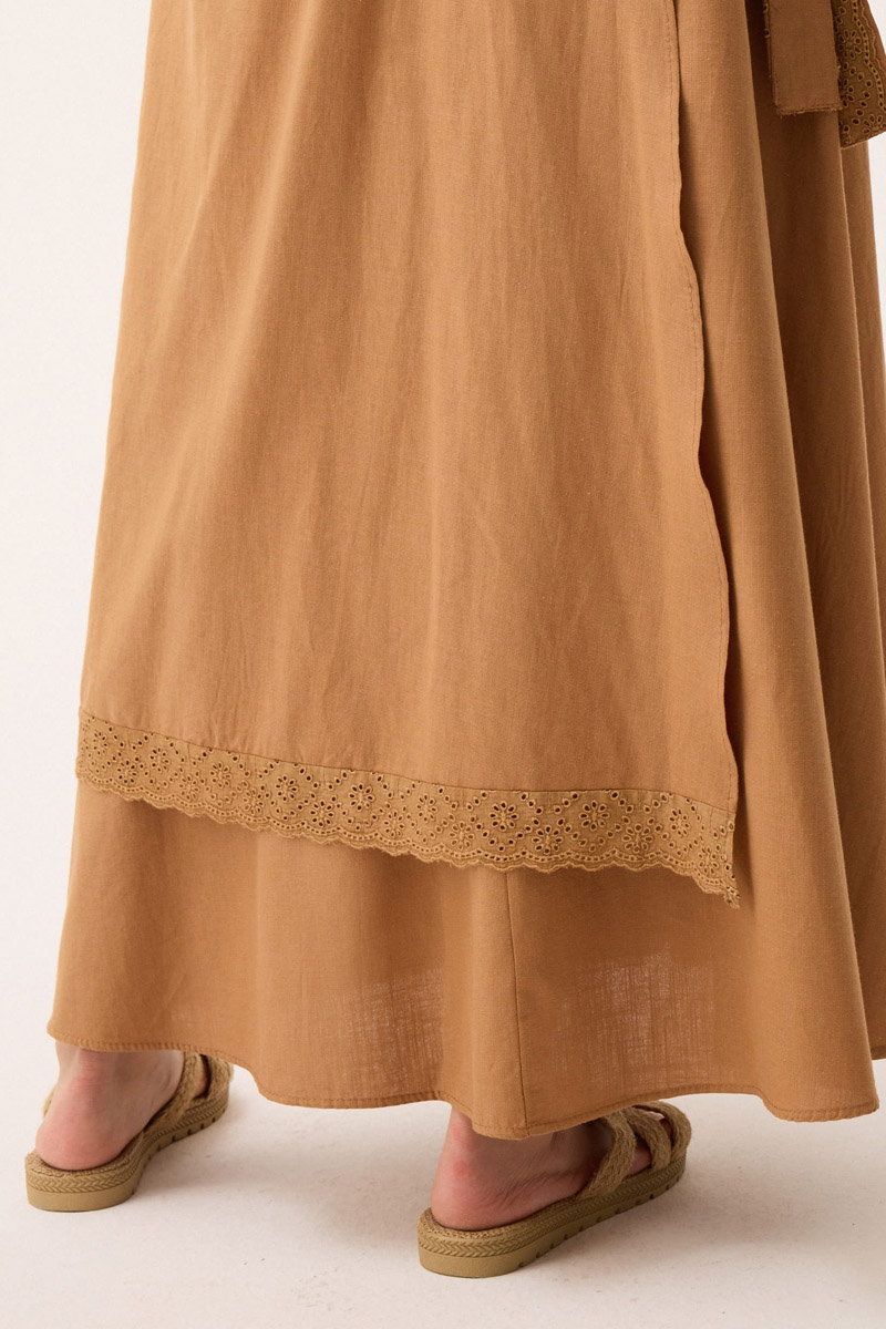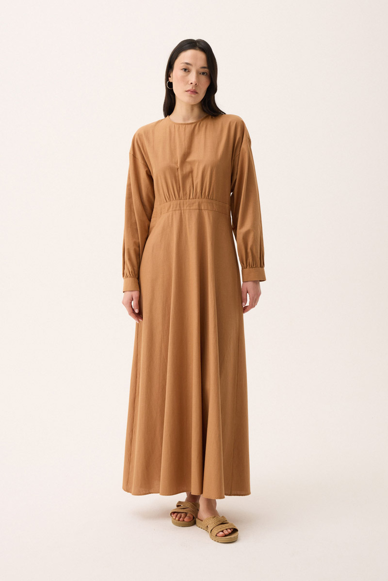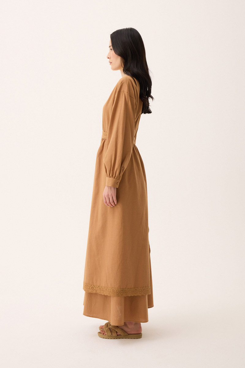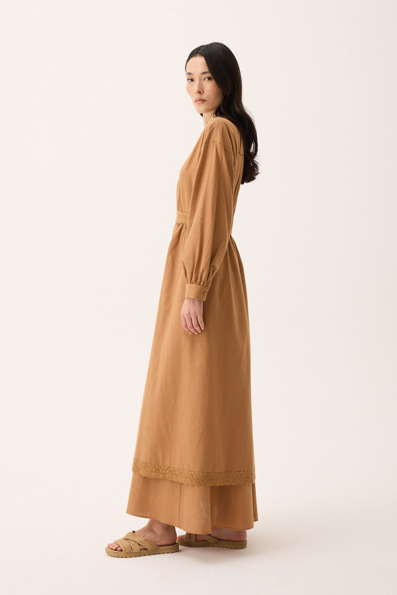 Güpürlü Zeren Elbise Açık Taba. Bisiklet yakadır, düşük omuzludur, Kemeri brode ve kumaş parça detaylıdır, kolları manşetli ve büzgülü beli kesik detaylıdır, cepsizdir, astarsızdır. Günlük kullanım için uygundur.