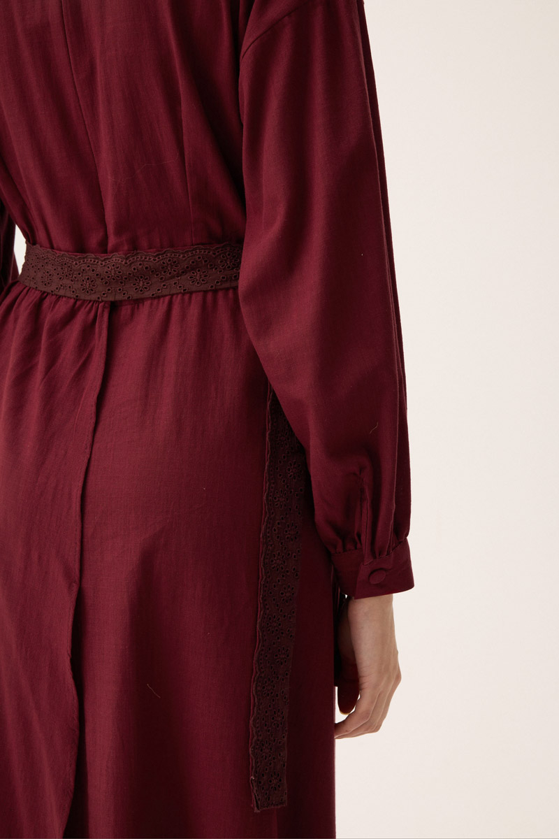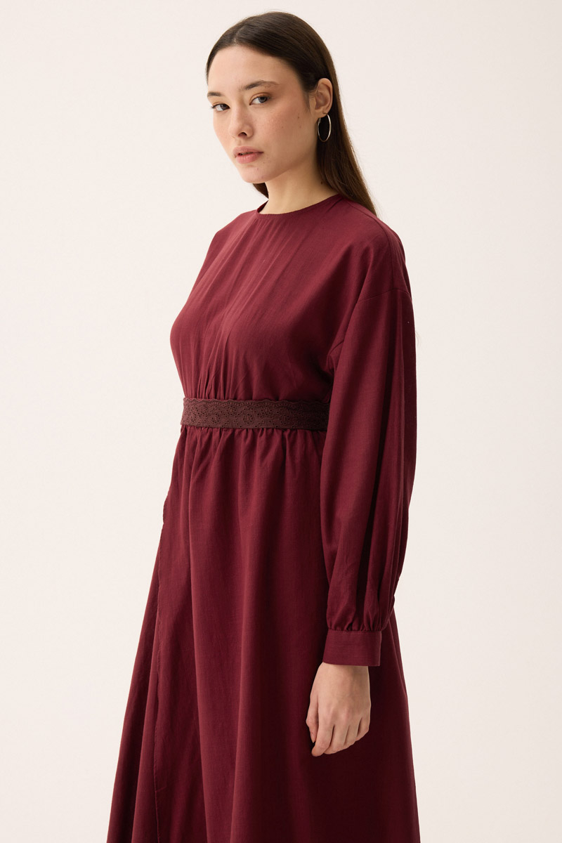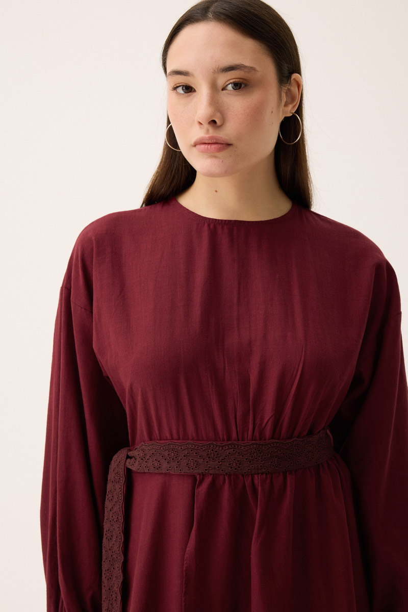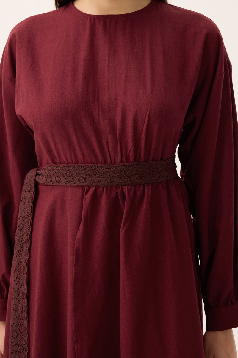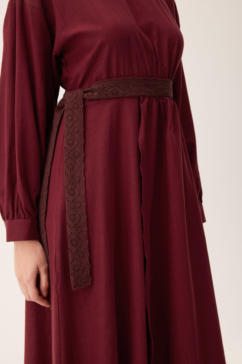 Güpürlü Zeren Elbise Bordo. Bisiklet yakadır, düşük omuzludur, Kemeri brode ve kumaş parça detaylıdır, kolları manşetli ve büzgülü beli kesik detaylıdır, cepsizdir, astarsızdır. Günlük kullanım için uygundur.