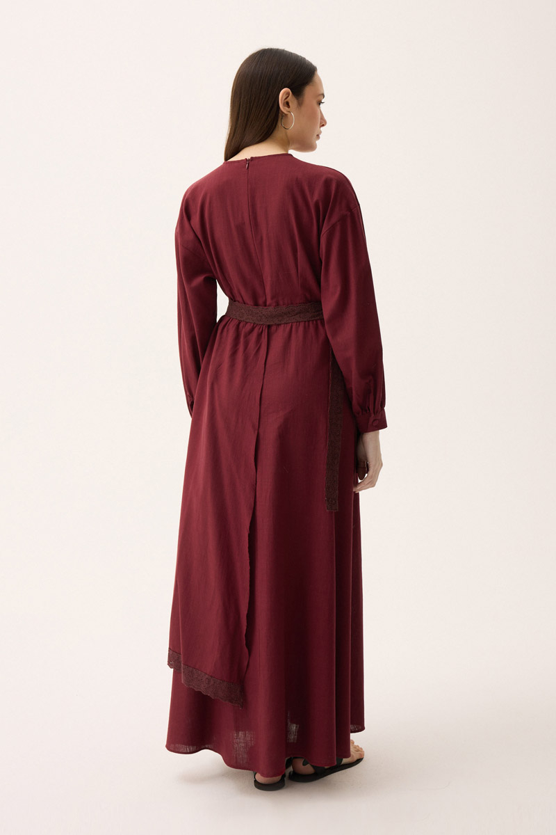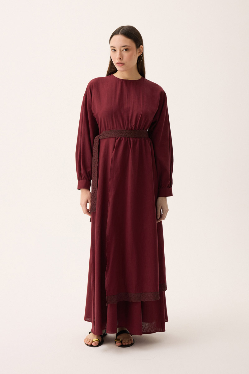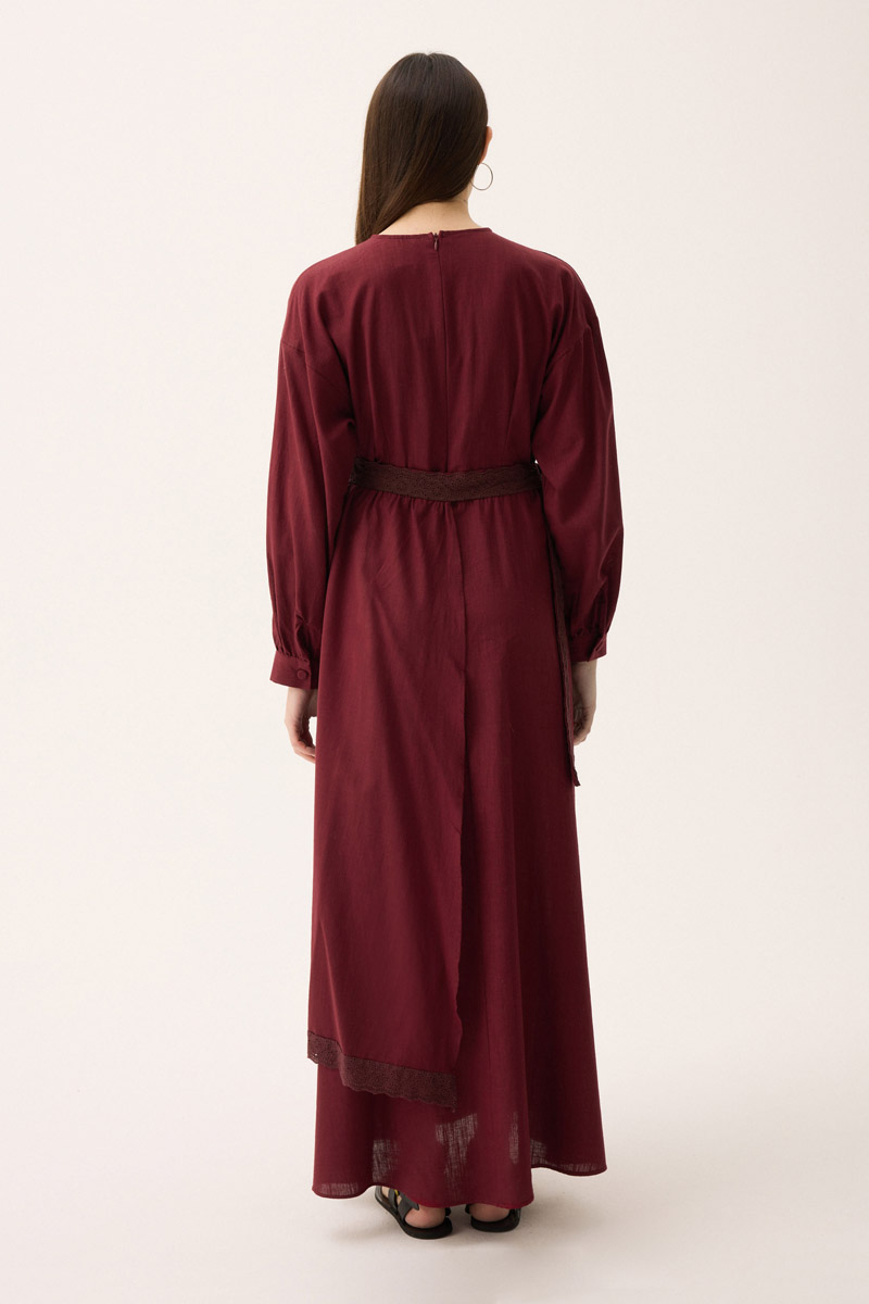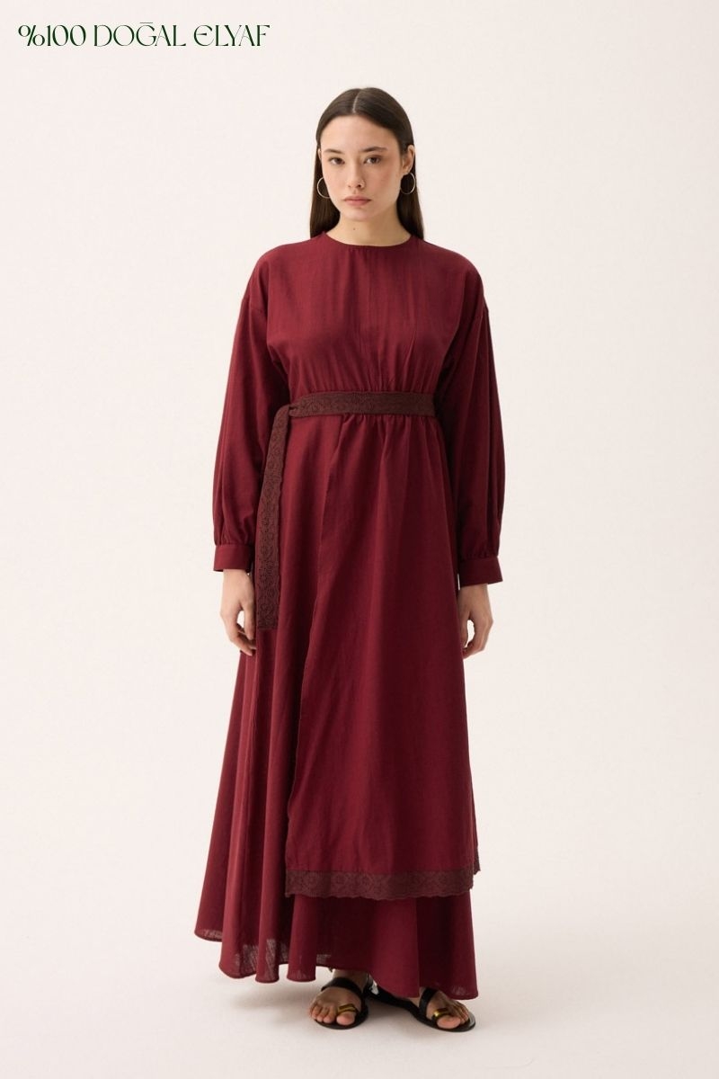 Güpürlü Zeren Elbise Bordo. Bisiklet yakadır, düşük omuzludur, Kemeri brode ve kumaş parça detaylıdır, kolları manşetli ve büzgülü beli kesik detaylıdır, cepsizdir, astarsızdır. Günlük kullanım için uygundur.