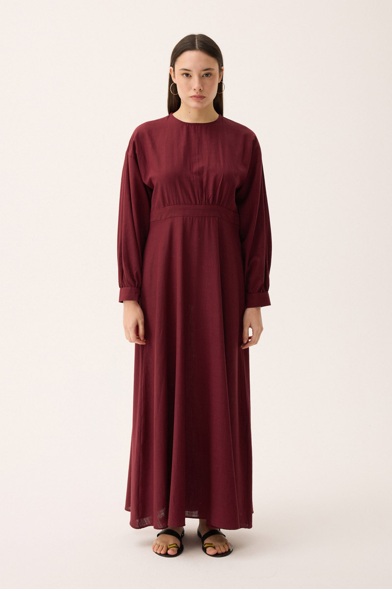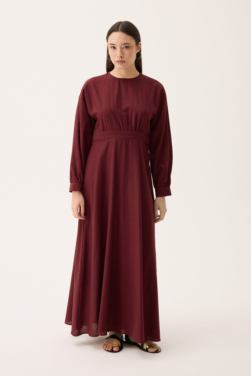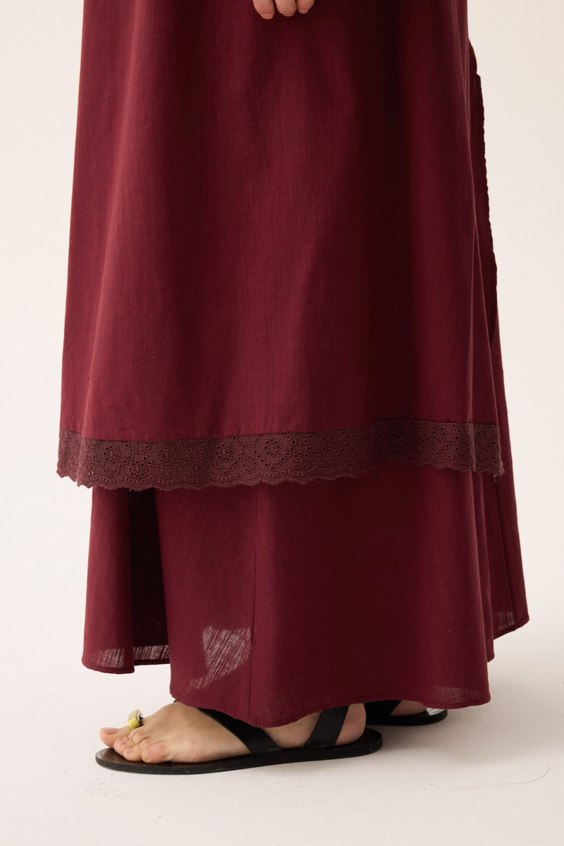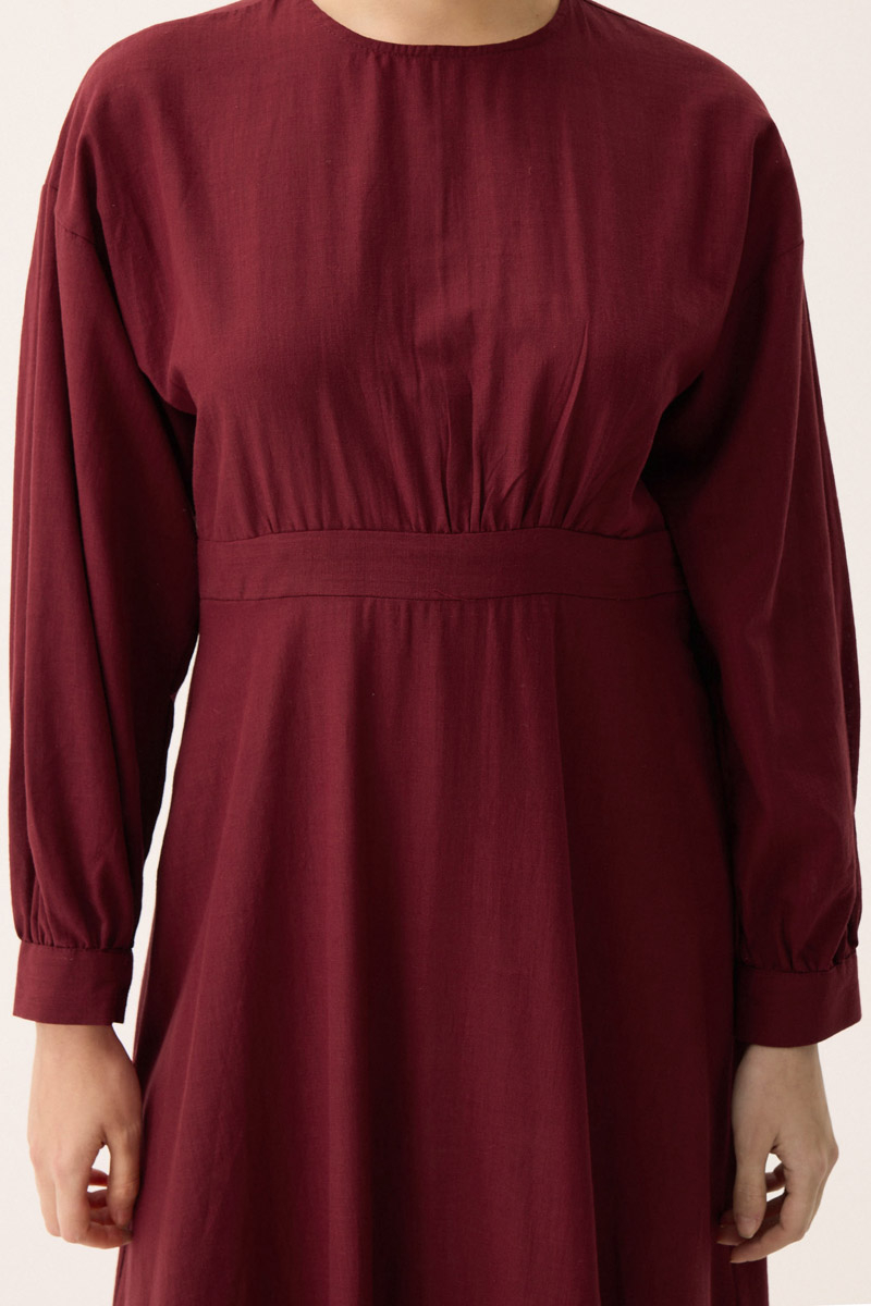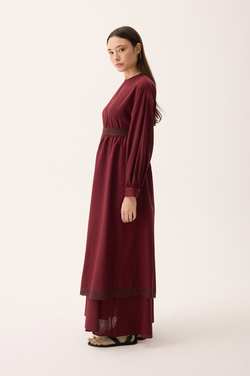 Güpürlü Zeren Elbise Bordo. Bisiklet yakadır, düşük omuzludur, Kemeri brode ve kumaş parça detaylıdır, kolları manşetli ve büzgülü beli kesik detaylıdır, cepsizdir, astarsızdır. Günlük kullanım için uygundur.