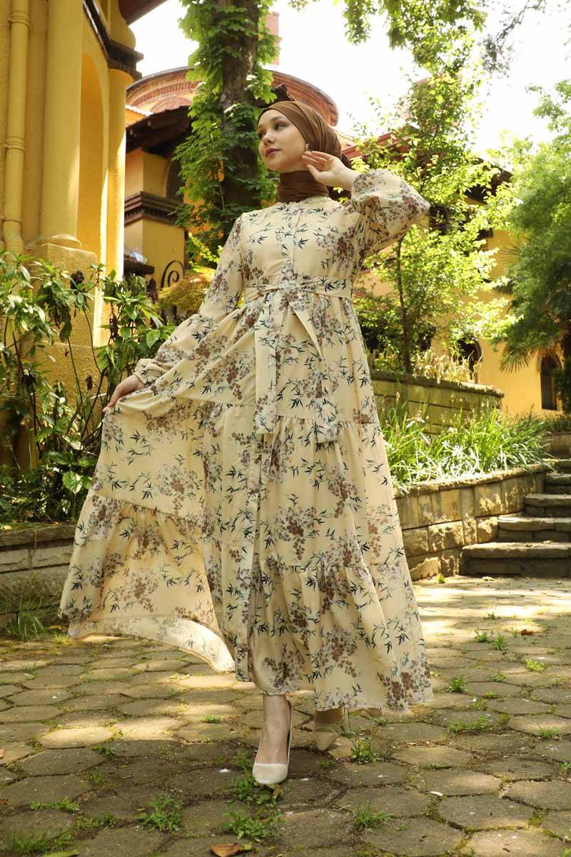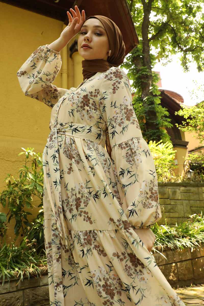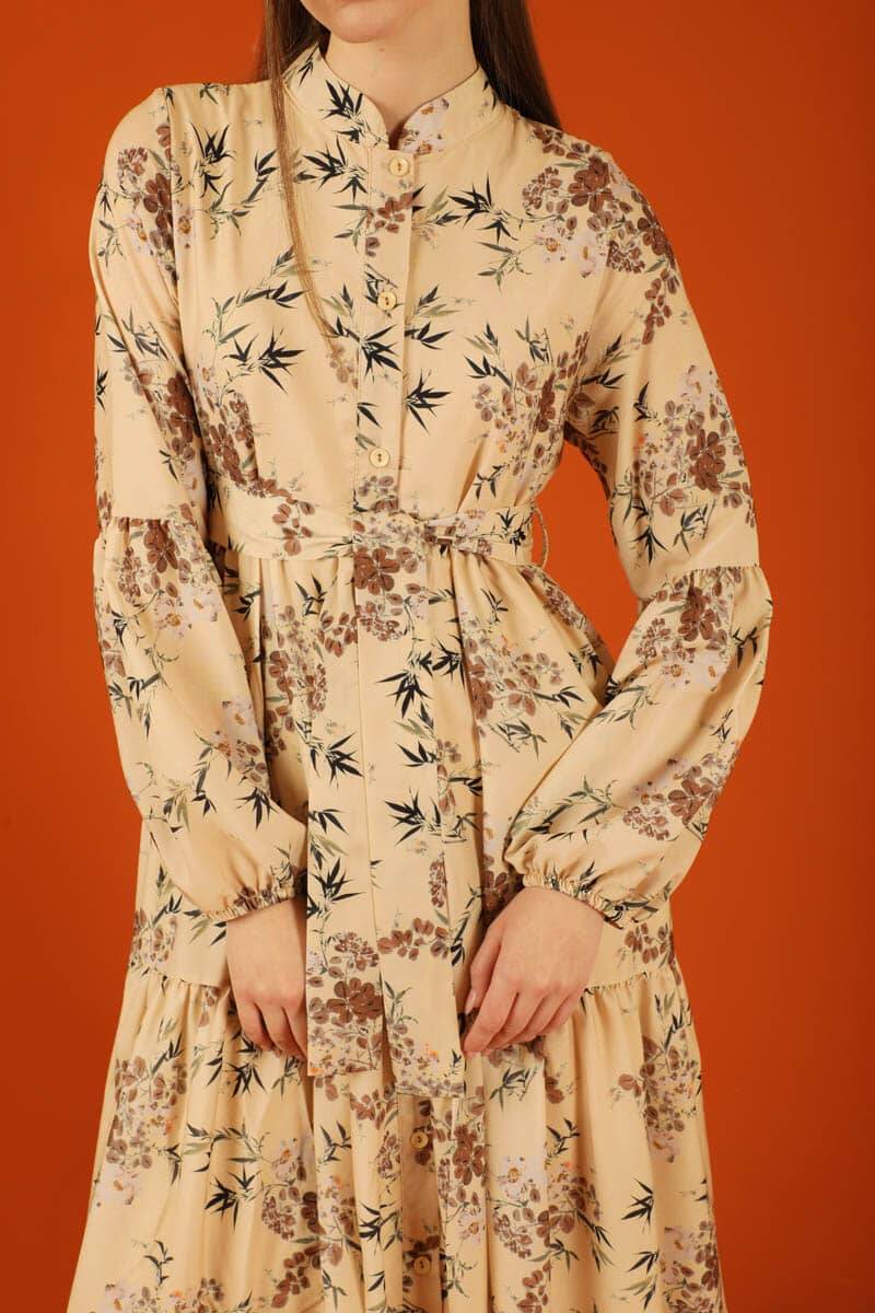 Hakim Yaka Çiçekli Elbise Taba