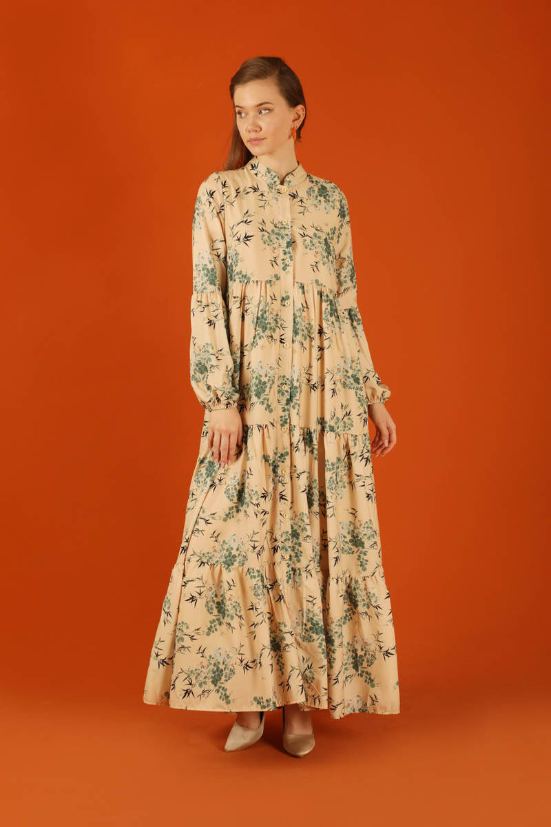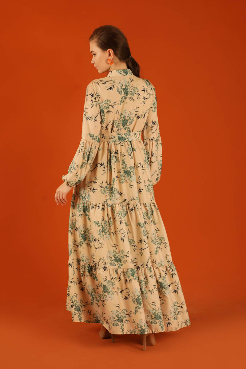 Judge Collar Floral Dress Green. It is lined. The cuff is elastic. It is belted. It should be buttoned. It's a normal pattern. You can choose it on a daily basis or on your special days.