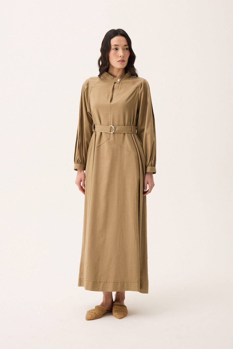 Hakim Yaka Dikişli Keten Elbise Camel. Hakim yakadır, yakası üçgen dikiş detaylı olup düğme ile katlanabilir detaylıdır. reglan kolludur, önden dikiş detaylıdır, yadan gizli ceplidir, kuşaklıdır, astarsızdır.