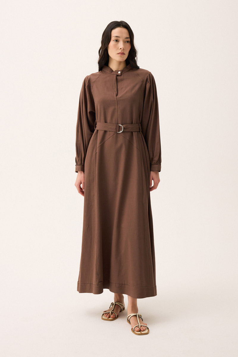 Hakim Yaka Dikişli Keten Elbise Kahverengi