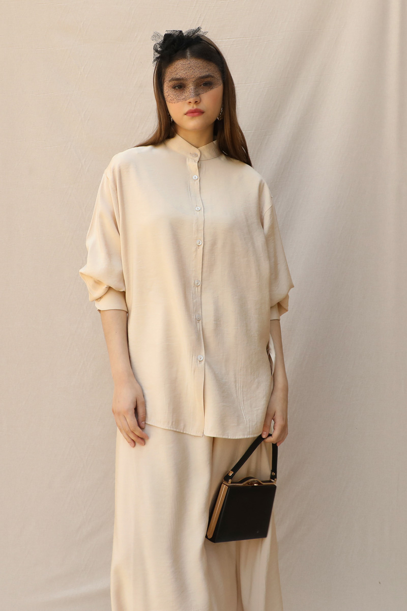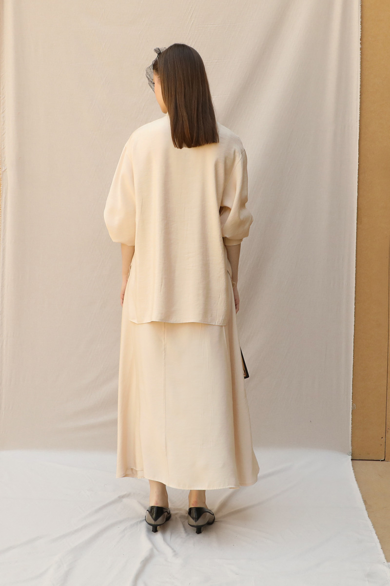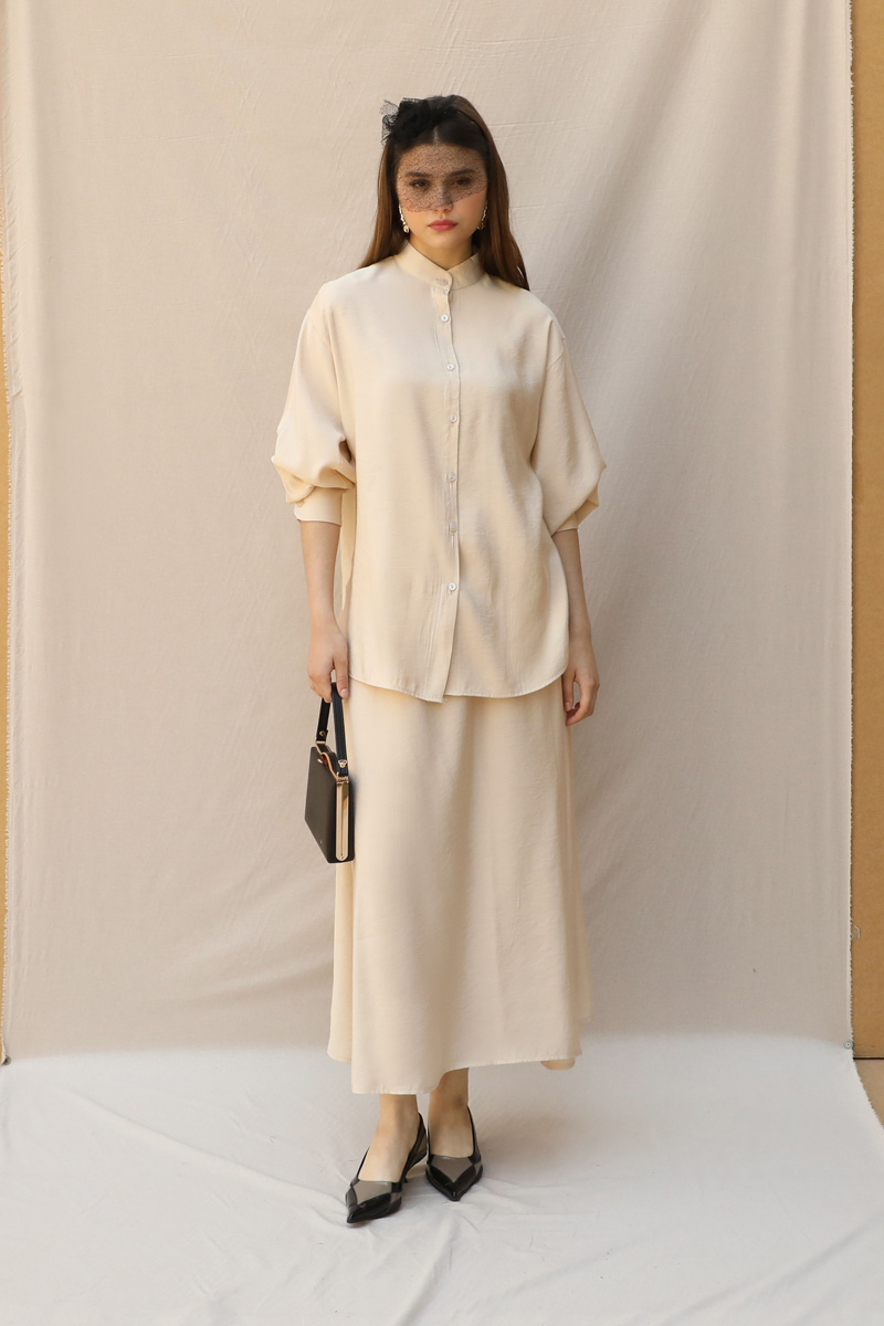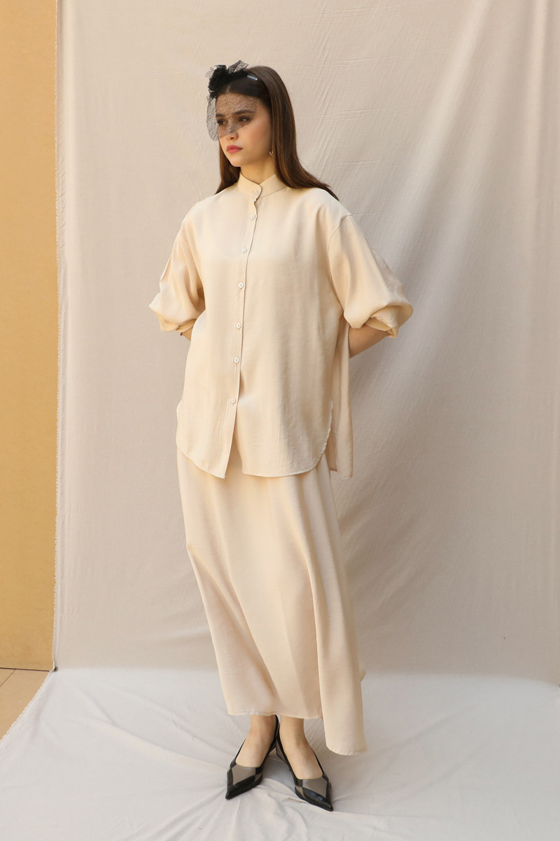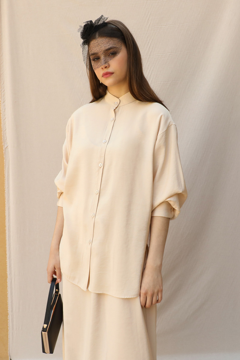Hakim Yaka Etek Takım Krem.Hakim yakalıdır. Hafif düşük omuzludur. Manşeti kalındır. Düğmelidir. Etek beli lastiklidir, cepsizdir, astarsızdır. Ürün kuşaksızdır, görselde aksesuar olarak kuşak kullanılmıştır.