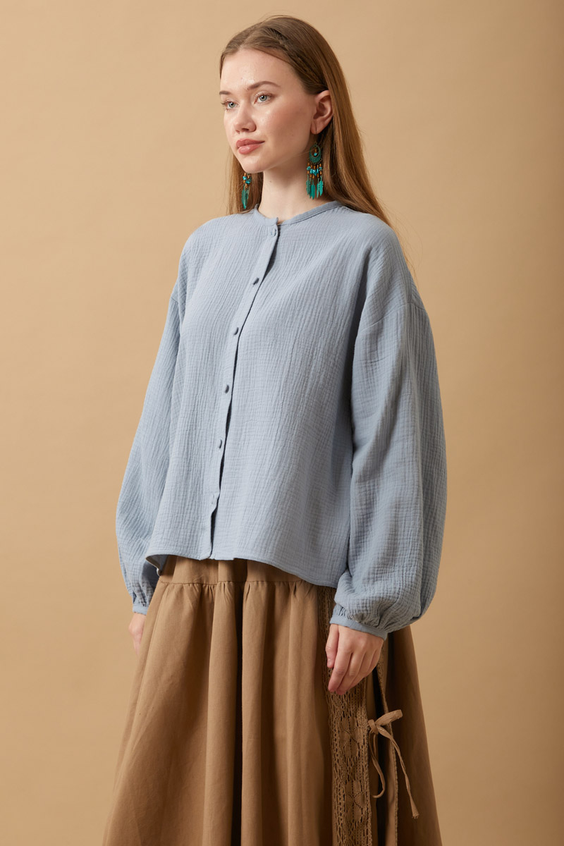 Hakim Yaka Müslin Gömlek Bebe Mavisi, hafif yapısıyla gün boyu konfor sunuyor. %100 pamuk müslin kumaştan üretilen bu parça, nefes alabilir dokusu sayesinde yaz ve bahar aylarında vazgeçilmeziniz olacak.