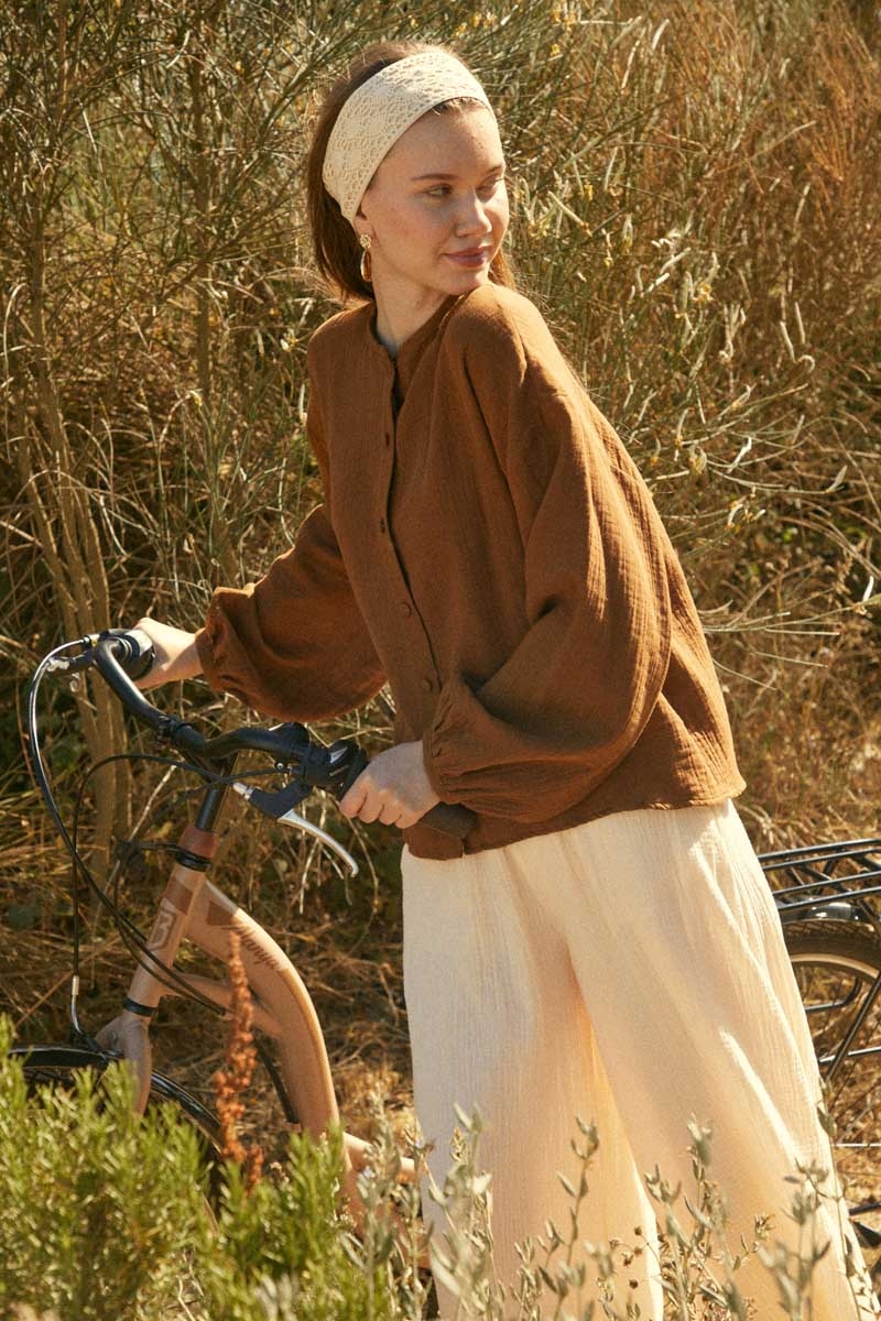 Hakim Yaka Müslin Gömlek Kahverengi, hafif yapısıyla gün boyu konfor sunuyor. %100 pamuk müslin kumaştan üretilen bu parça, nefes alabilir dokusu sayesinde yaz ve bahar aylarında vazgeçilmeziniz olacak.