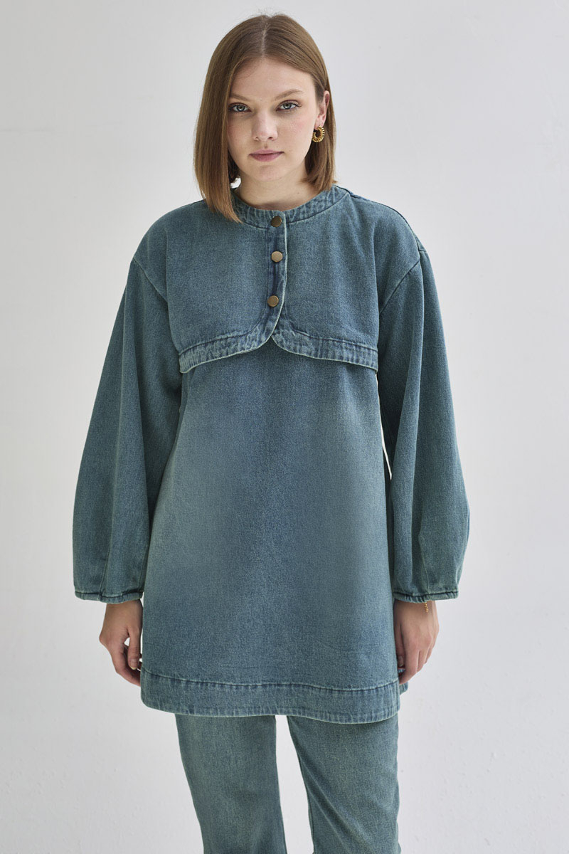 With its modern and relaxed silhouette, this tunic is a must-have piece for everyday outfits. The front placket and half-button detail add a touch of elegance, while the denim fabric ensures durability and comfort. A timeless piece, it can be easily styled with trousers or skirts for versatile looks.