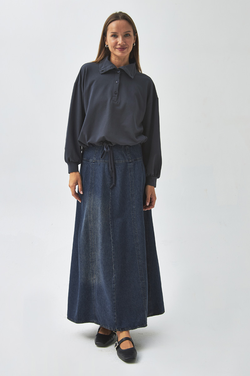 With its relaxed fit and modern details, this sweatshirt is a must-have for everyday styling. The polo collar and half-button design offer a sporty-chic look, while the adjustable drawstring at the waist allows you to create different silhouettes. Thanks to its soft and comfortable structure, it pairs effortlessly with jeans, skirts, or jogger pants for versatile daily outfits.