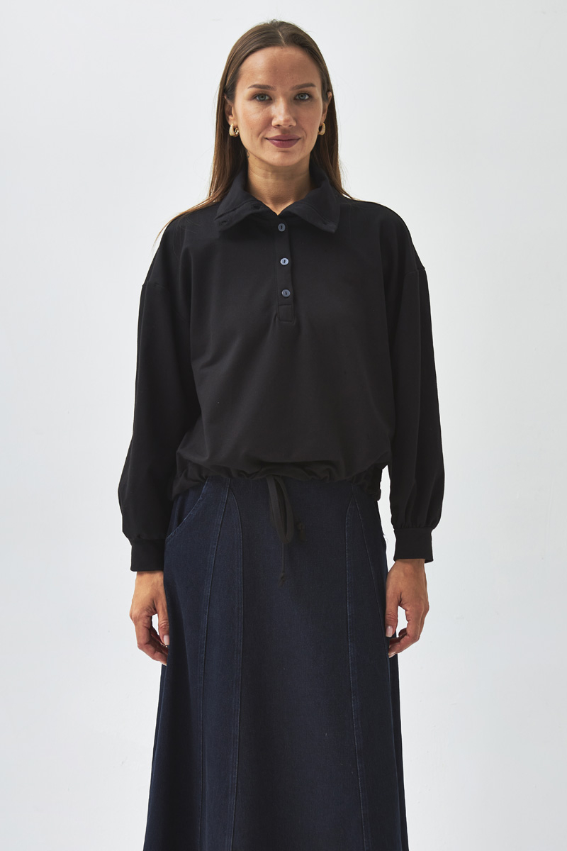 With its relaxed fit and modern details, this sweatshirt is a must-have for everyday styling. The polo collar and half-button design offer a sporty-chic look, while the adjustable drawstring at the waist allows you to create different silhouettes. Thanks to its soft and comfortable structure, it pairs effortlessly with jeans, skirts, or jogger pants for versatile daily outfits.