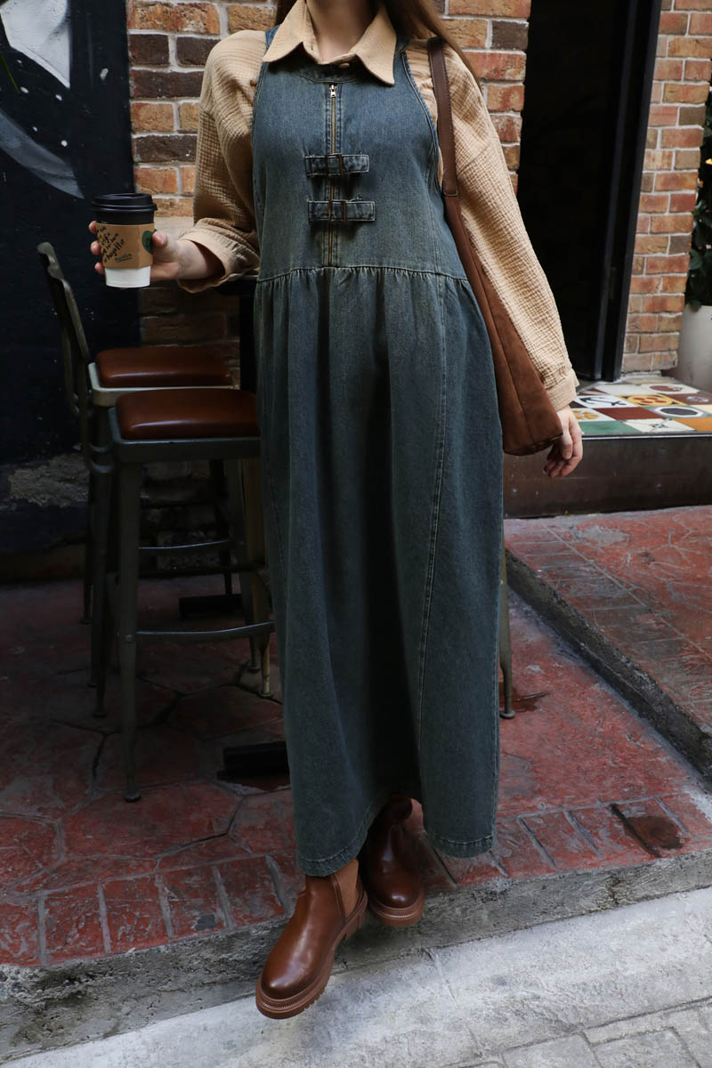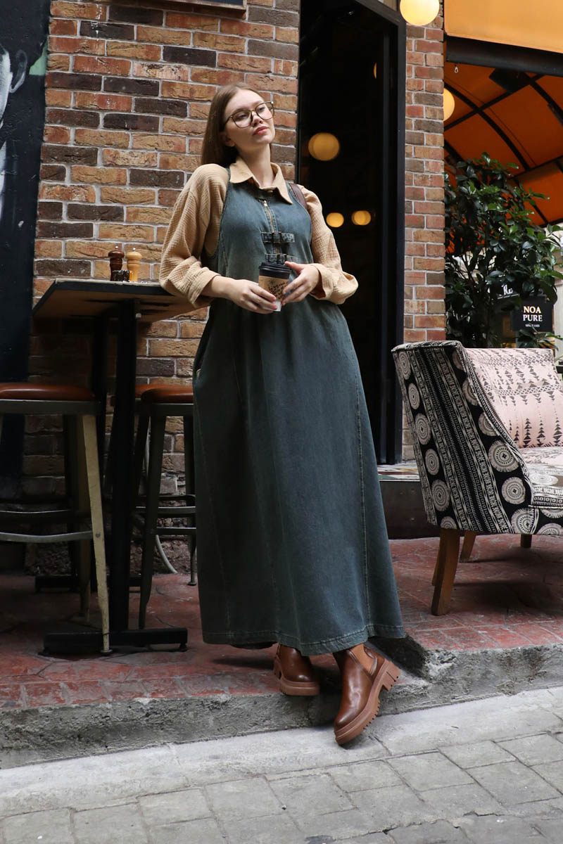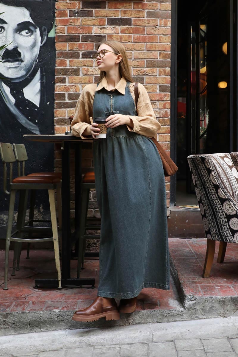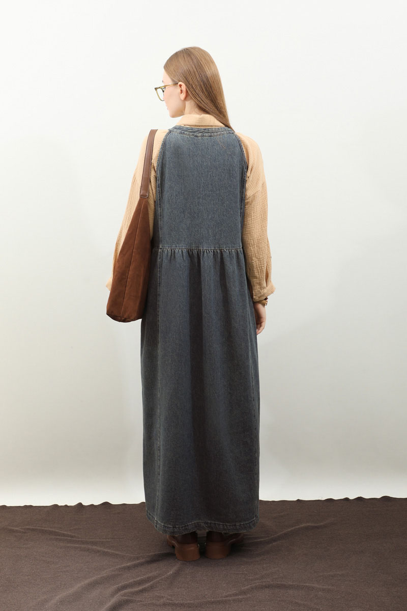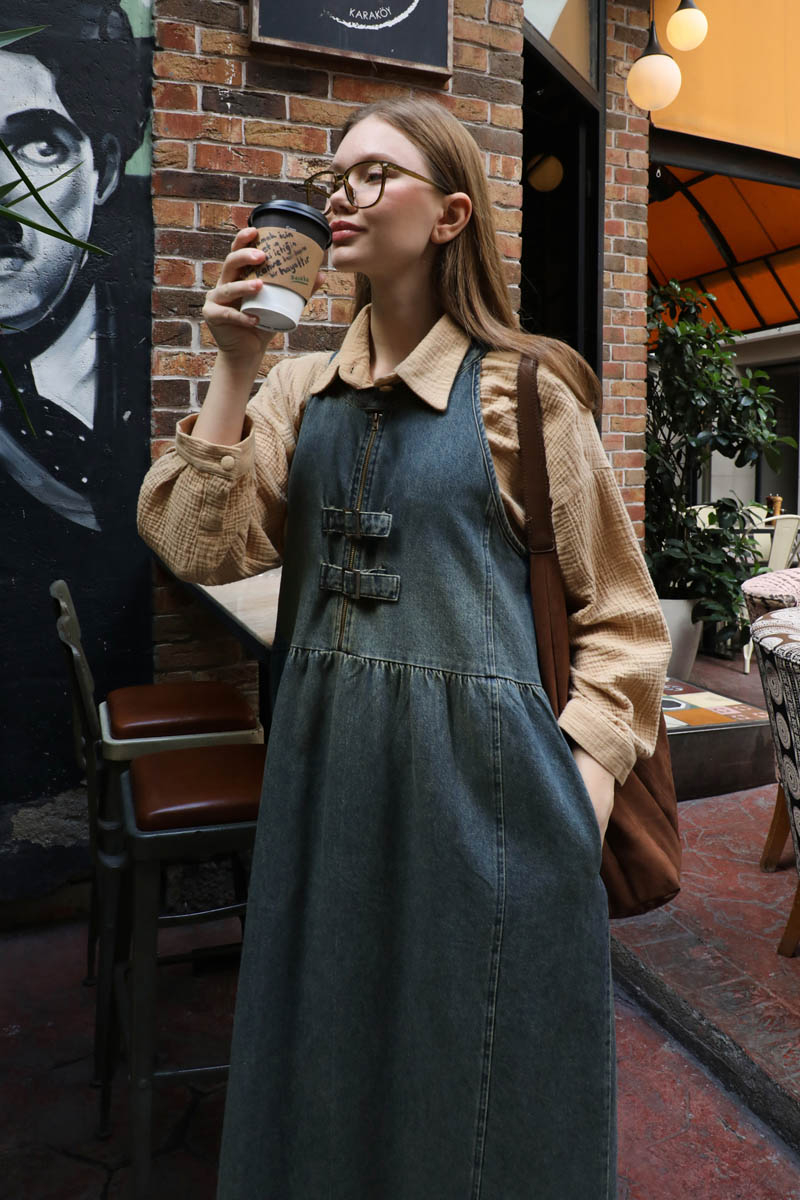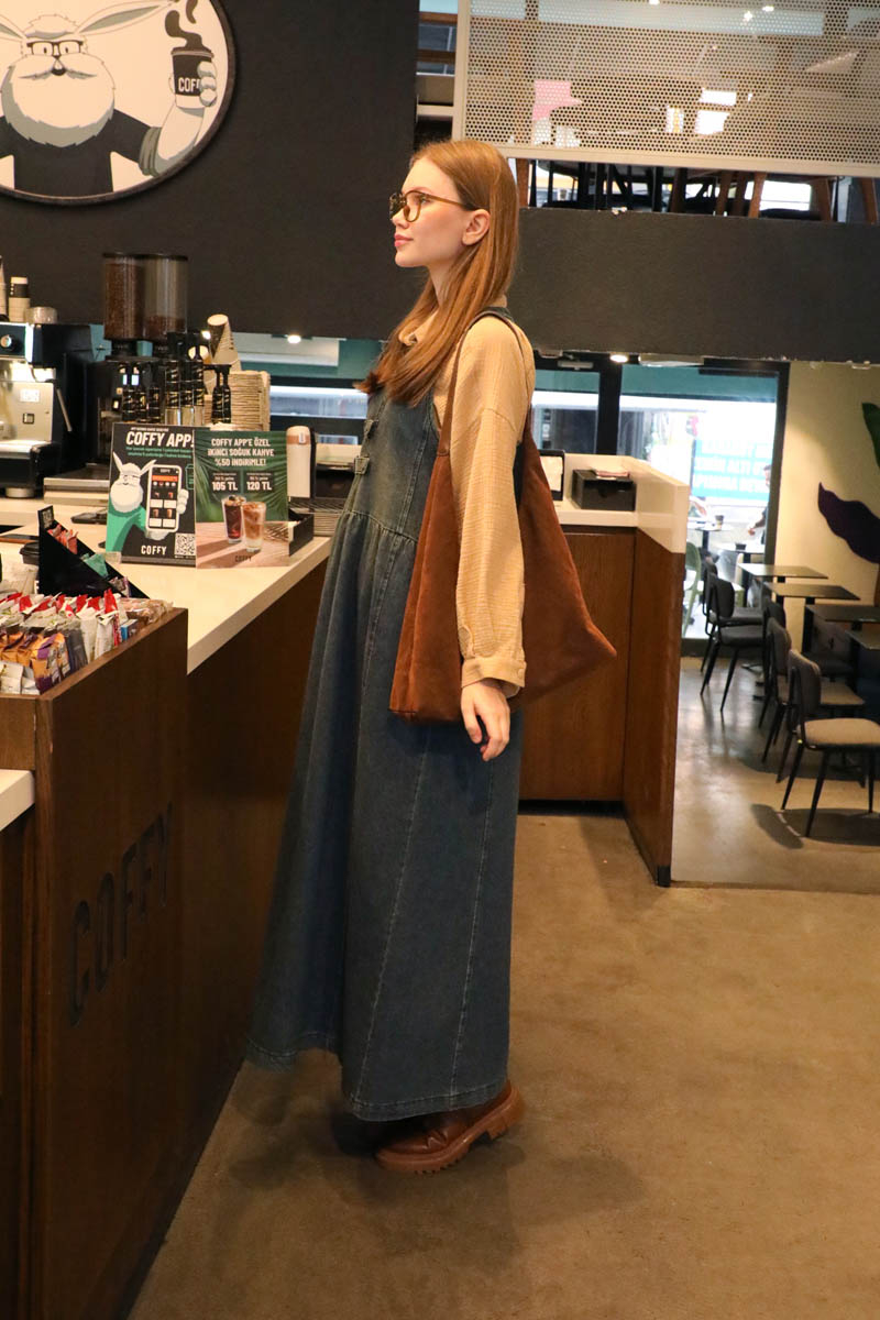 Halter Yaka Denim Jile Koyu Mavi. Halter yaka, yakası düğme detaylı, önden fermuarlı ve fermuar üzerinde 2 adet tokalı kemeri mevcuttur. Belden büzgülü, önde ve arkada dikiş detayları vardır. Yandan gizli cepli, astarsız.