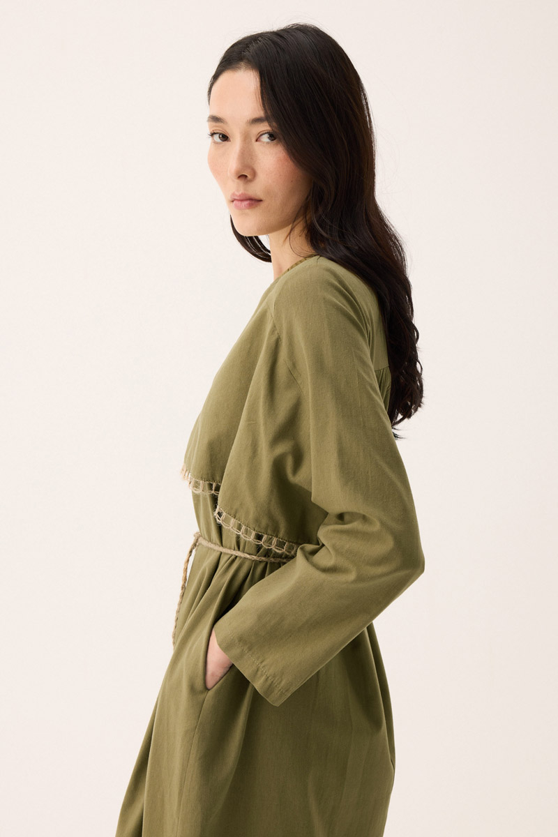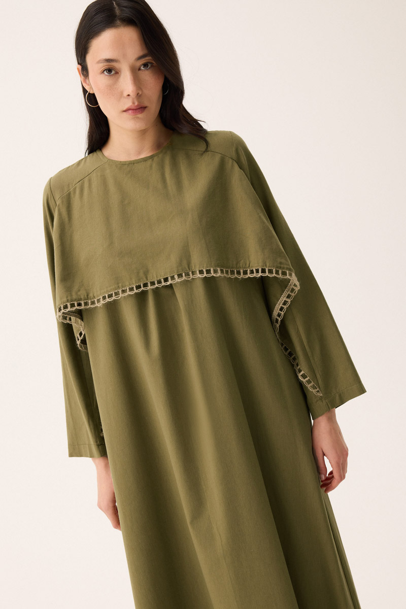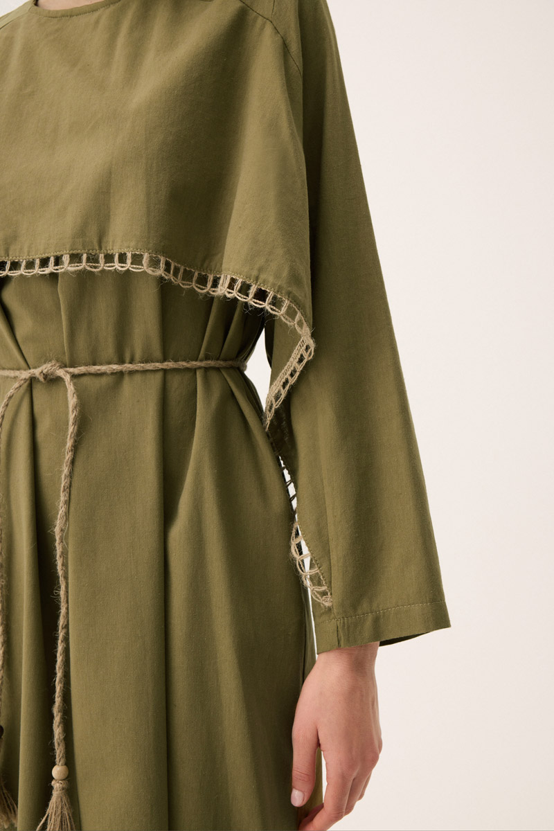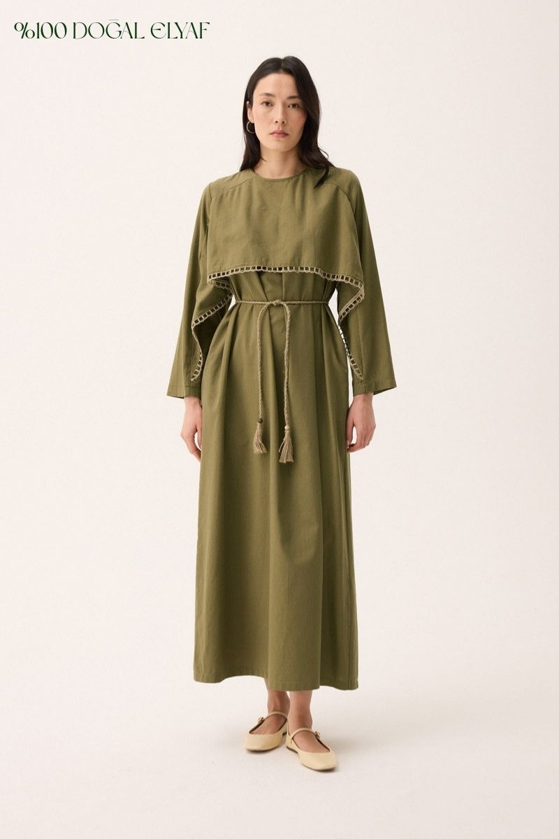 Hasır Biyeli Dilge Elbise Haki. Bisiklet yakadır, hafif reglan kolludur, önü aller ve hasır şerit detaylıdır, hasır ince biye kuşaklıdır, yandan ceplidir, astarsızdır. Günlük kullanım için uygundur.