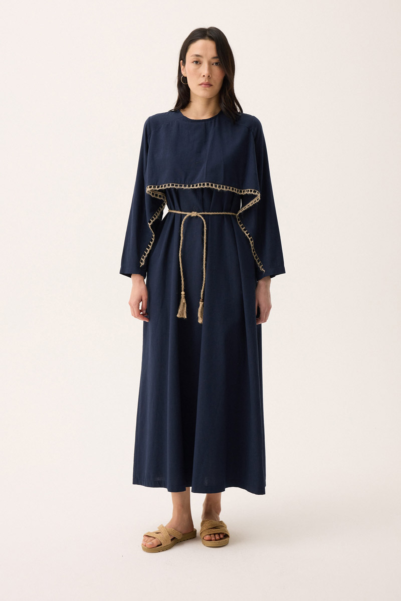 Hasır Biyeli Dilge Elbise Lacivert. Bisiklet yakadır, hafif reglan kolludur, önü aller ve hasır şerit detaylıdır, hasır ince biye kuşaklıdır, yandan ceplidir, astarsızdır. Günlük kullanım için uygundur.